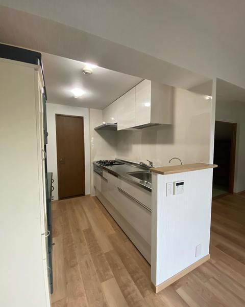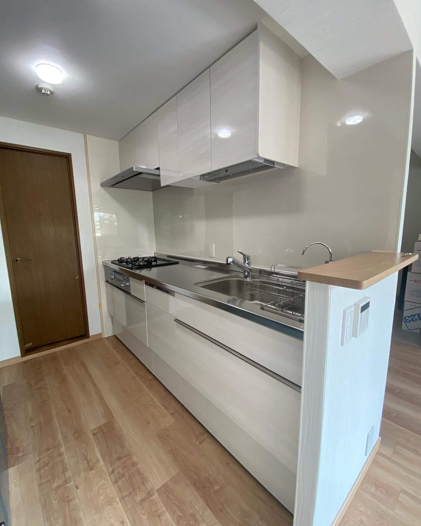 キッチン交換(LIXILシエラ)、袖壁・垂れ壁を撤去して、閉鎖された空間から明るく広く感じるキッチンに。Panasonic耐水カウンターを設置し、リビングダイニングと自然なつながりが出来ました。