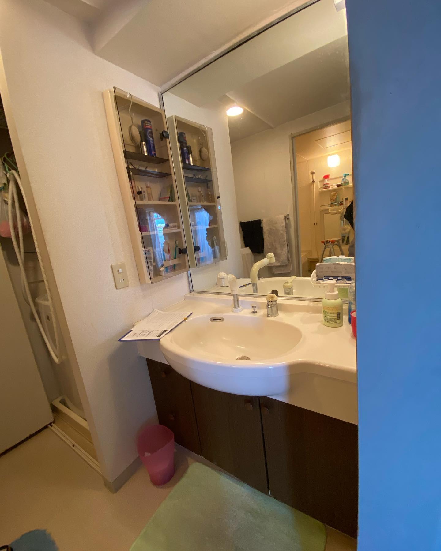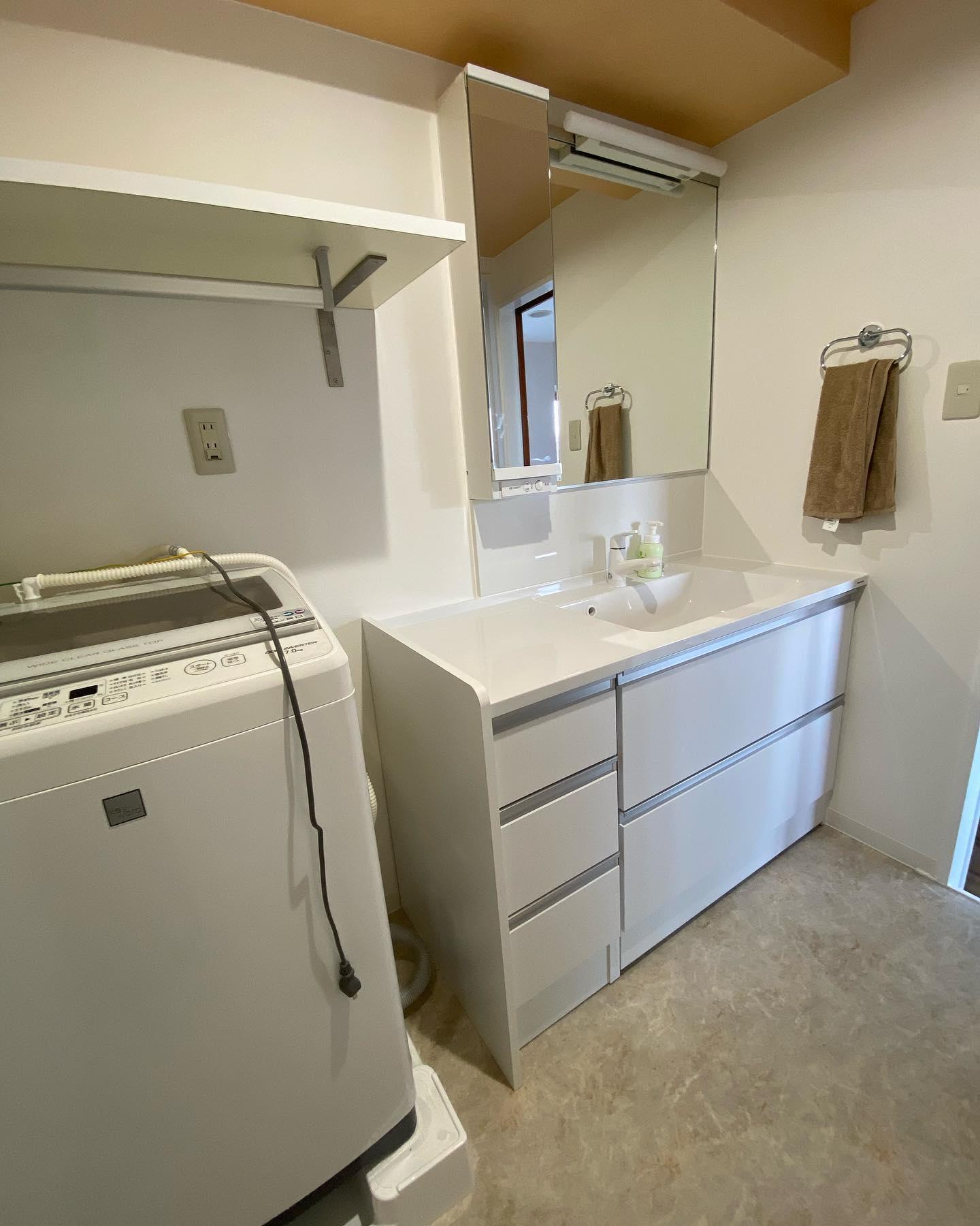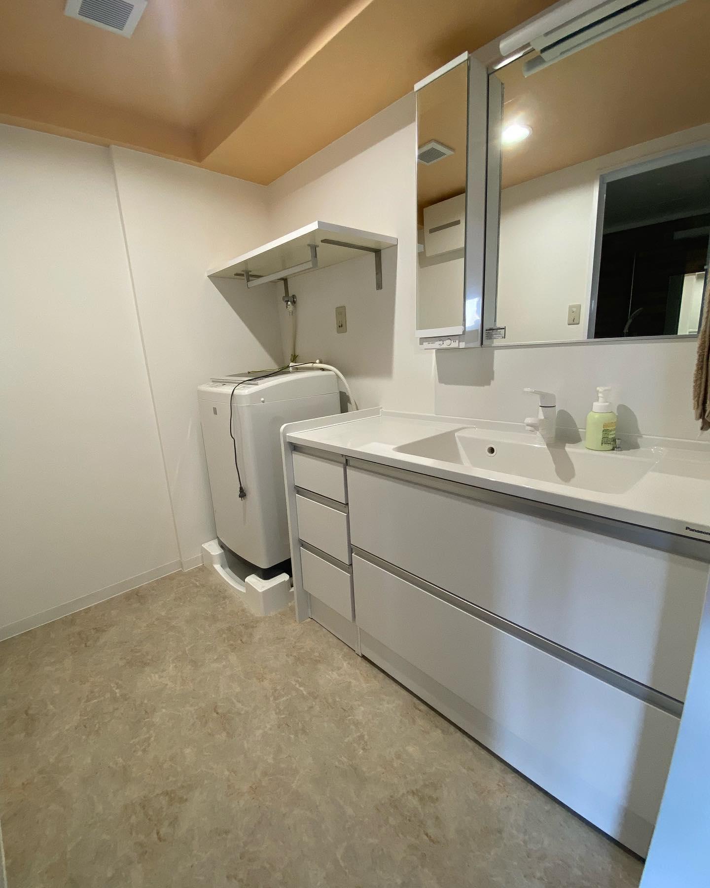 洗面台と洗濯機置き場の間にあった間仕切りを撤去し、洗面台(Panasonicシーライン)交換。 洗濯パン、洗濯水栓交換・分電盤交換。棚下、上吊りバー設置。クロス貼り替え、天井アクセントクロス。 クッションフロア貼り替え。