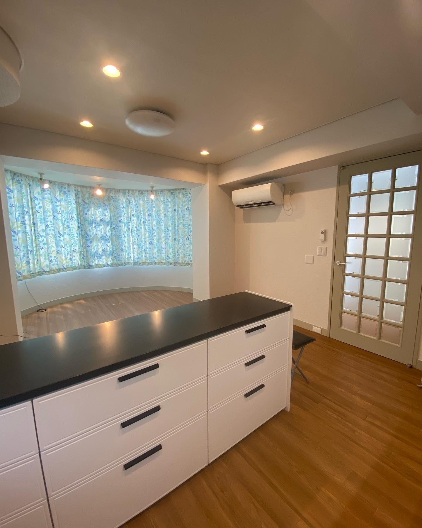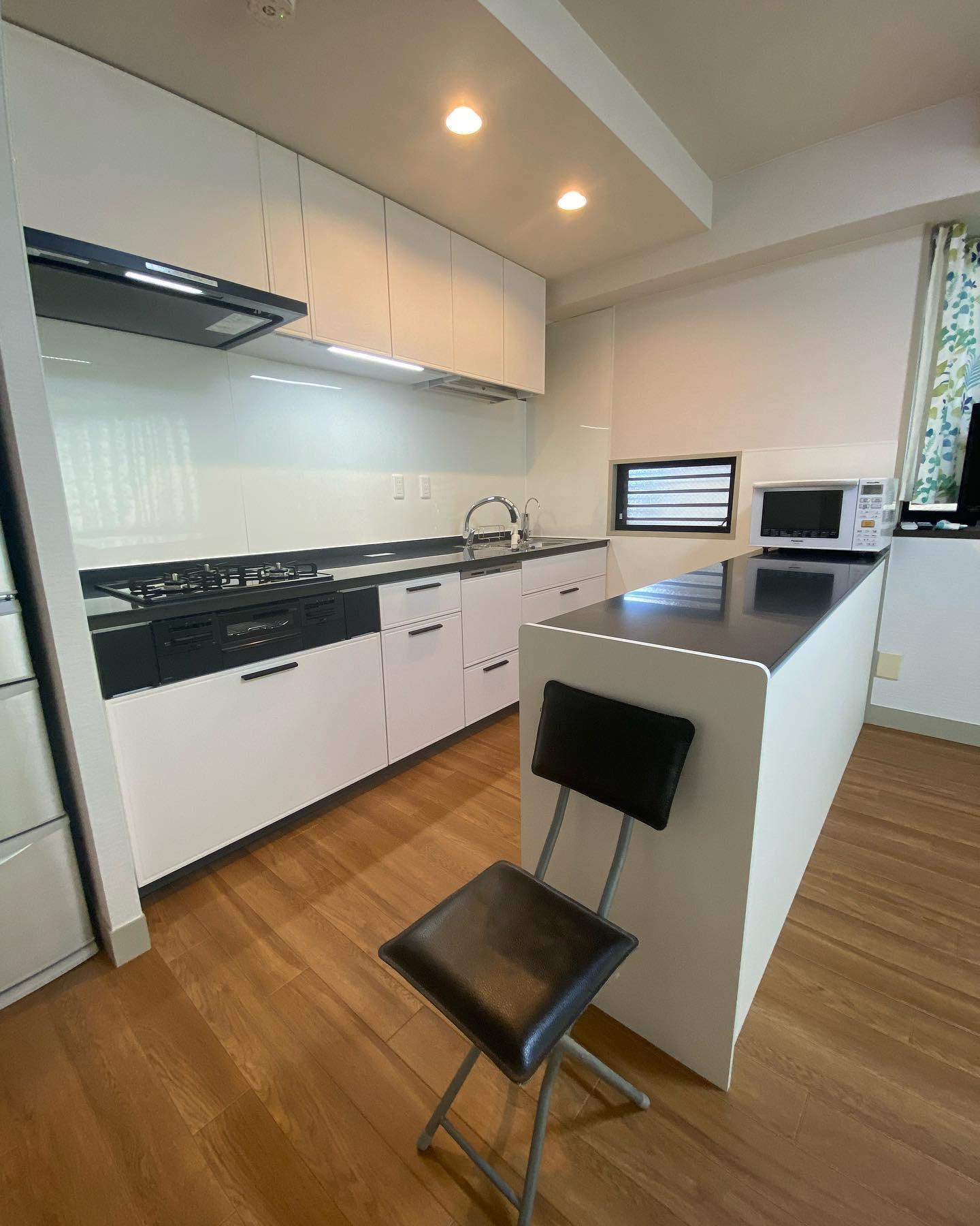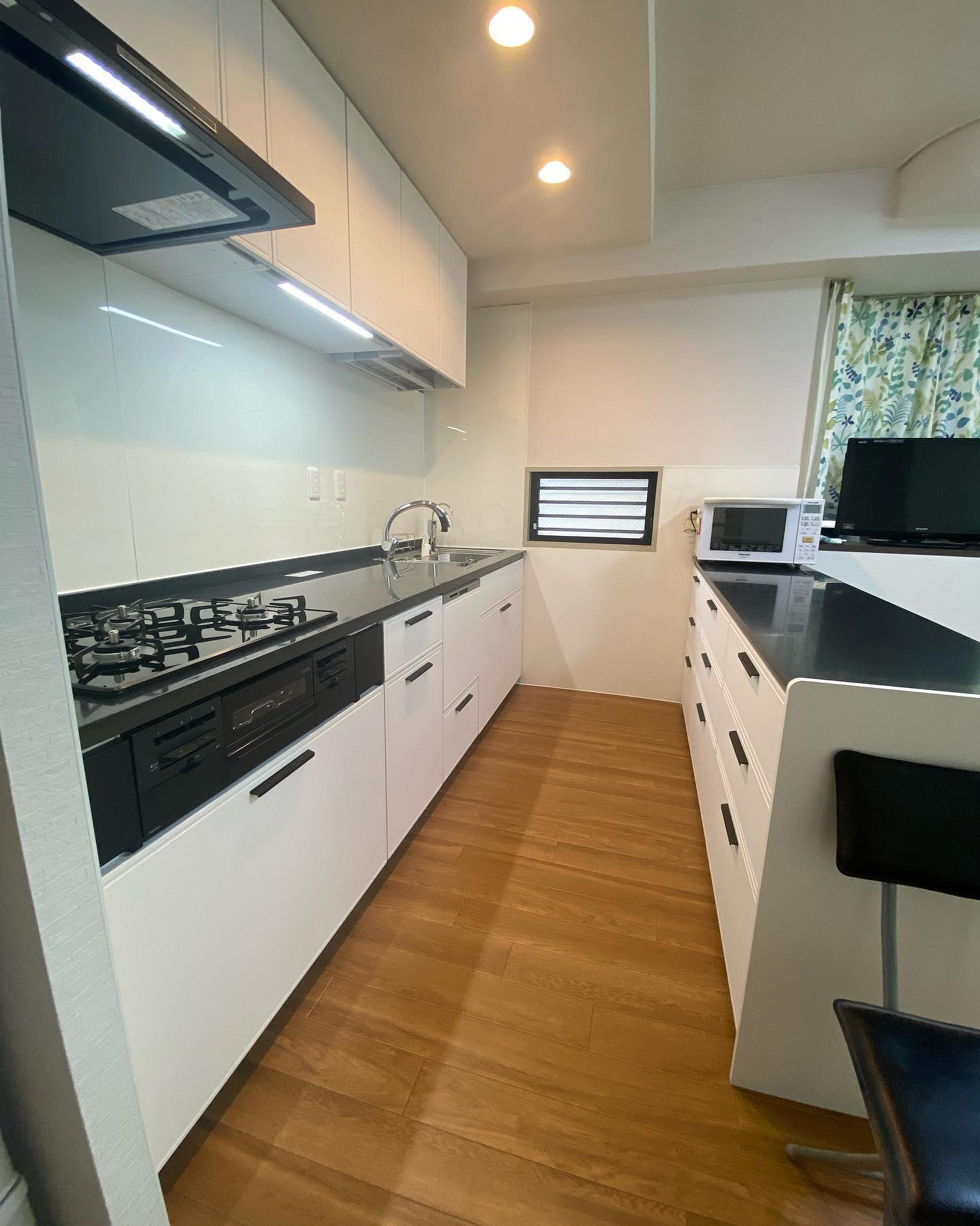 戸建のLDK全面リフォーム。 コの字型からI字型2列に、元のカップボード上の吊り戸をなくしスッキリ。天井高も一部上げて空間を広げました。 LIXILノクトでスタイリッシュなキッチンに。クッションフロアを重ね張り、クロスも貼り替えて一新。 ガスコンロ・レンジフード・食洗器・節湯水栓は、こどもみらい住宅支援事業補助金対象工事です。