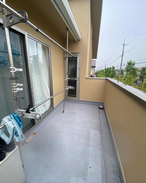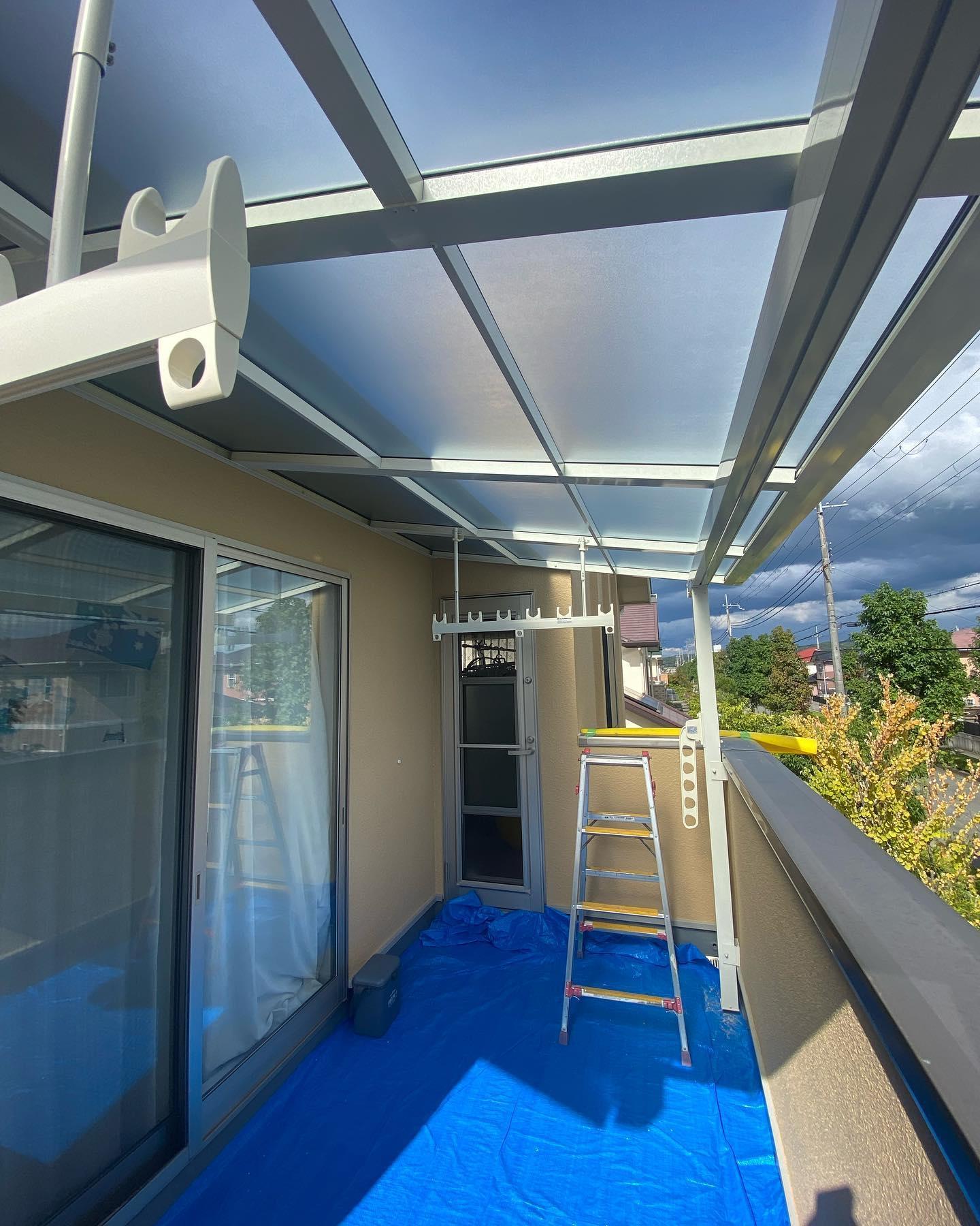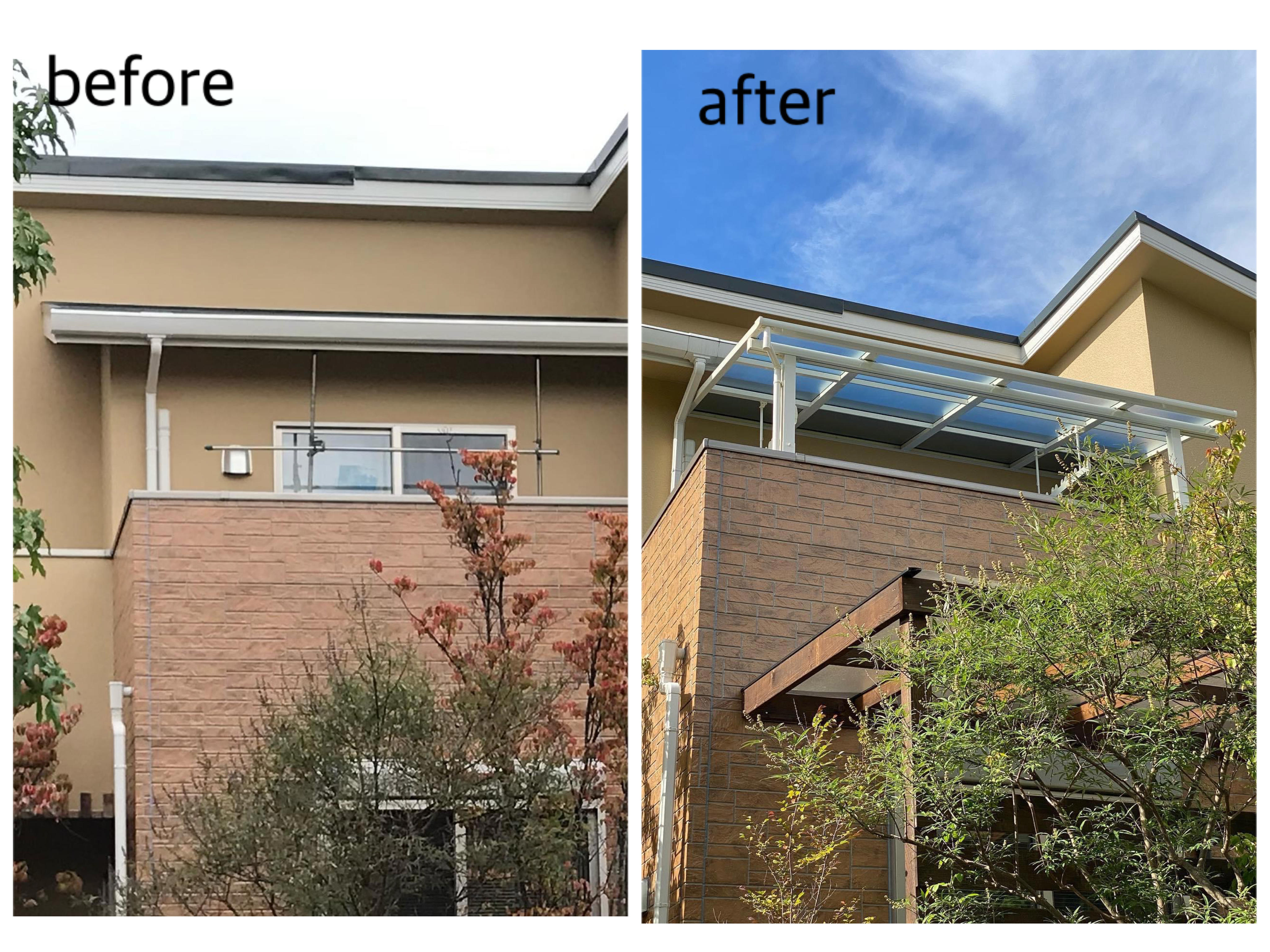 戸建のベランダにテラス屋根(LIXILスピーネF)を設置。 屋根と支柱に物干しバーが付いて、干せる量も倍増! 1日の工事で、もう急な雨に慌てる必要はありません。