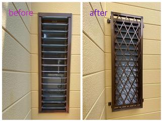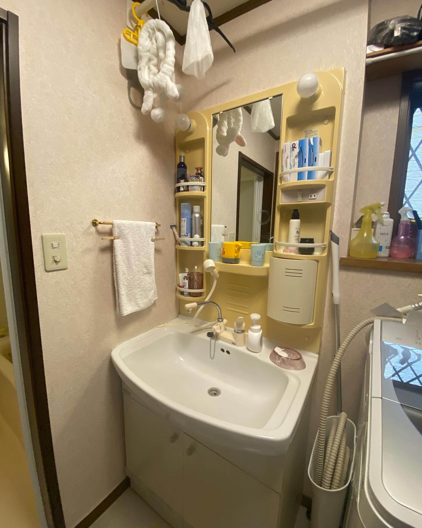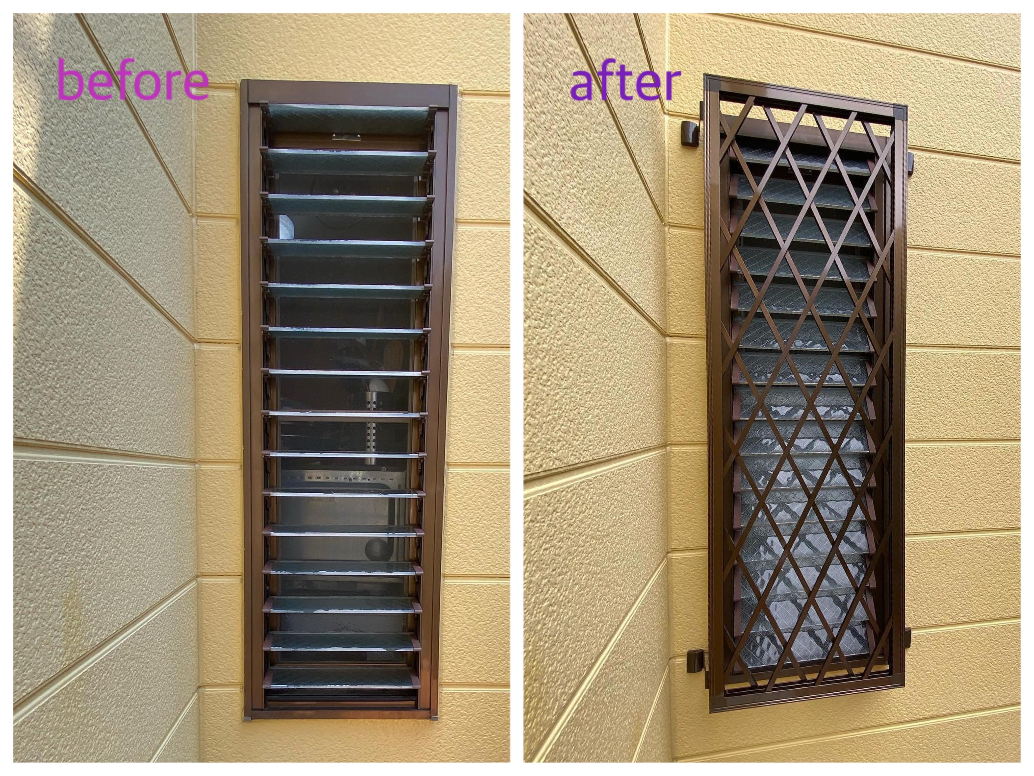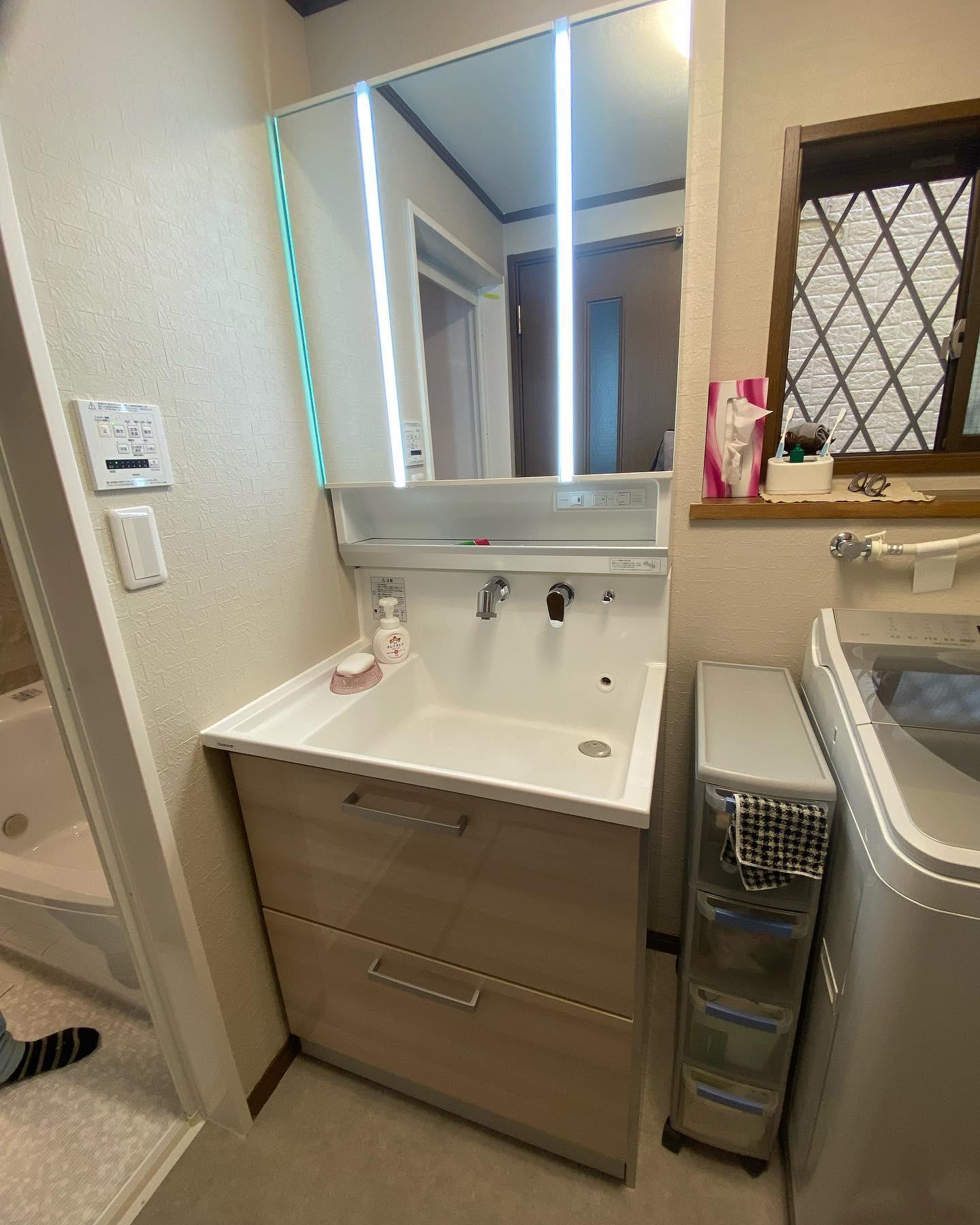 戸建の洗面化粧台交換(クリナップ洗面台S)、クッションフロア・クロスを貼り替え。 外窓に面格子を設置し防犯性も向上しました。