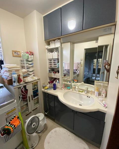 洗面化粧台交換(LIXILルミシス950) 幅をサイズダウンしたスペースに(LIXILピアラ)トール収納300を設置。 スッキリ無駄なく収納を確保しました。 壁面はエコカラット(カームウッドグレー)で調湿・脱臭効果をプラス。 タッチレス水栓は手を触れずに吐水、水栓周りに水が溜まらず清潔。 クロス・床クッションフロアを貼り替え。