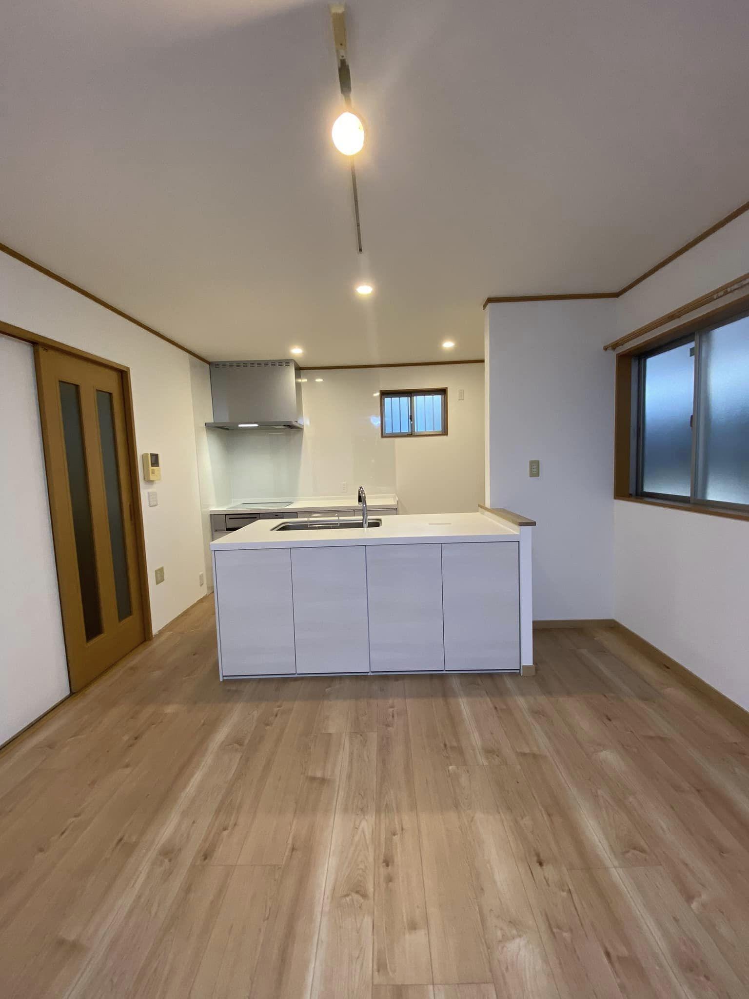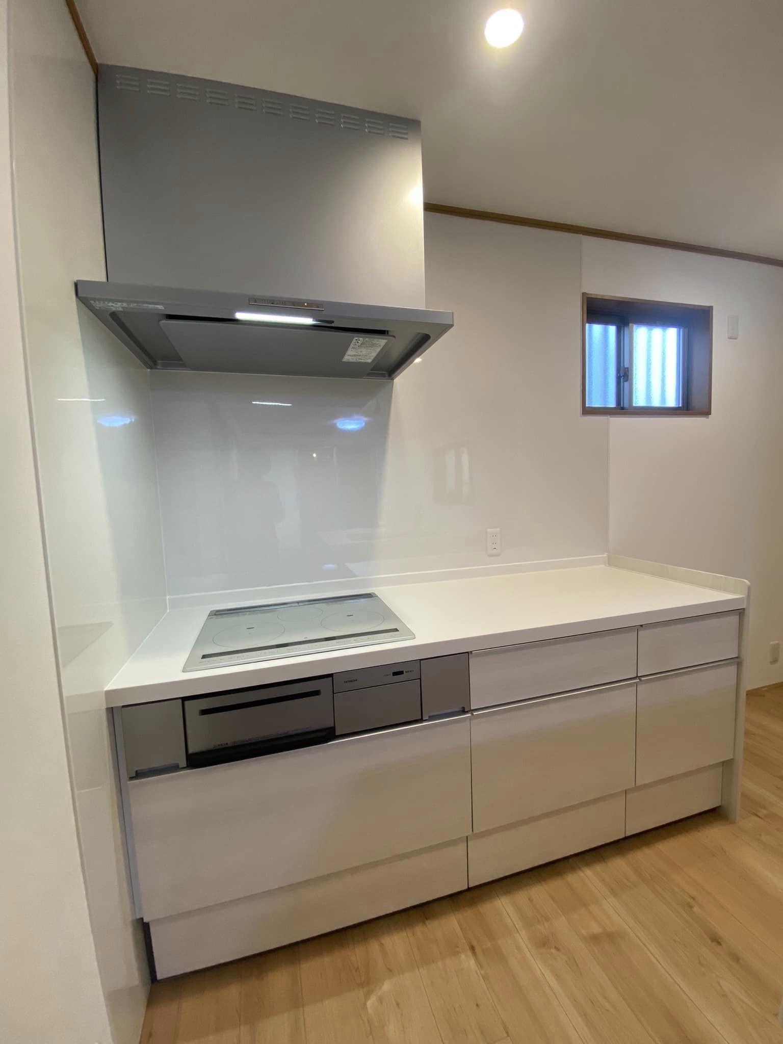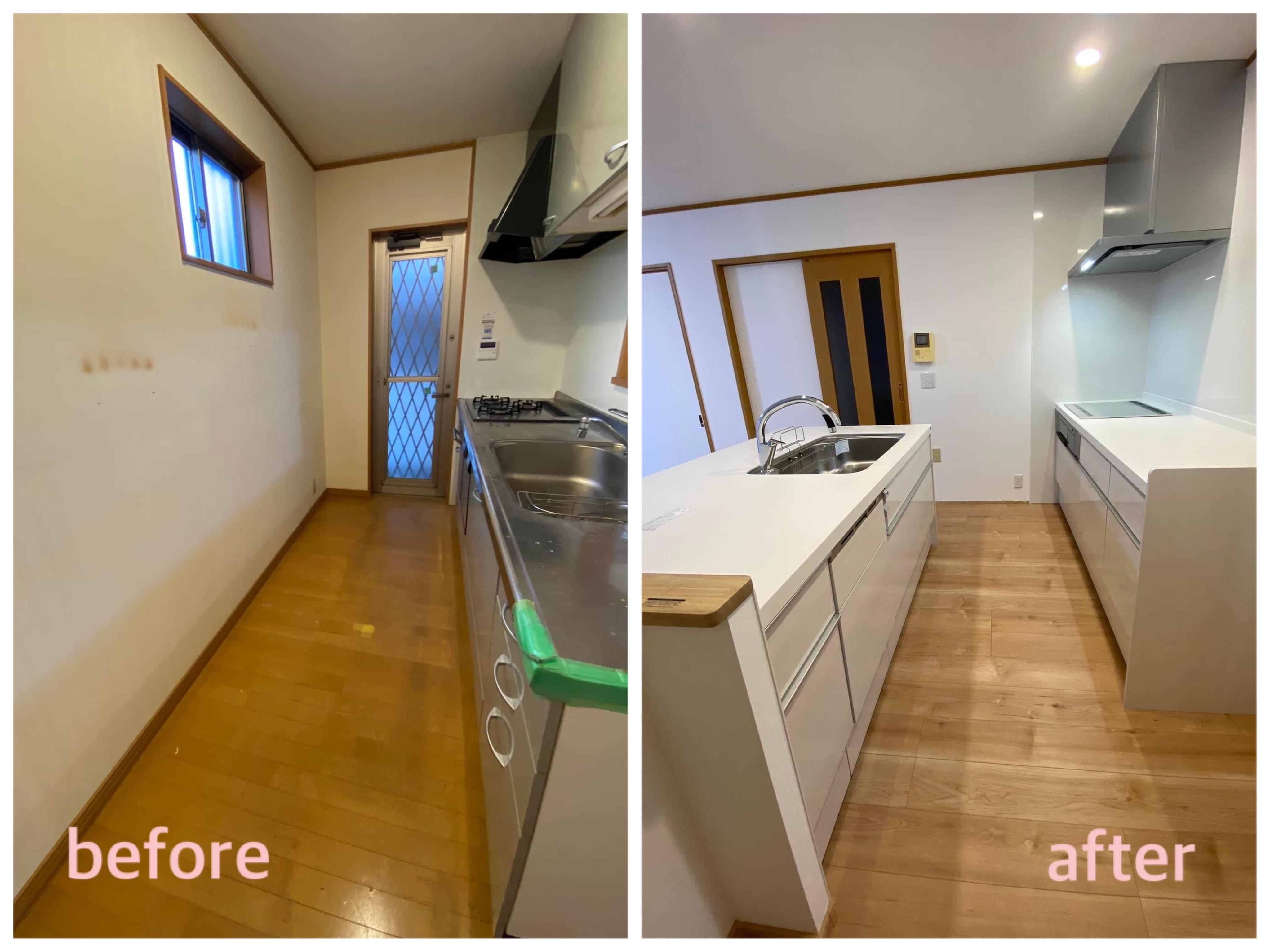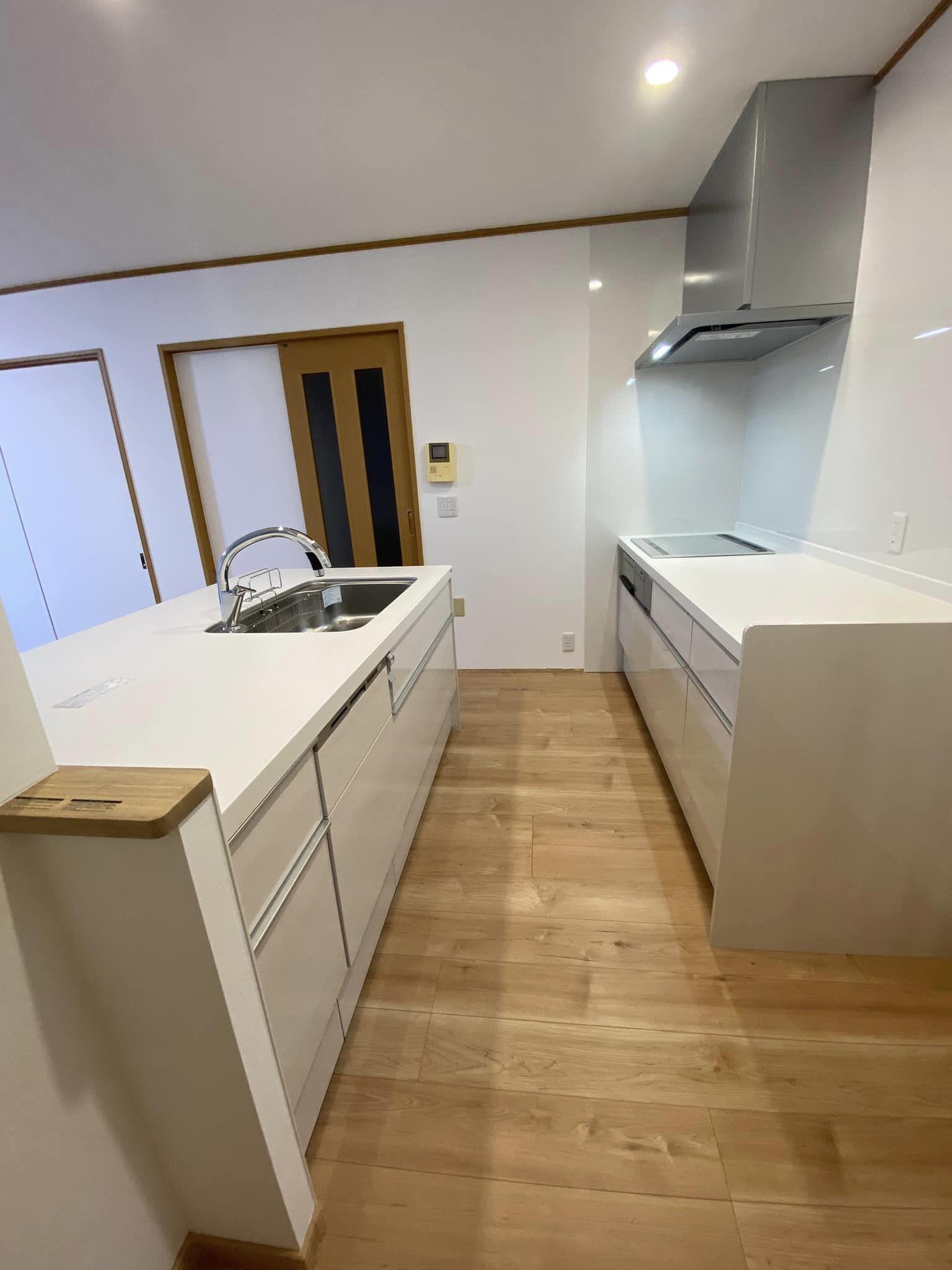 対面キッチンから並列に配置を変更。 垂れ壁・吊戸棚・カウンターを撤去して開放的なオープンキッチンに! LIXILキッチンシエラ、オート水栓ナビッシュ使用。 リビングダイニングとの一体感を感じながら、調理から配膳までスムーズな動線が生まれます。