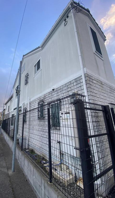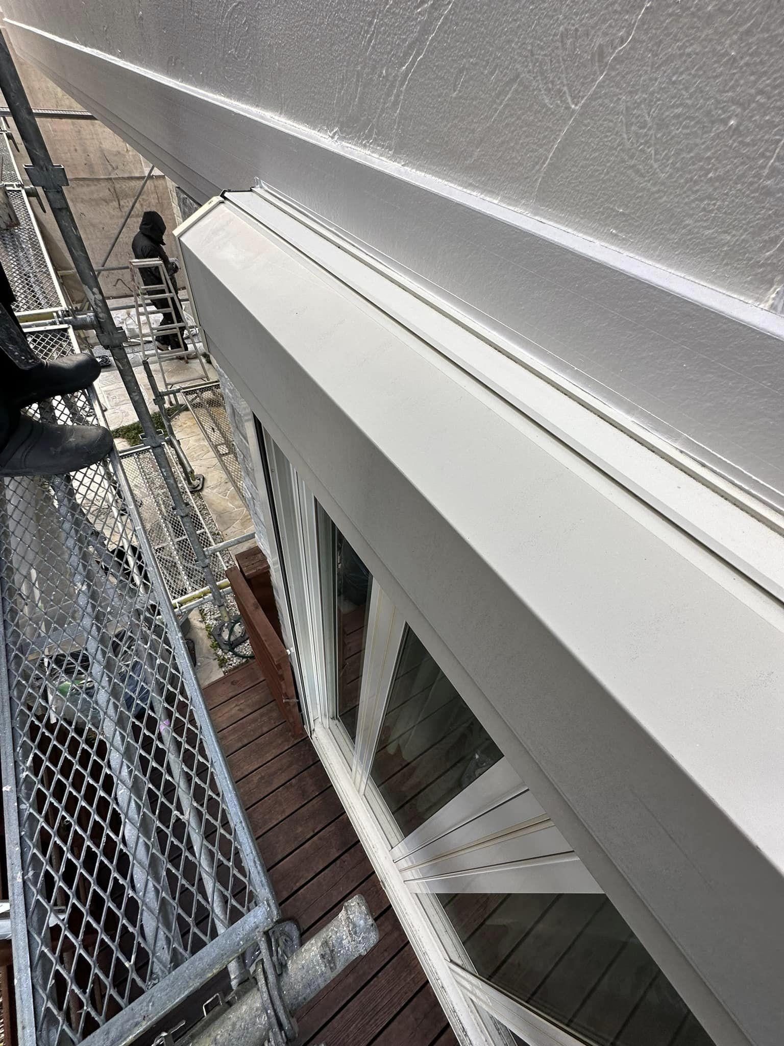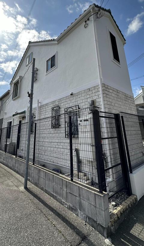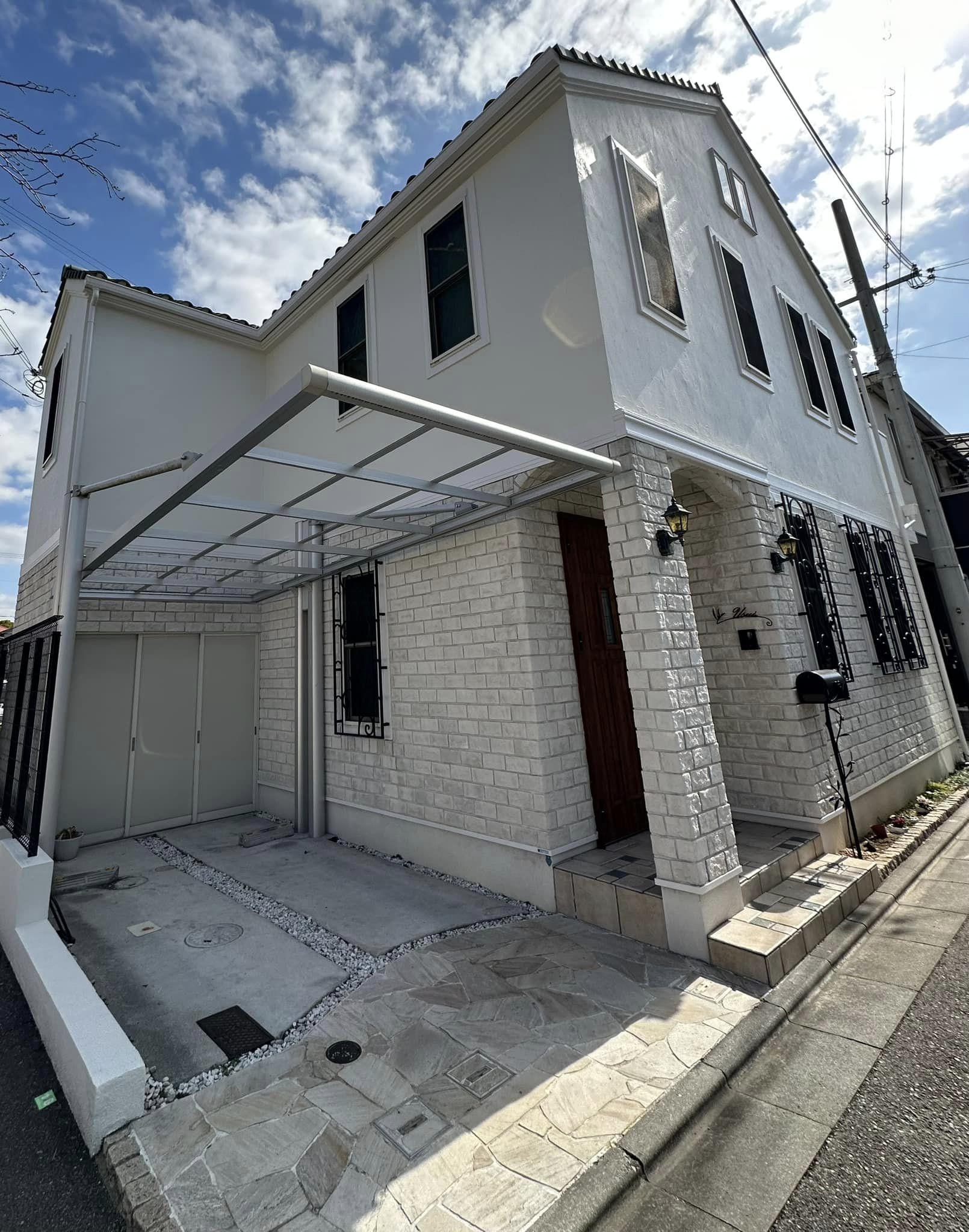 戸建の外壁塗装。 1階はタイルレンガクリア撥水塗装、2階3階は艶塗装を施して真っ白にお色直し。 電動シャッター(LIXILリフォームシャッター)を2か所設置しました。