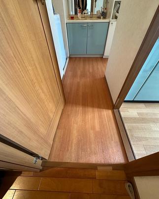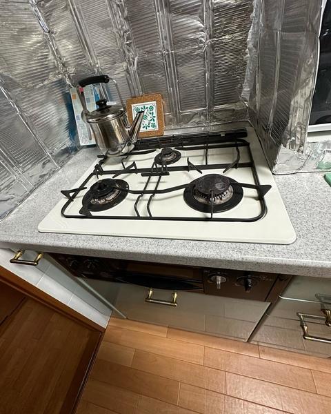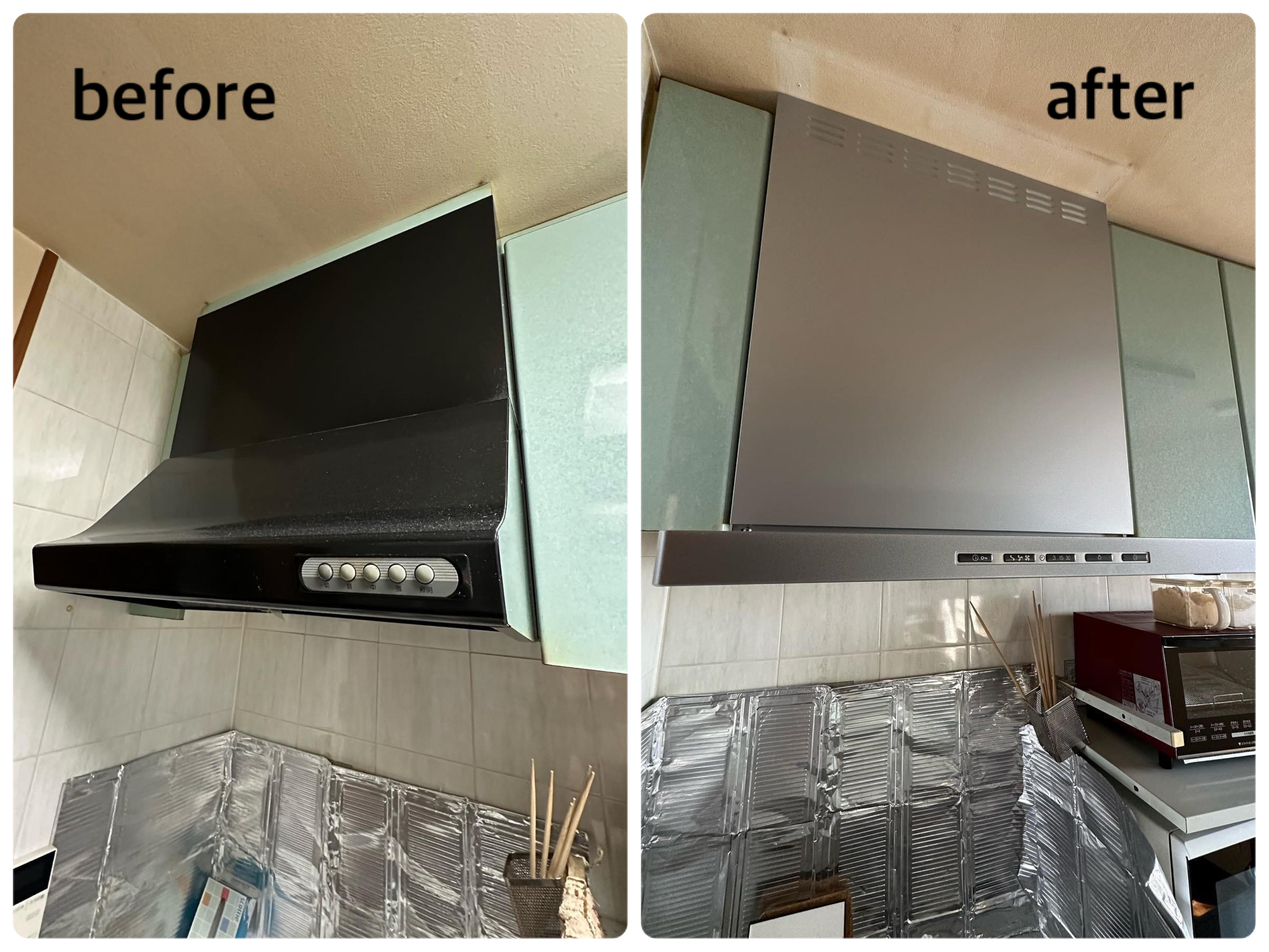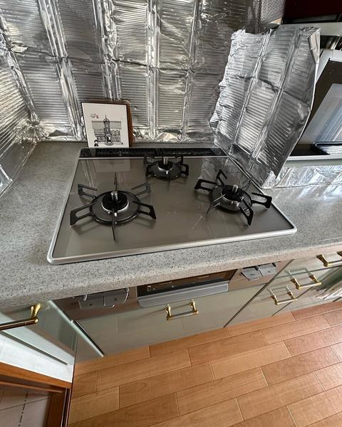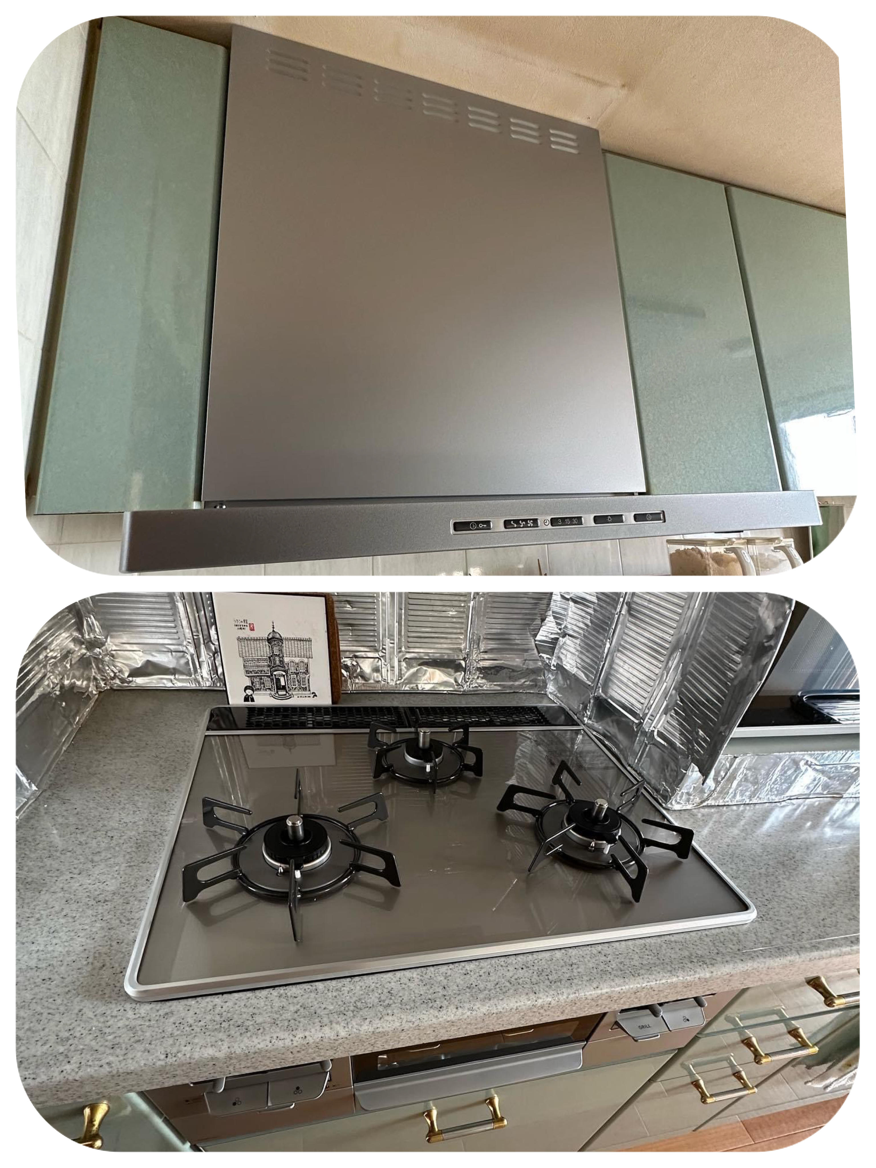 レンジフード(LIXILシロッコLER)とコンロ(リンナイ)交換 お手入れしやすく、コンロ使用と連動してファンが作動します 洗面所のクッションフロアも貼り替えました