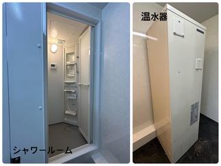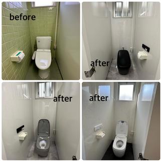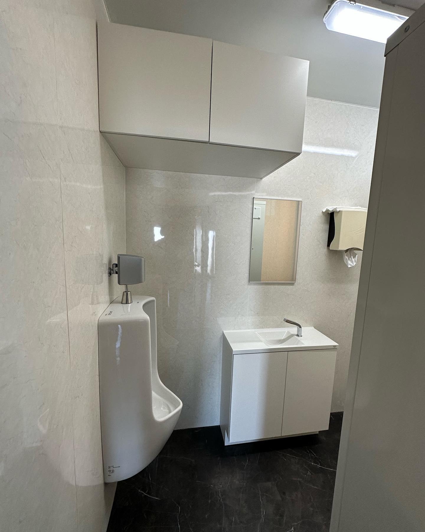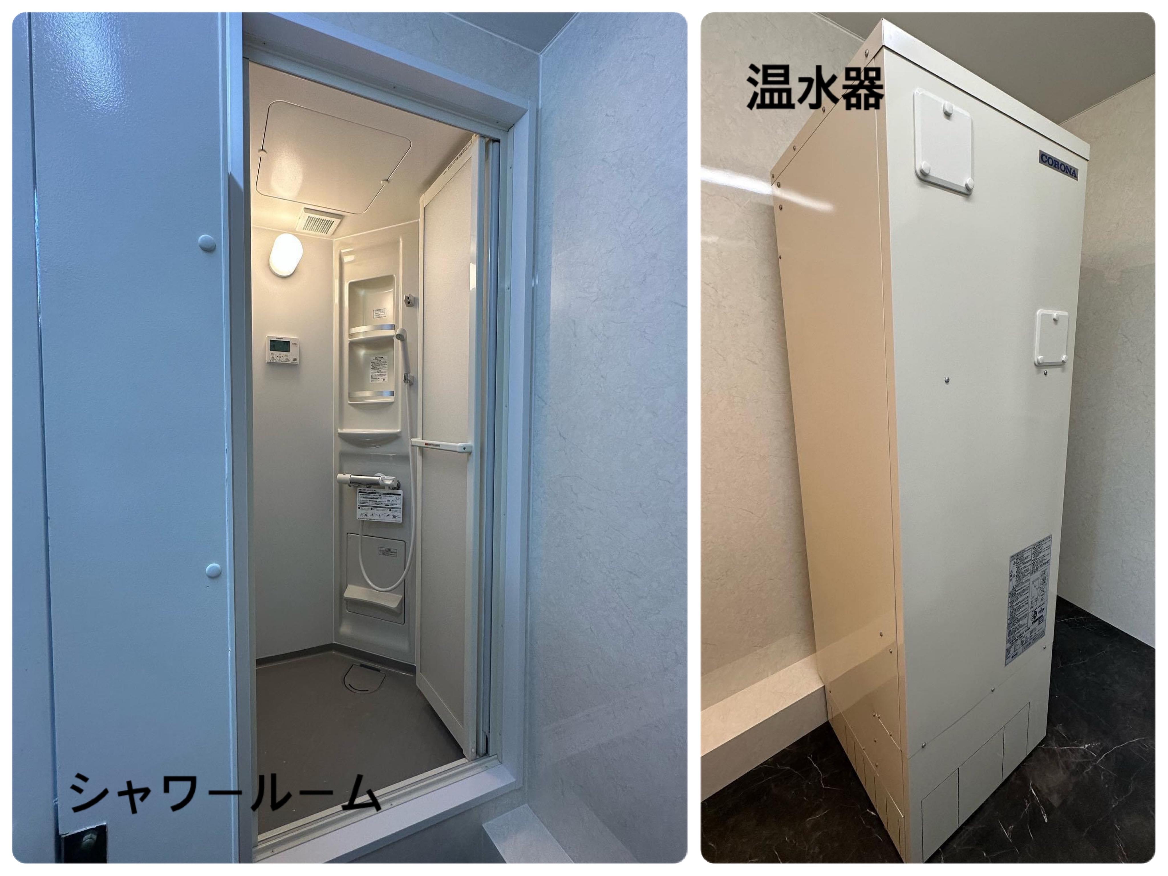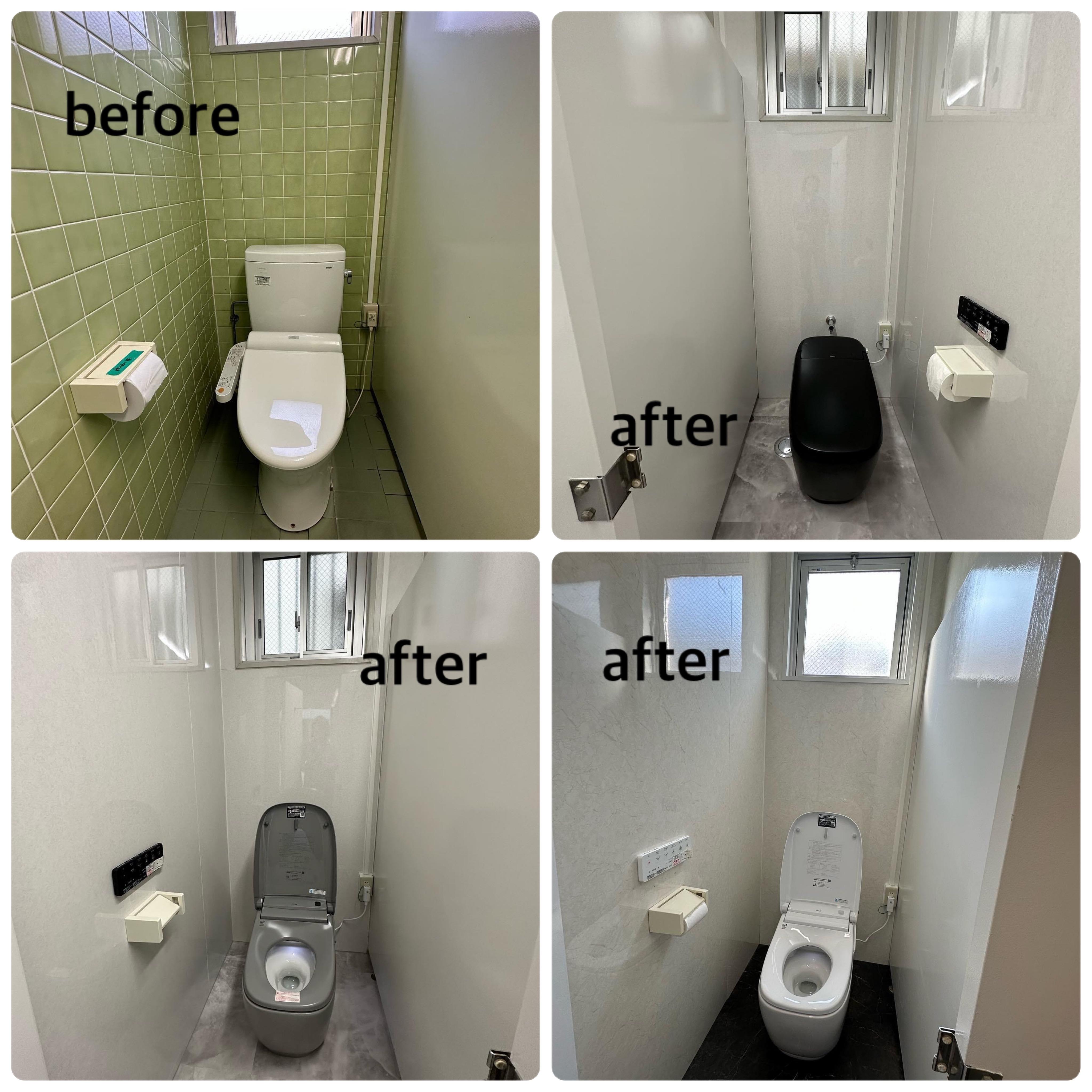 商業施設のリフォーム トイレの壁タイル張りからパネル張り(AICAタフウォールS)に、床のタイルはサンゲツフロアタイルに。温水器(コロナL温水器)を設置しシャワールームを新設(LIXILシャワーユニット)各トイレの窓を外窓交換(YKKマドリモ)して断熱効果を発揮。