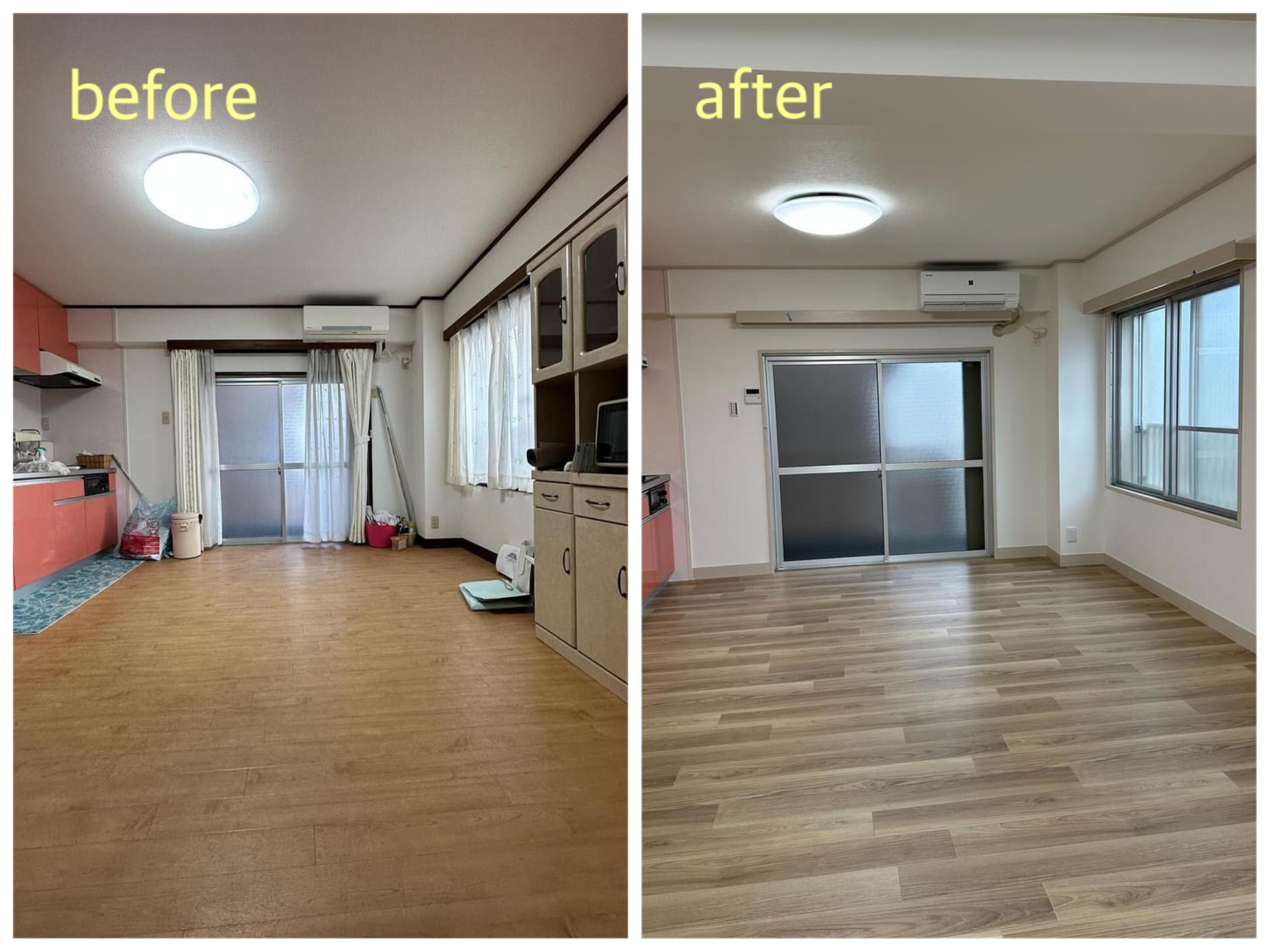 キッチン洋室をLDKに。間仕切り撤去、床張り替え・クロス貼り替え、木部塗装