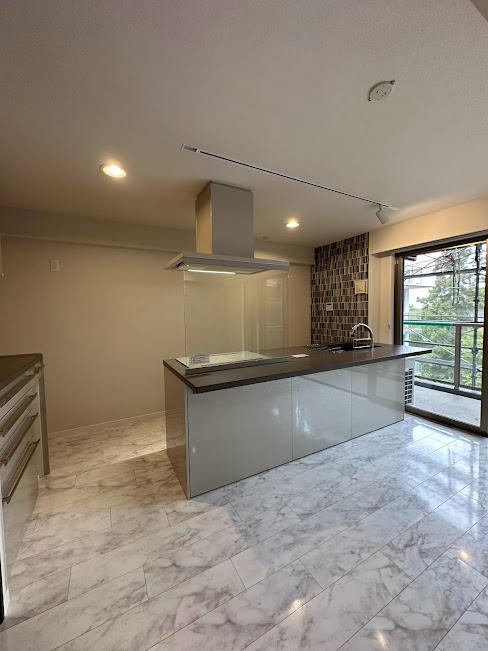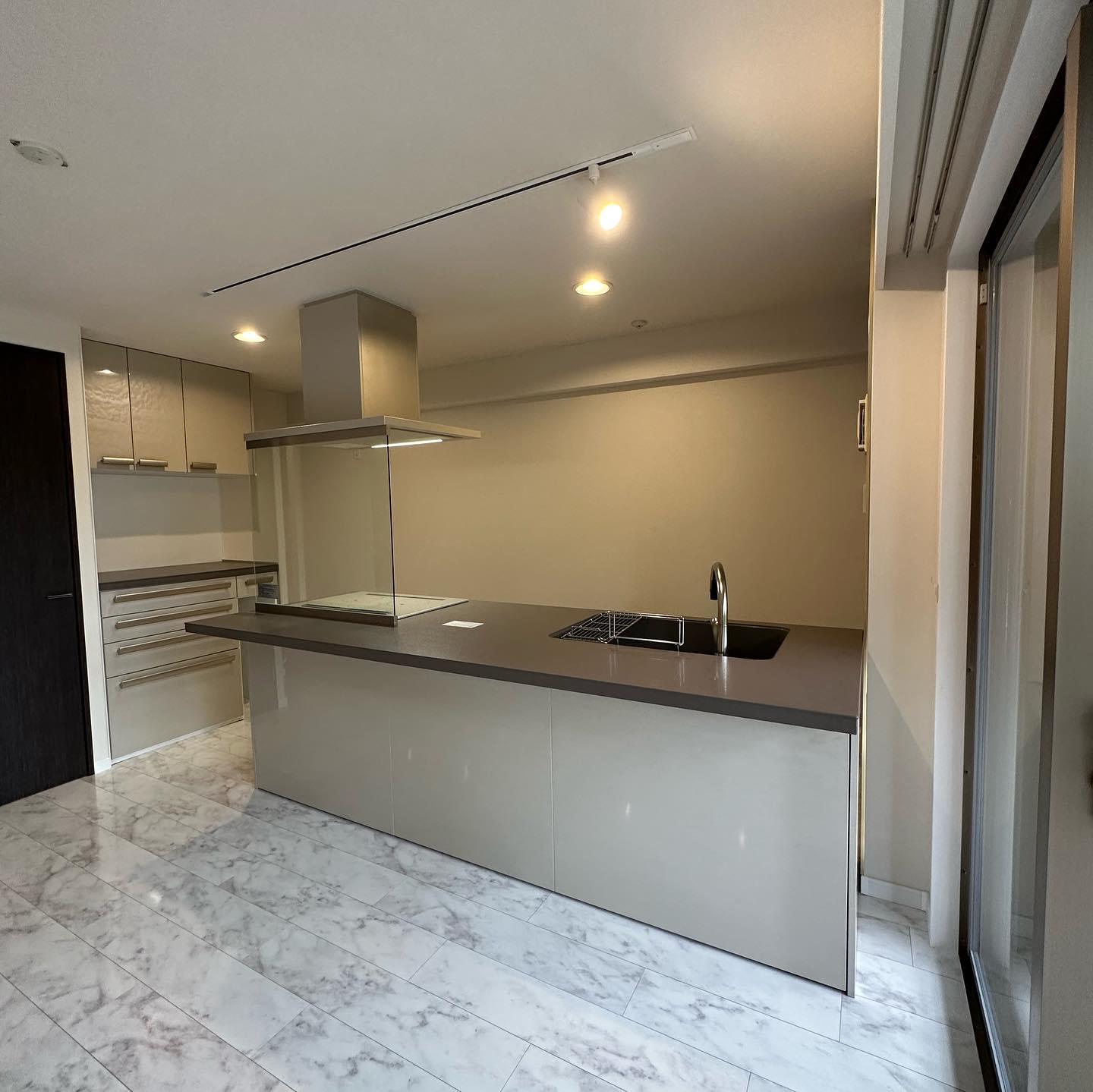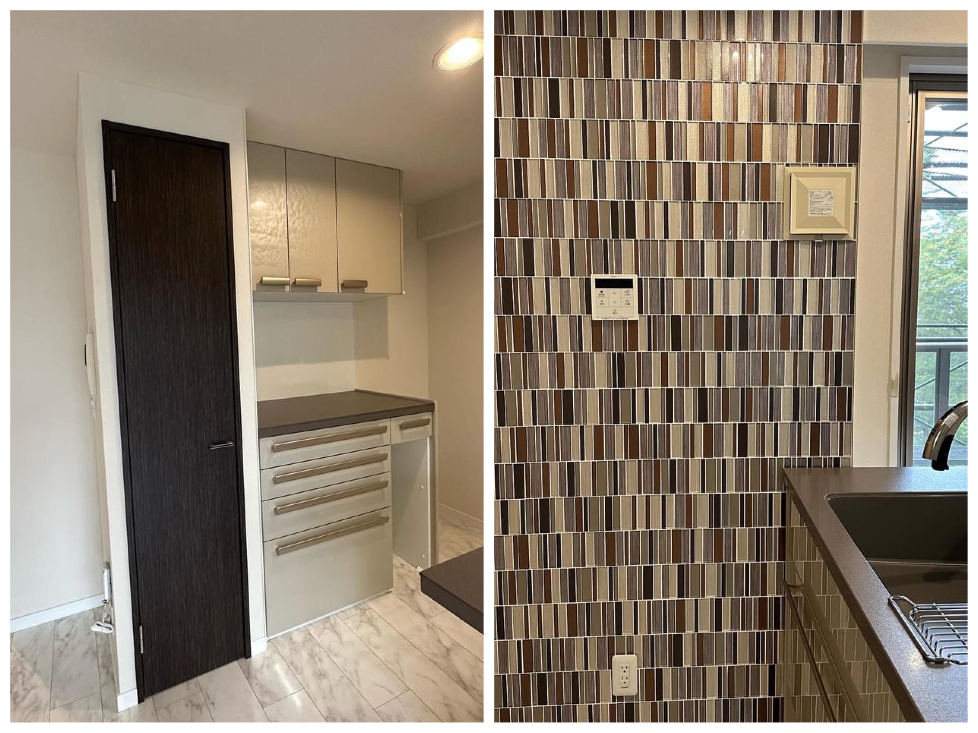 元のキッチン位置にカップボード・収納・冷蔵庫スペースを配し正面の壁はスッキリ。シンク横、ガラスモザイクのアクセントタイルが美しく映えます。