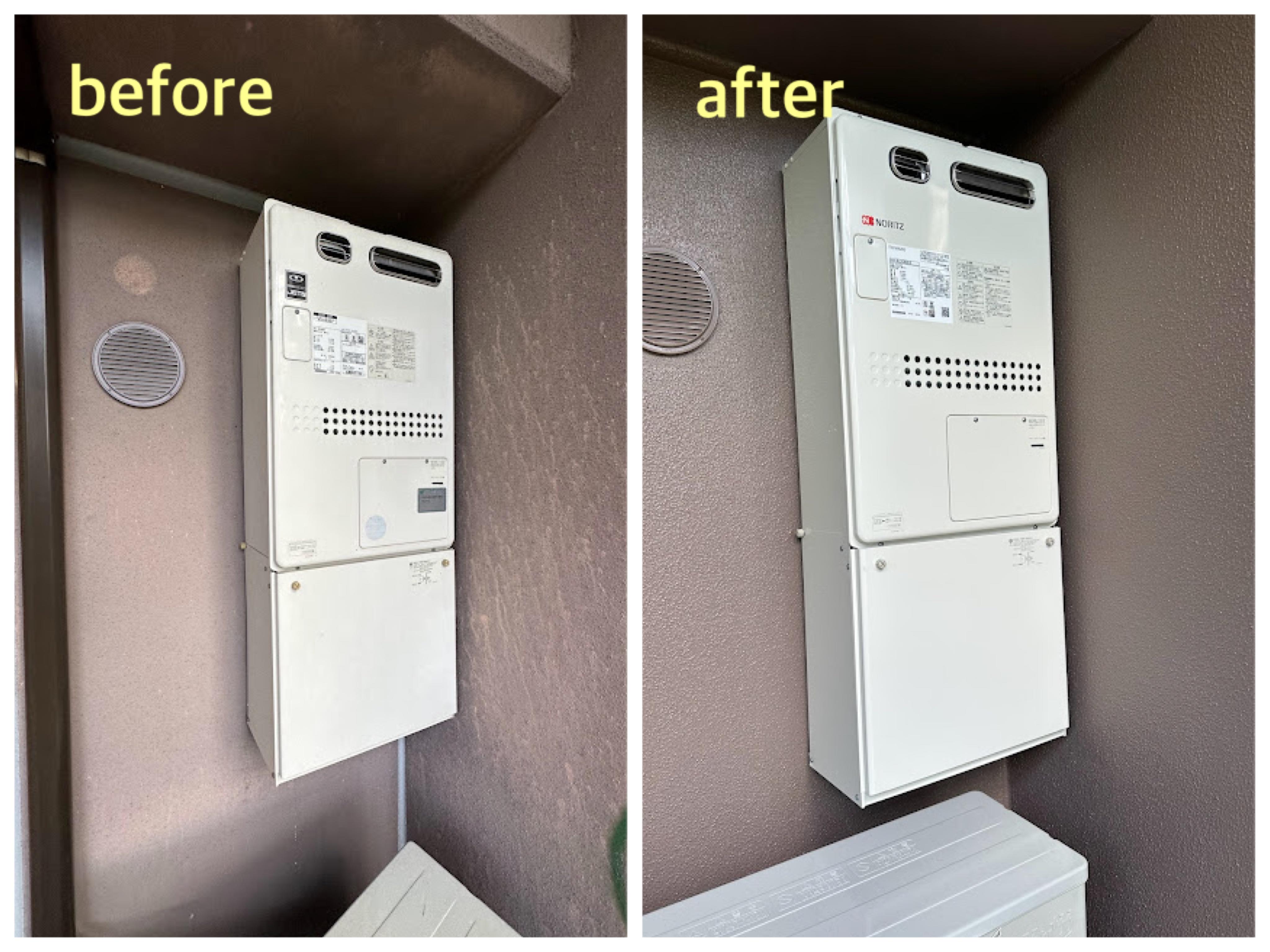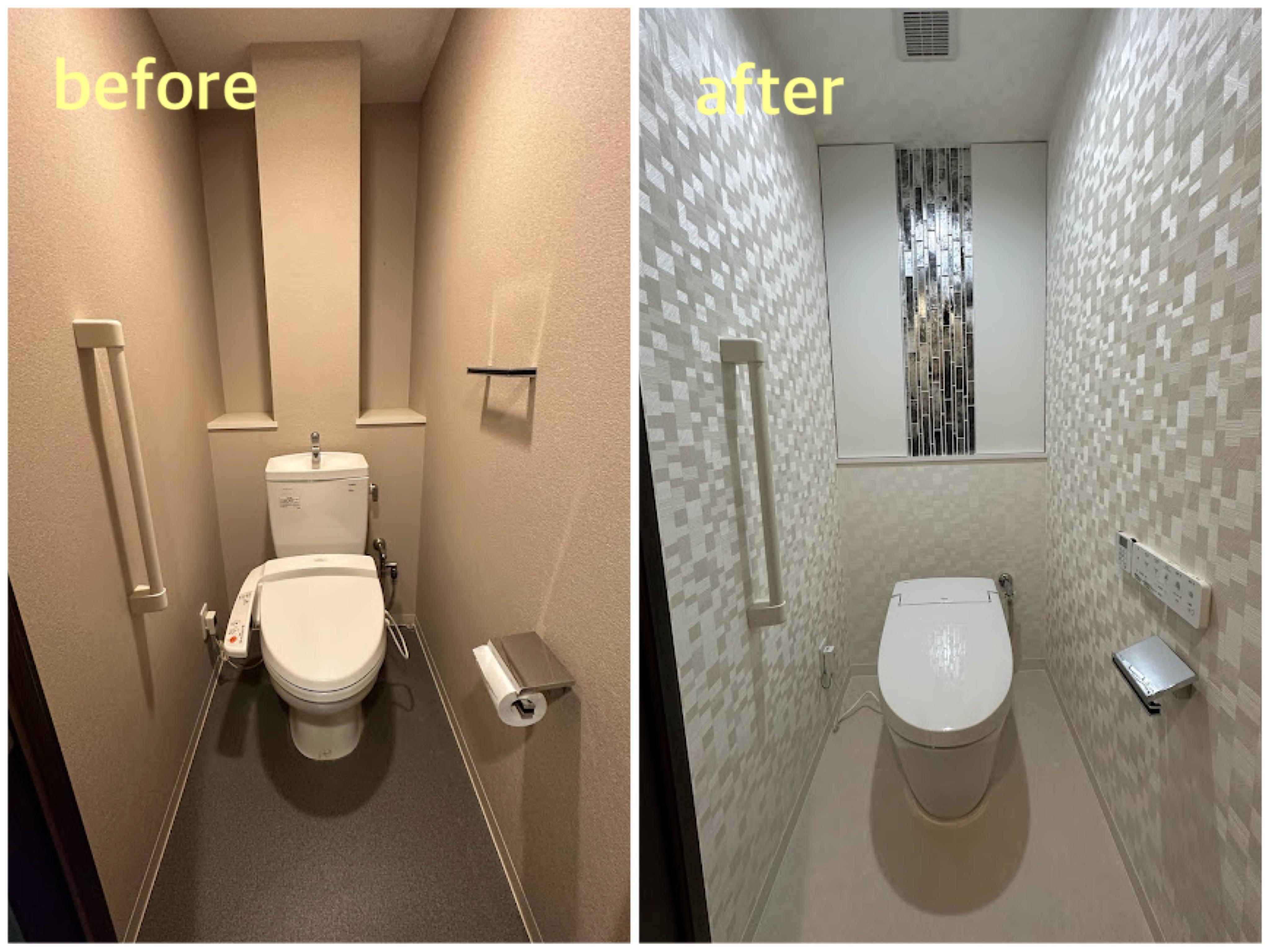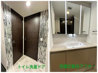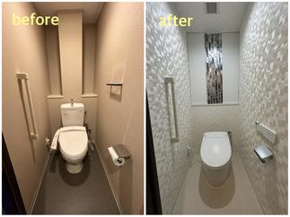 トイレ交換(LIXILサティスS)トイレ内部と洗面、両ドアサイドにも美しいガラスモザイクタイルを施しています。給湯器交換(ノーリツ暖房給湯器)