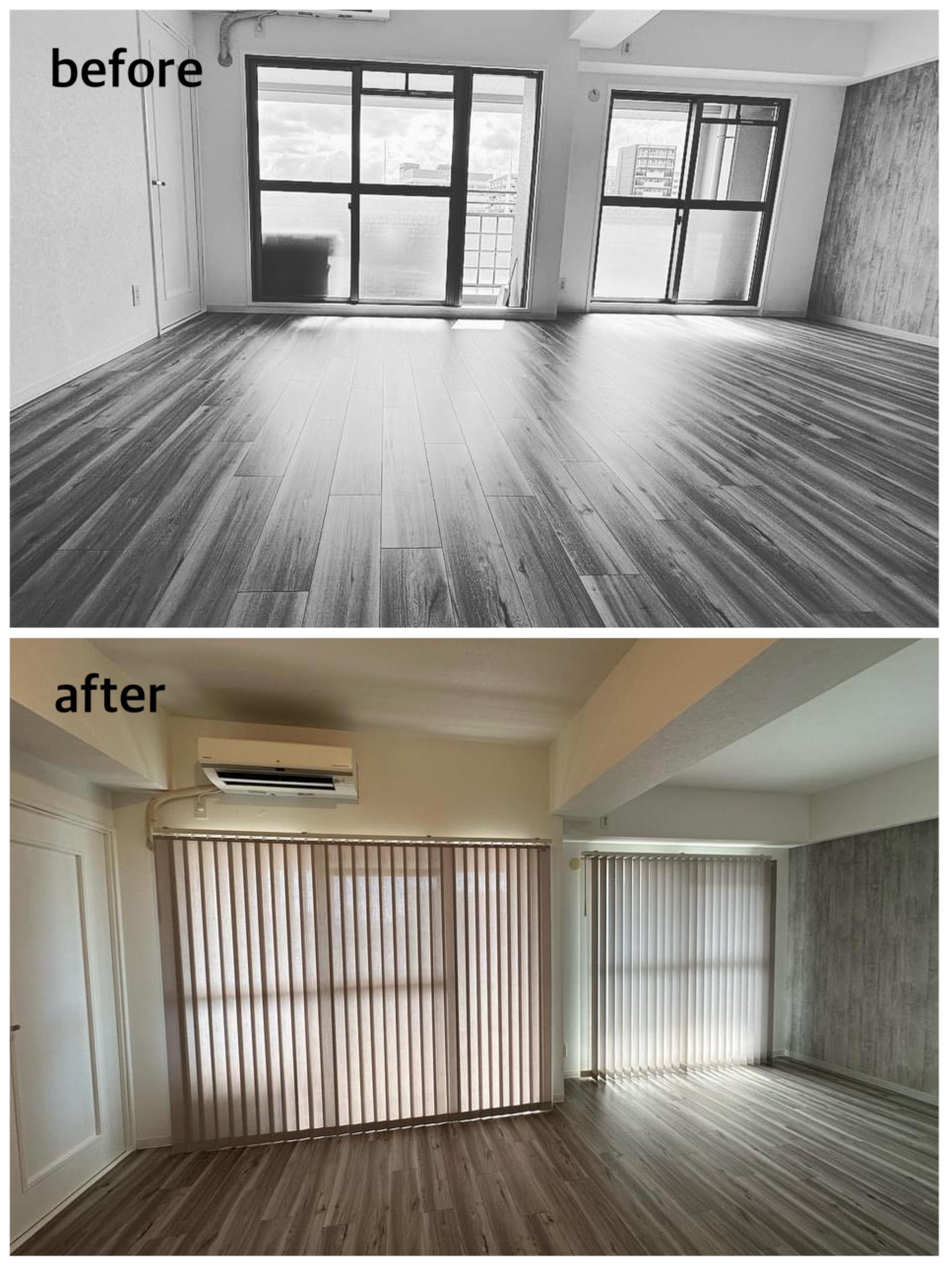 バーチカルブラインドで仕上げ、全体にモノトーンを基調にしたクールモダンなお部屋に生まれ変わりました。