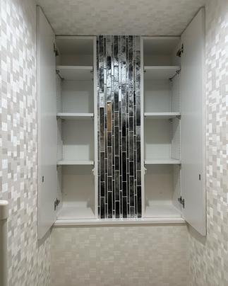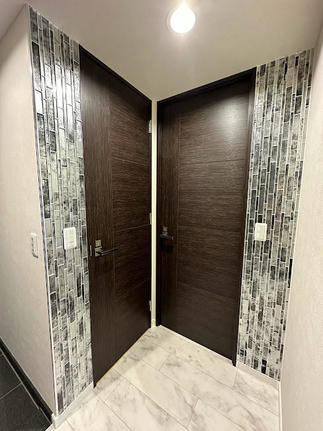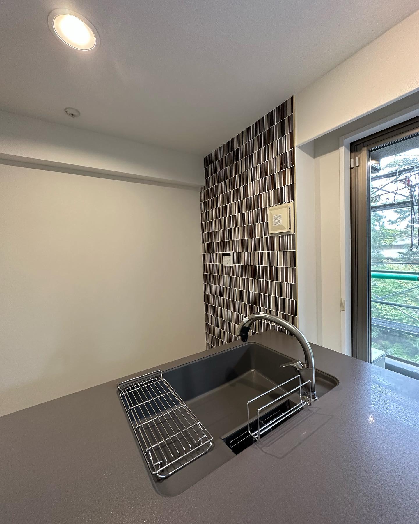 リゾートマンションのフルリノベーション お部屋にアクセントと彩りを添えてくれたLIXILモザイクタイル・ガラスタイル・LIXILエコカラットをご紹介。 キッチンシンク横の壁面、トイレ洗面のドア横、トイレ内部収納棚にガラスモザイクタイル。リビング・寝室の壁面にエコカラットを施工。