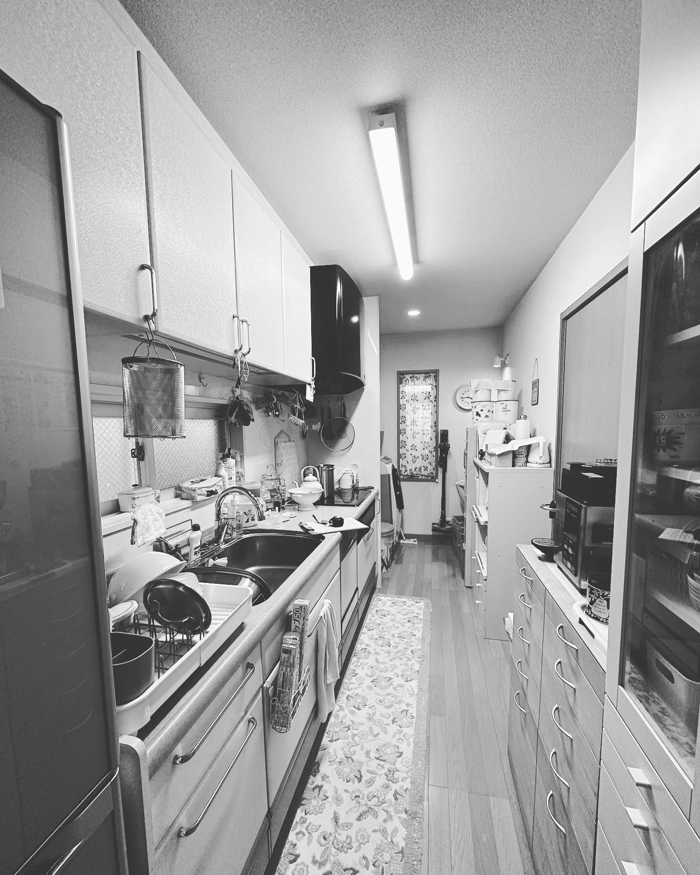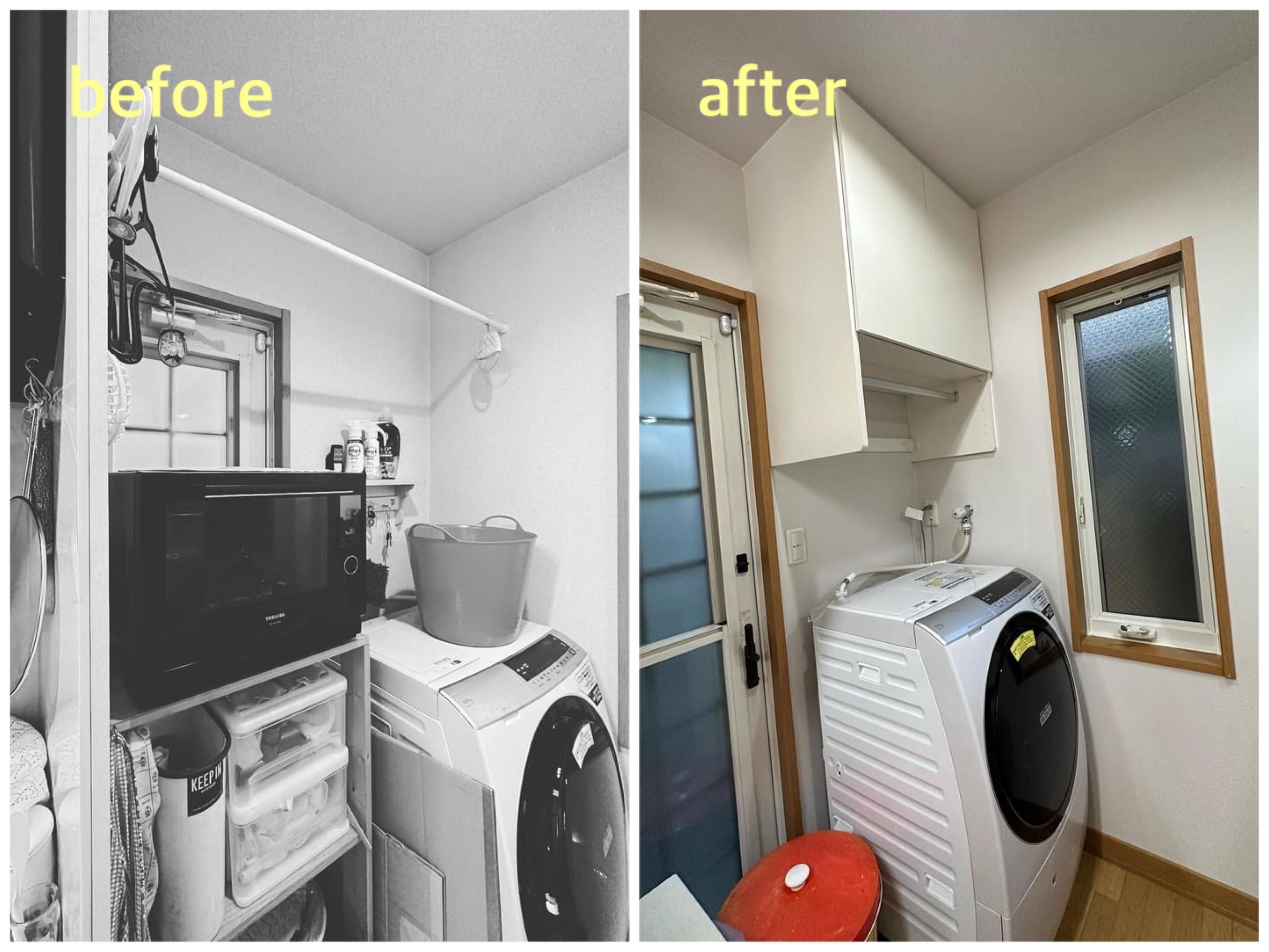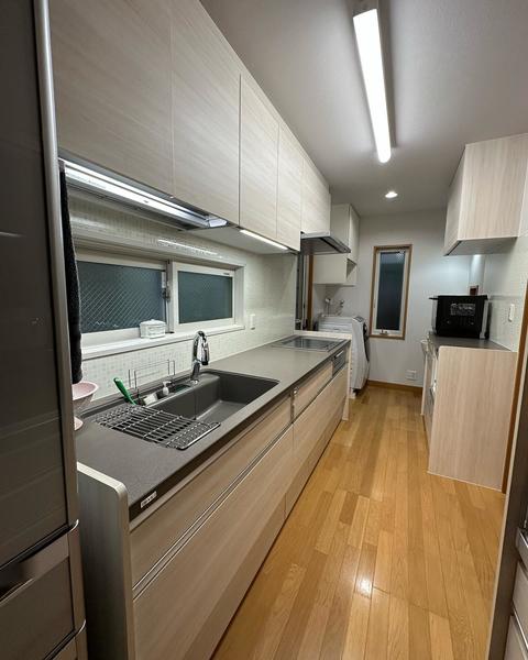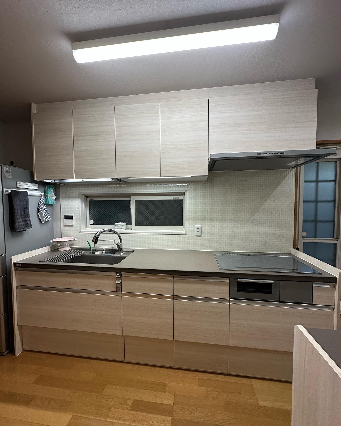 キッチン交換(LIXILリシェル)扉カラー:イタリアンウォルナット セラミックトップ、食器棚交換(LIXILリシェルカップボード) ハーフミラー引違い、家電収納と吊戸棚をプラス。 洗面所ランドリー収納(南海プライウッド)