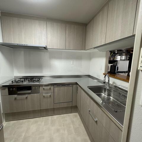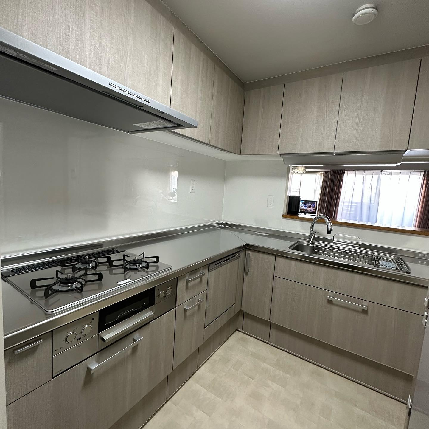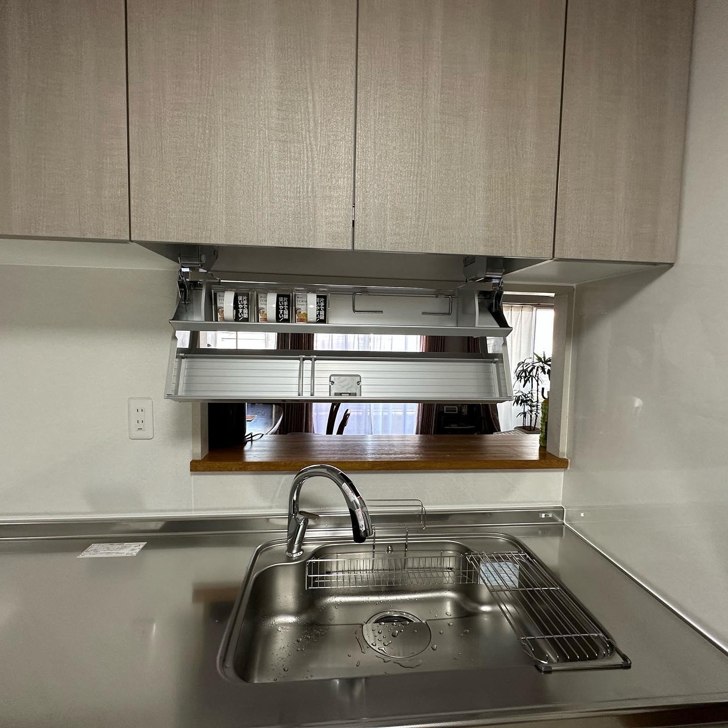 キッチン交換リフォーム 【LIXILリシェル】扉カラー:ラスティックアッシュ タッチレス自動水栓ナビッシュ 食洗機を新しく設置 調味料等を隠して収納できるクイックポケット クロス・クッションフロア貼り替え