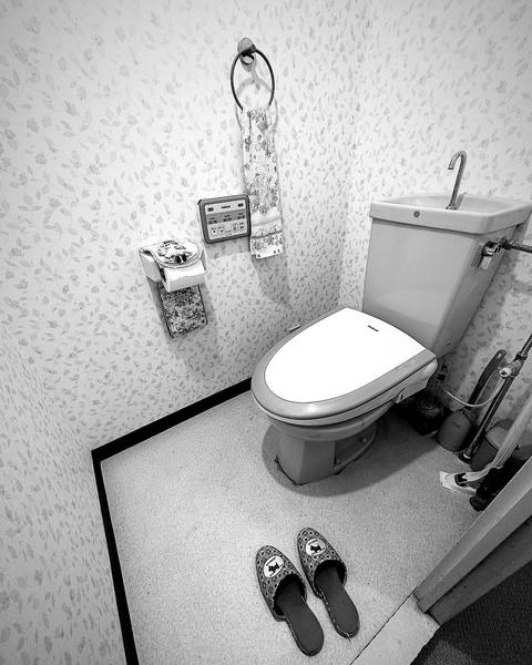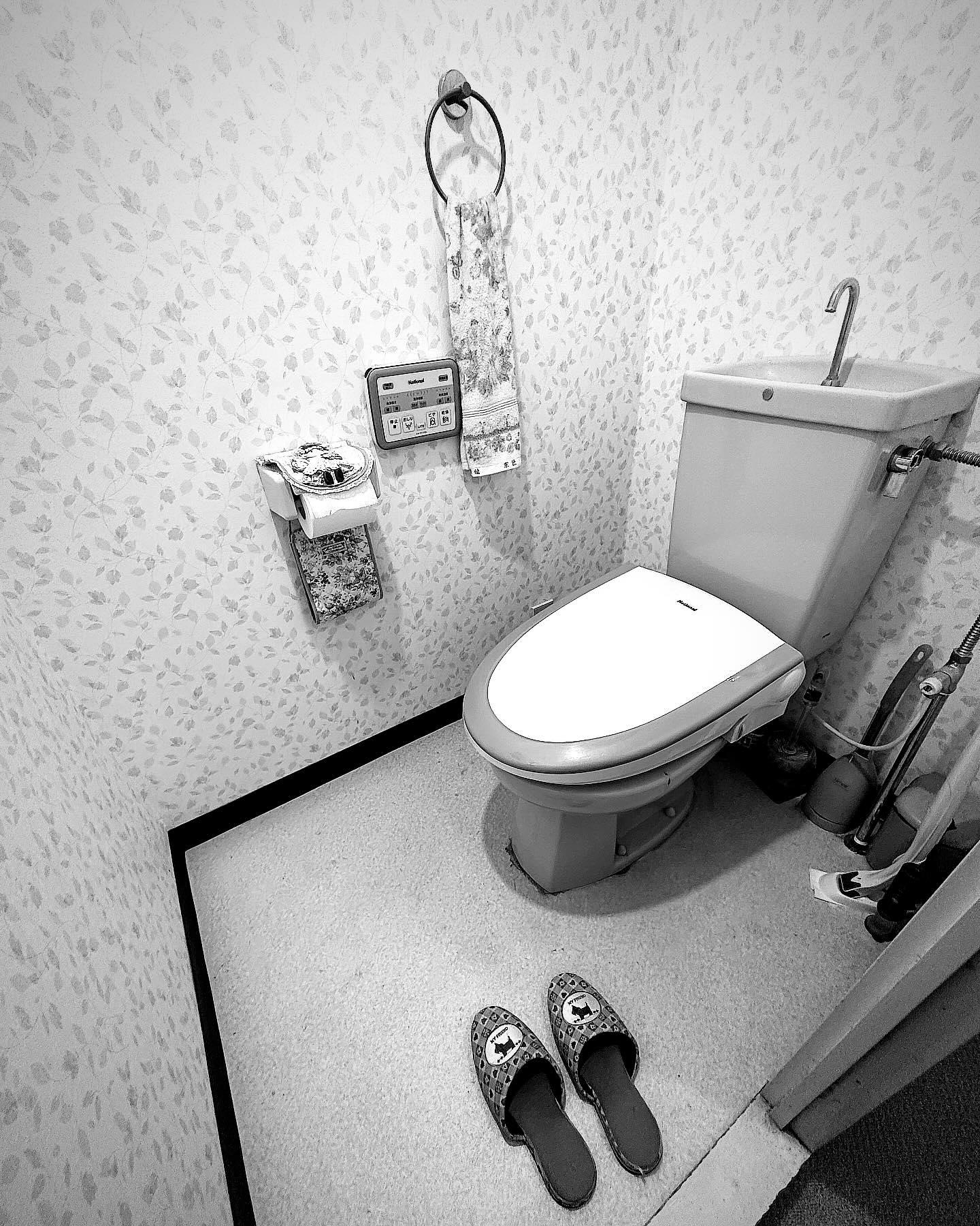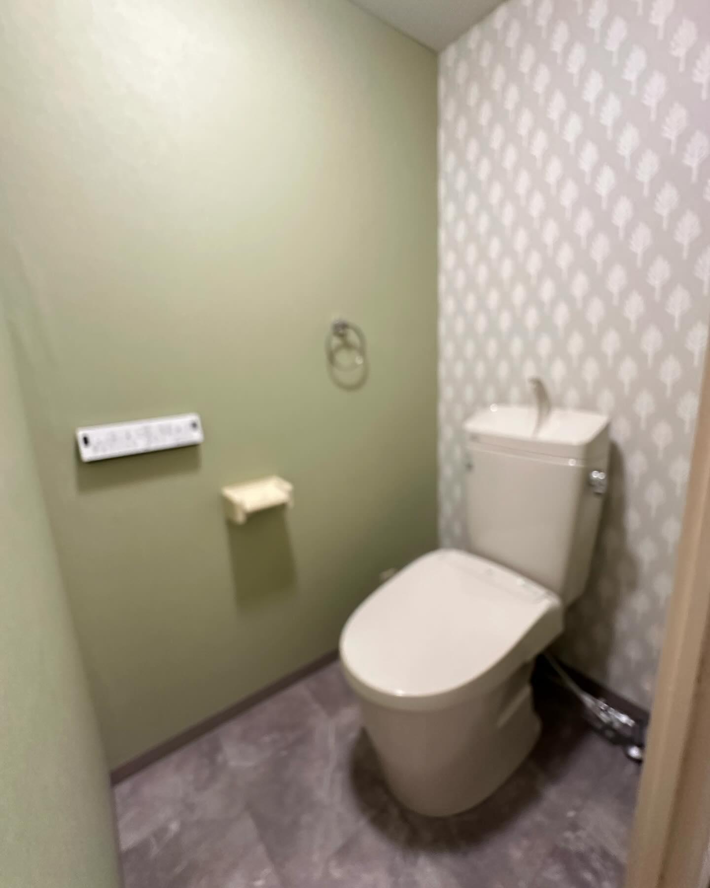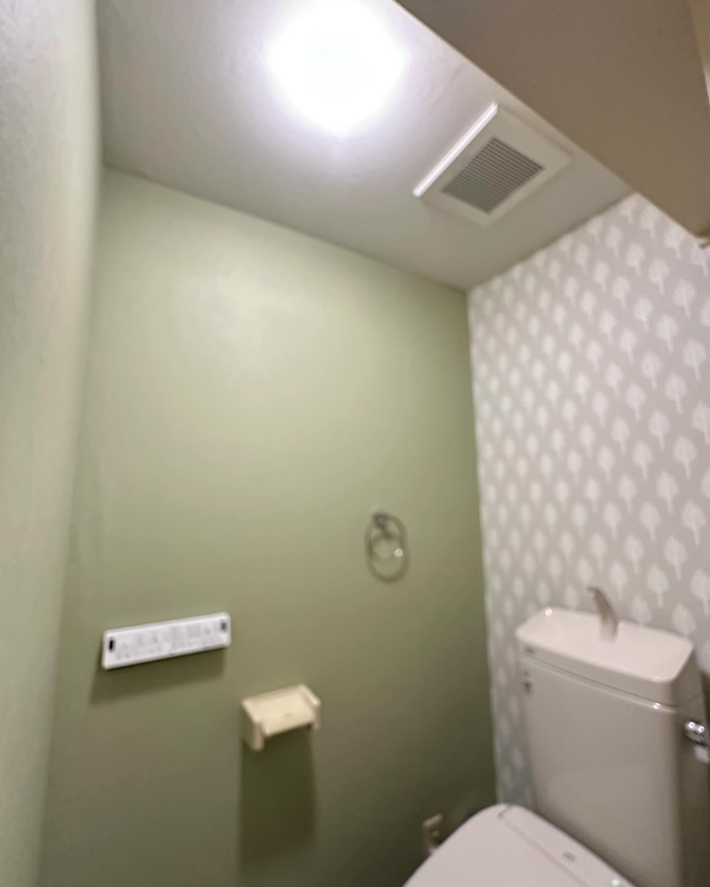 1日で終わるトイレのリフォーム! (LIXILアメージュ) 優しい色合いのクロスとパターン柄の組み合わせで、落ち着いた空間に。クッションフロアも貼り替えました。(リリカラ・サンゲツ) 照明器具(コイズミ)と換気扇(三菱)も交換して快適トイレ。