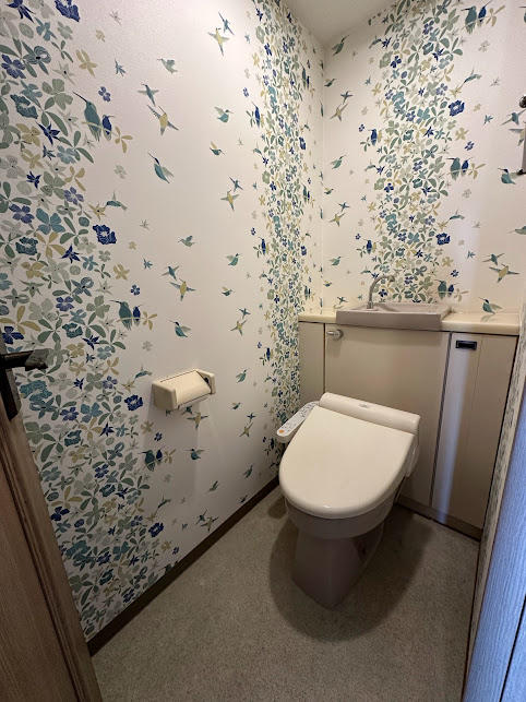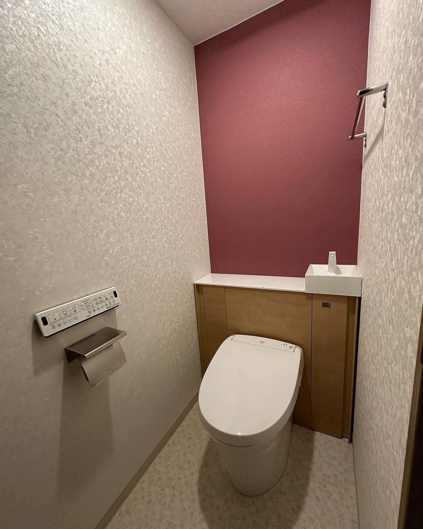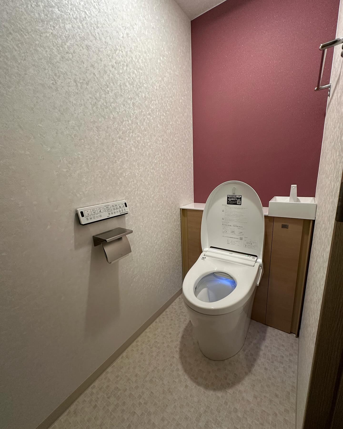 1日で終わるトイレのリフォーム! キャビネットトイレ交換(LIXILリフォレ) アクセントクロスが映える素敵なトイレ空間に。クッションフロアも貼り替えました。(リリカラ・サンゲツ)