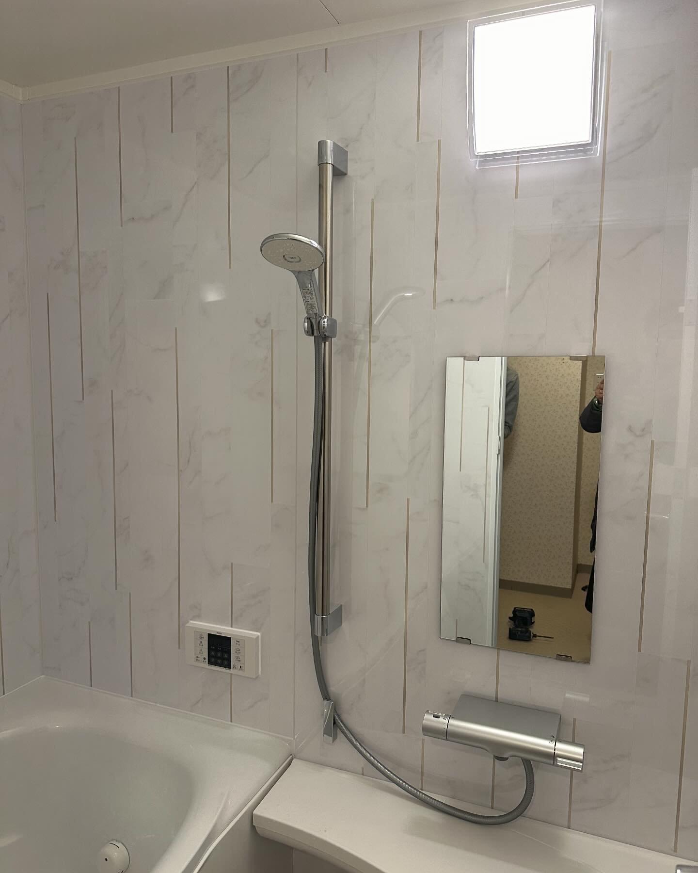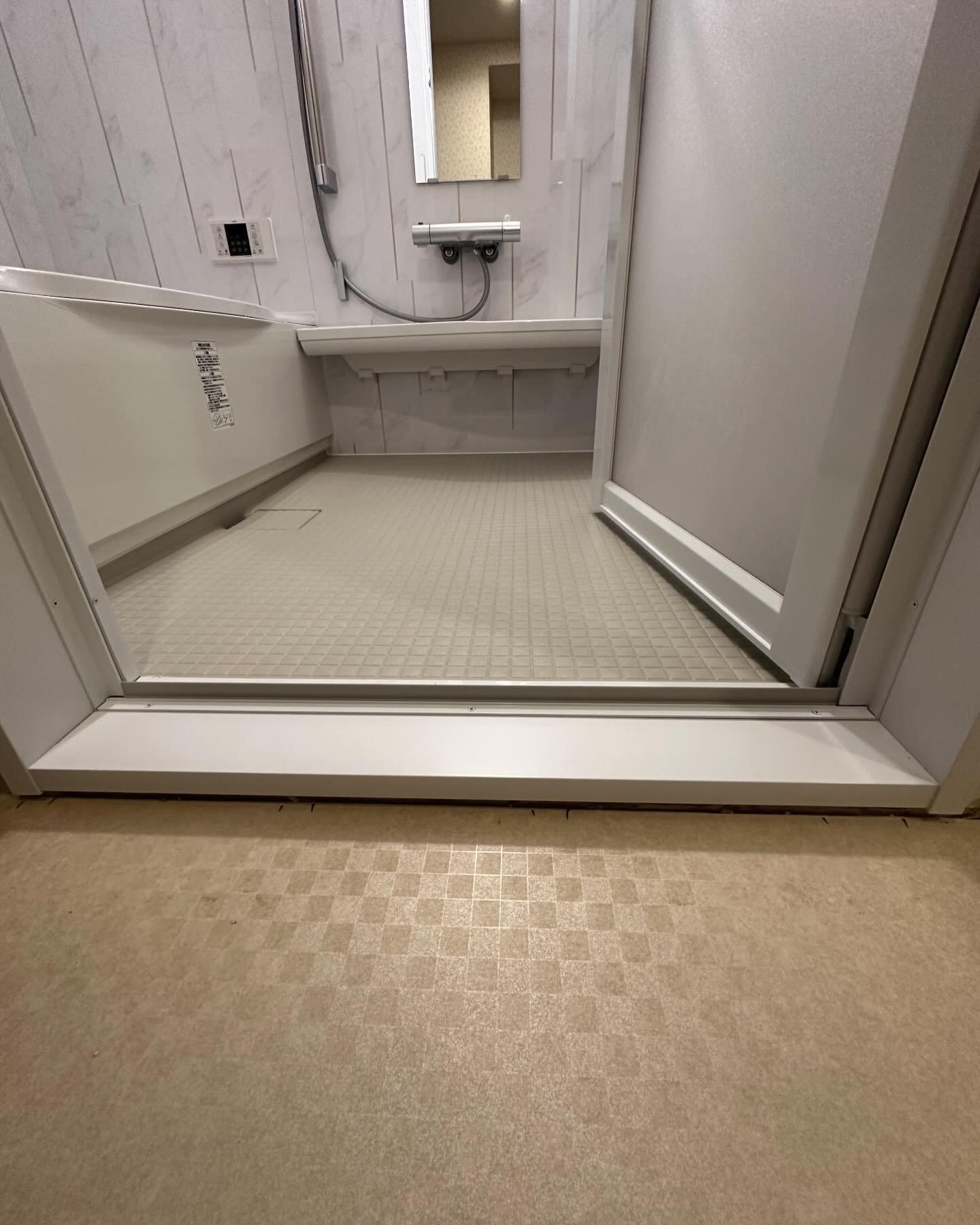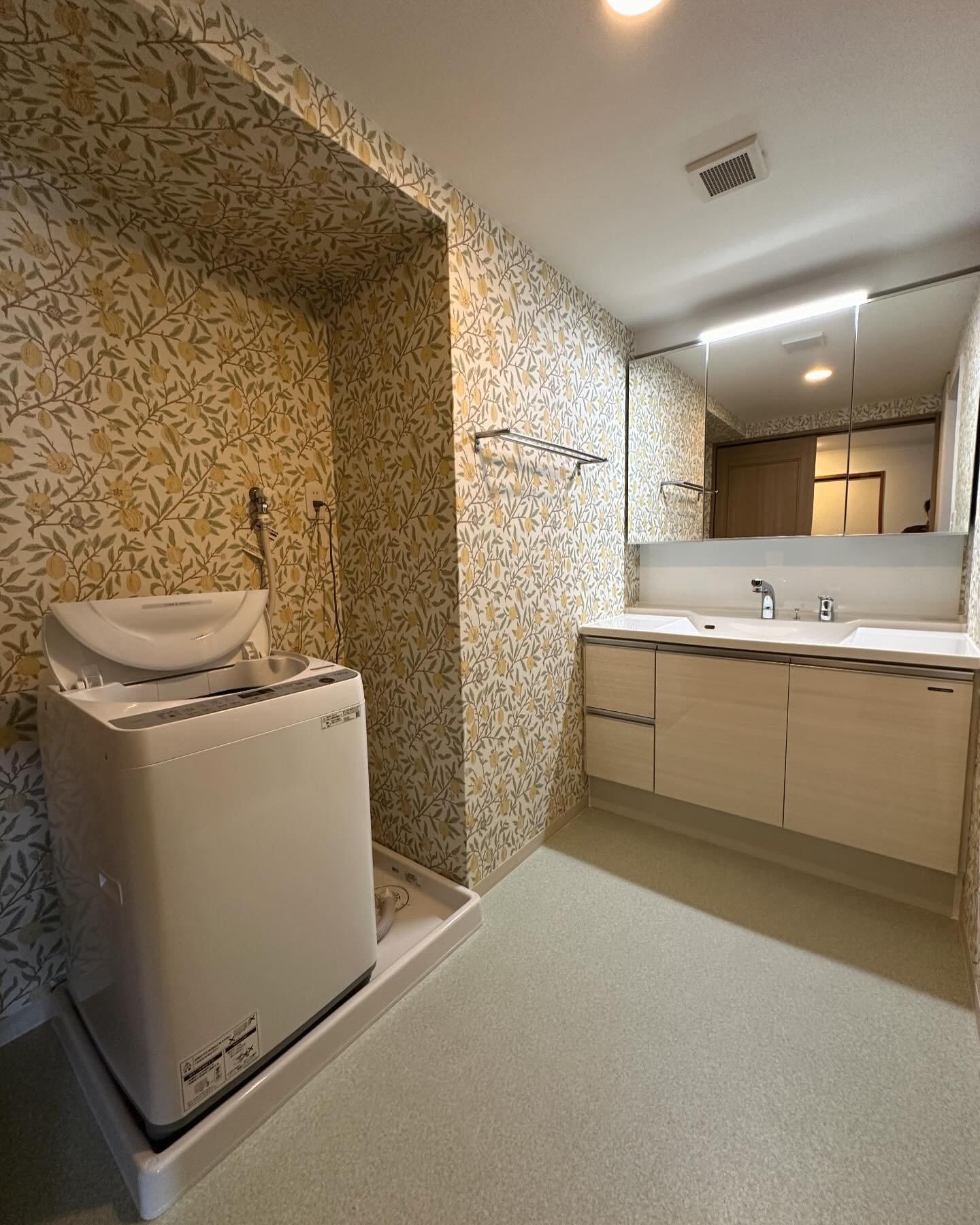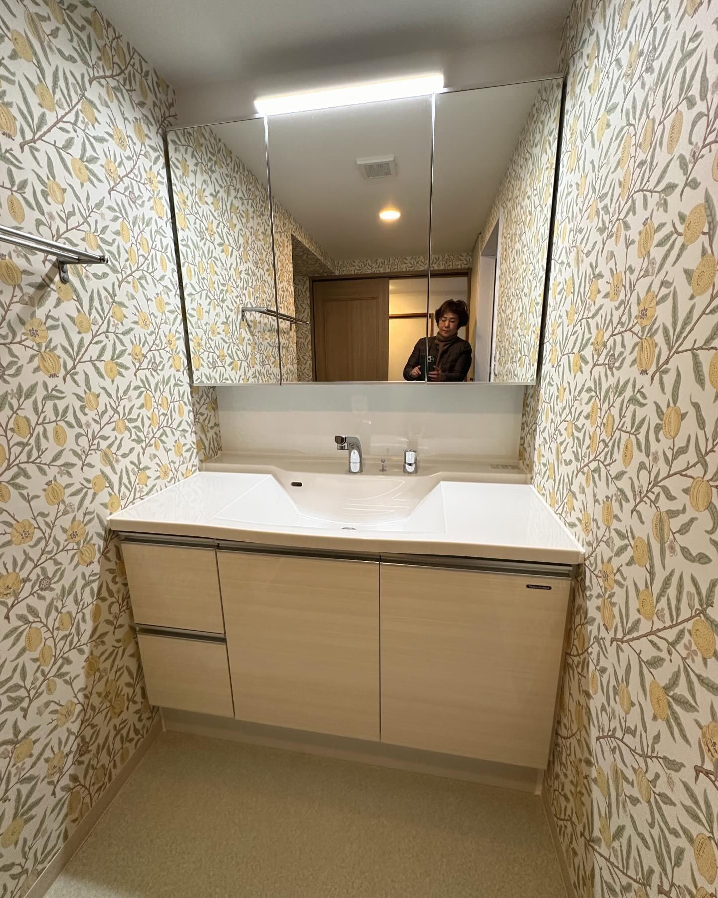 浴室と洗面所のリフォーム ユニットバス交換(LIXILリノビオV)壁パネル:カルカッタゴールド 高断熱浴槽、節湯水栓の使用、手すり設置・段差解消・入口幅拡張で使いやすさ機能充実。来年度の省エネ補助金申請予定です。 華やかに生まれ変わった洗面脱衣所 洗面化粧台交換(タカラ リジャスト) 全面クロスを貼り替え(サンゲツMORRIS CHRONICLESシリーズ)