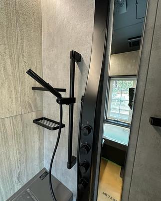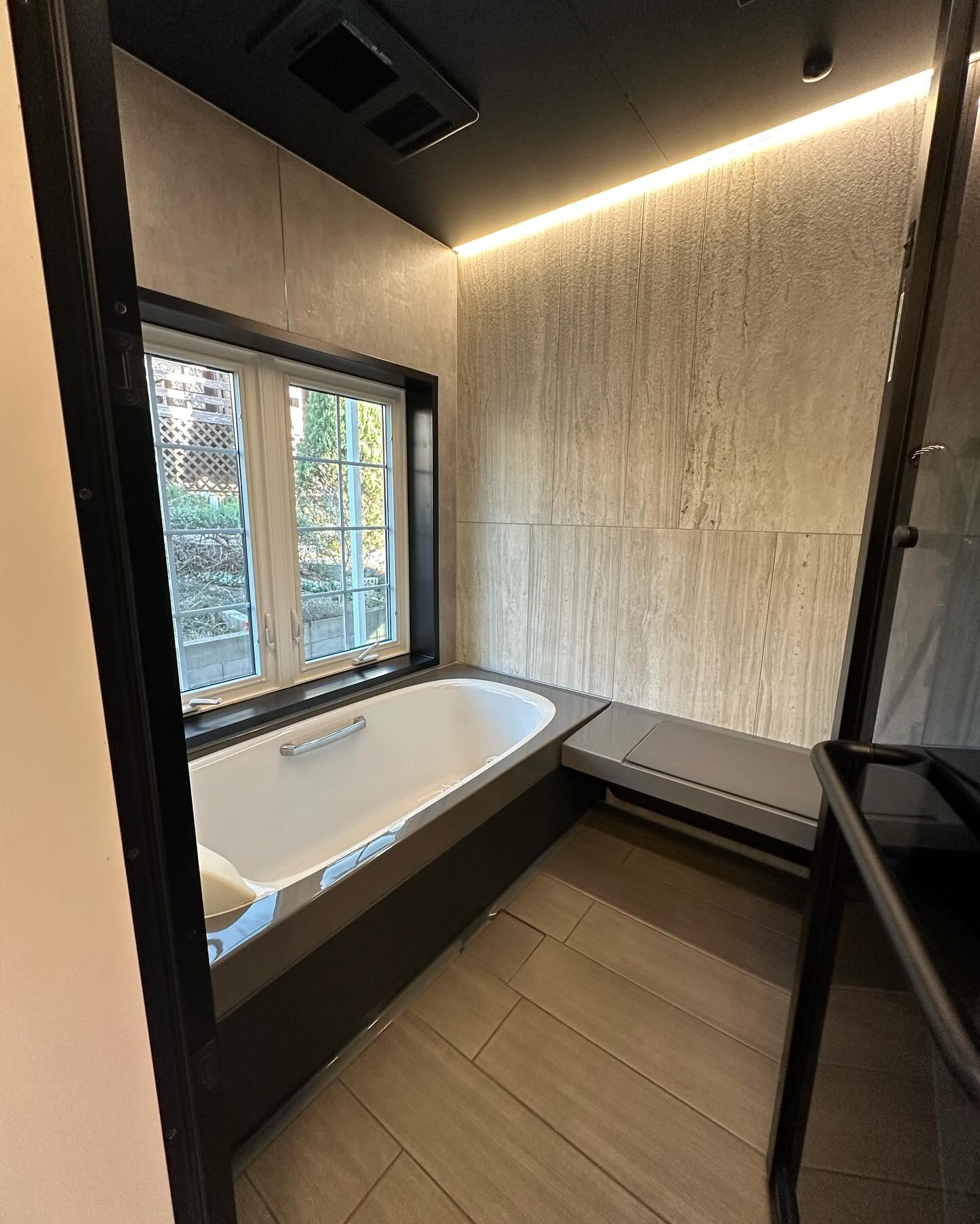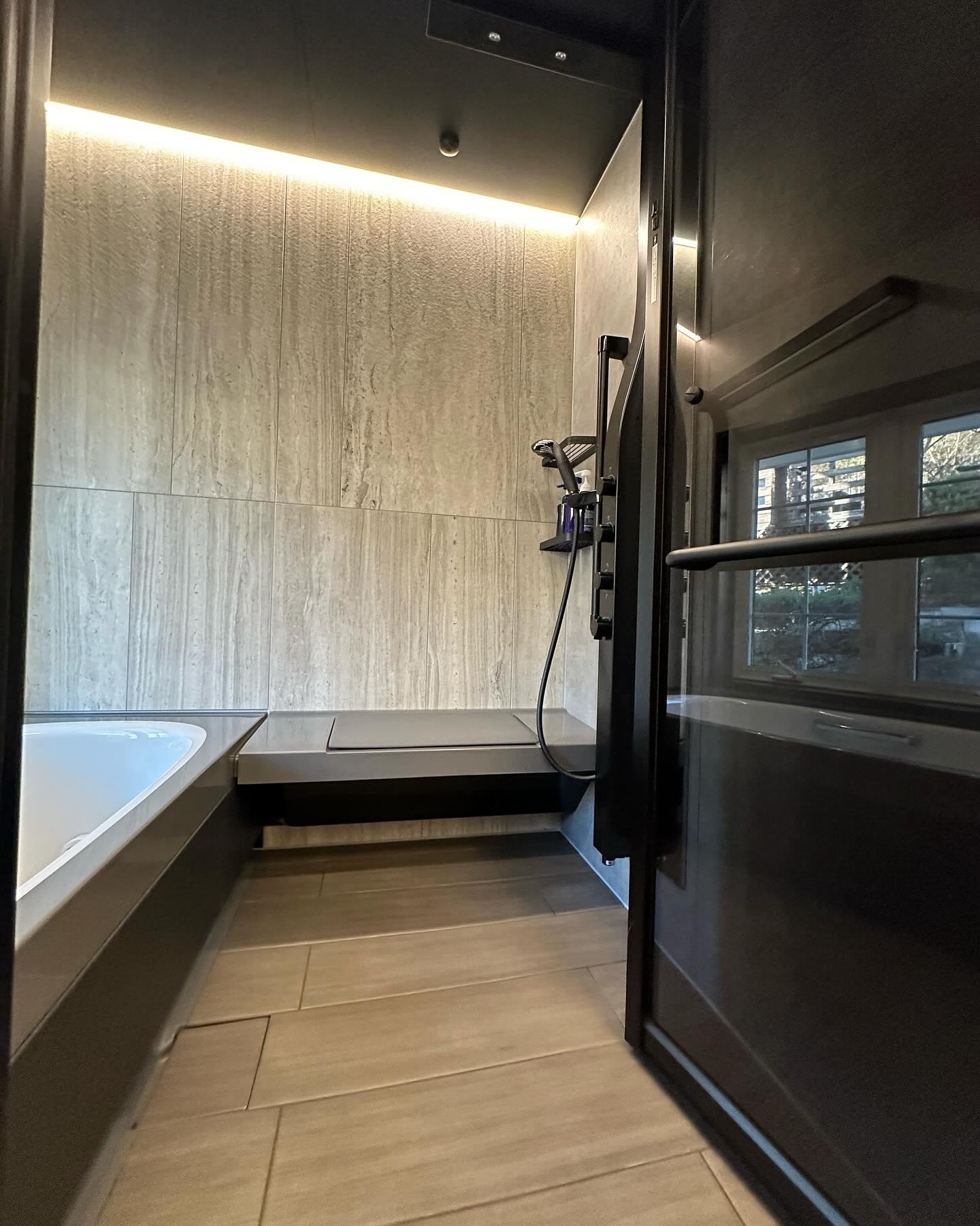 戸建のユニットバス交換 LIXILスパージュ オーバーヘッドシャワーから全身にたっぷりお湯を浴びて、ベンチに腰掛ければ打たせ湯が疲れた体をほぐす…そんな贅沢な入浴タイムを自宅で実現するアクアタワー。浴槽ではアクアフィールの肩湯腰湯で、体の芯からリラックス。 壁面セラミックタイル、床グランフロアが極上の空間をさらに演出します。