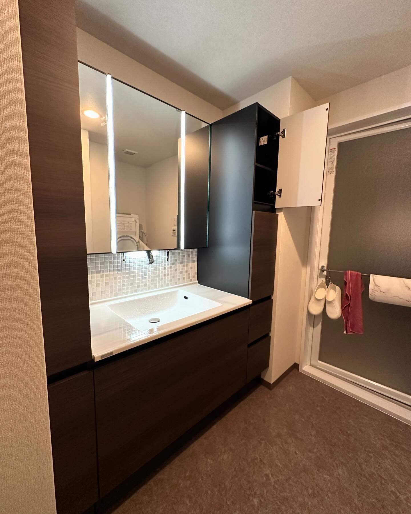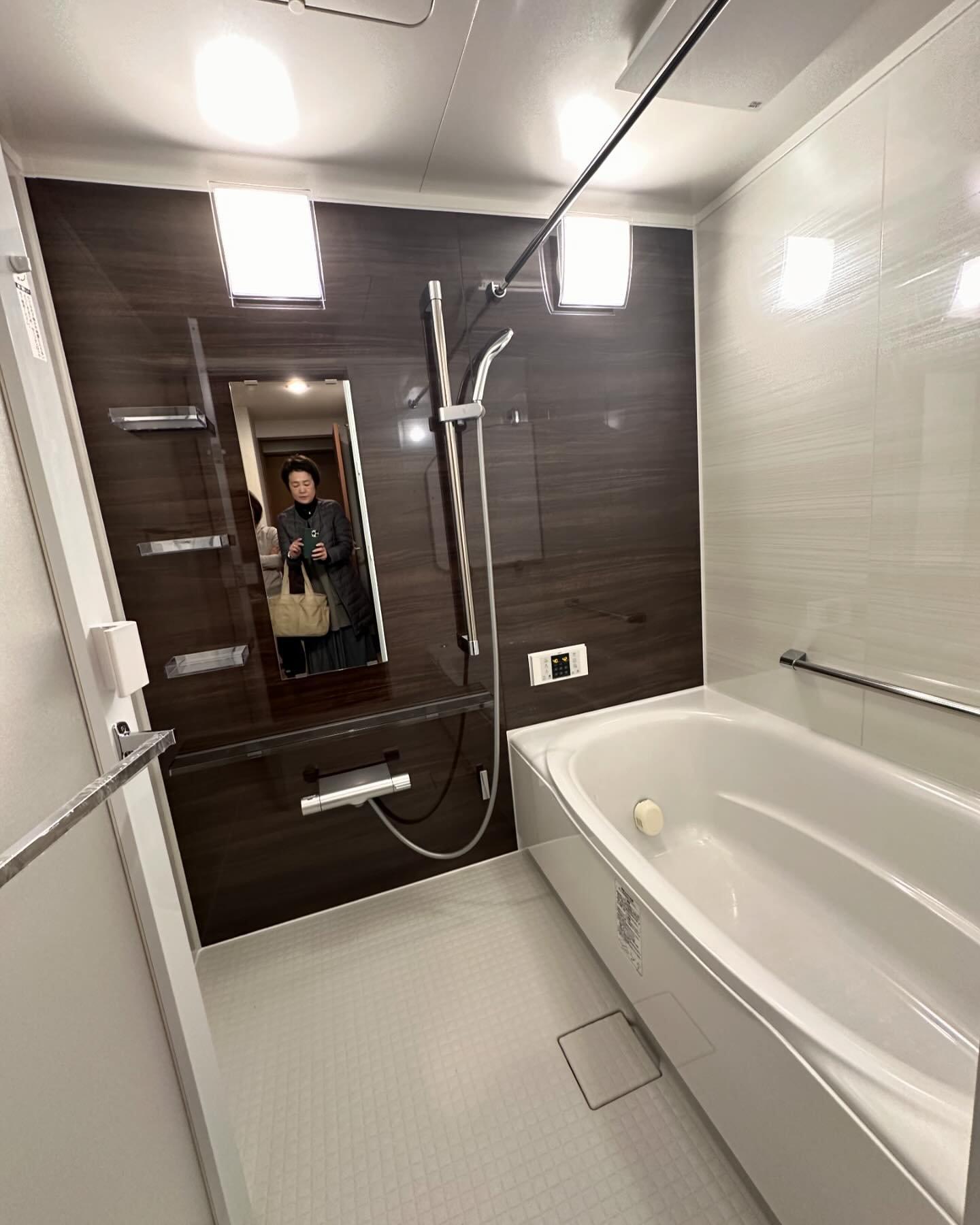 ユニットバス交換(LIXILリノビオV)壁アクセントパネル:ダークウォールナット 洗面化粧台交換(LIXILルミシス)扉カラー:ショコラオーク ※高断熱浴槽・浴室乾燥機・節湯水栓・段差解消・手すり設置・入口幅拡張は省エネ補助金対象工事です