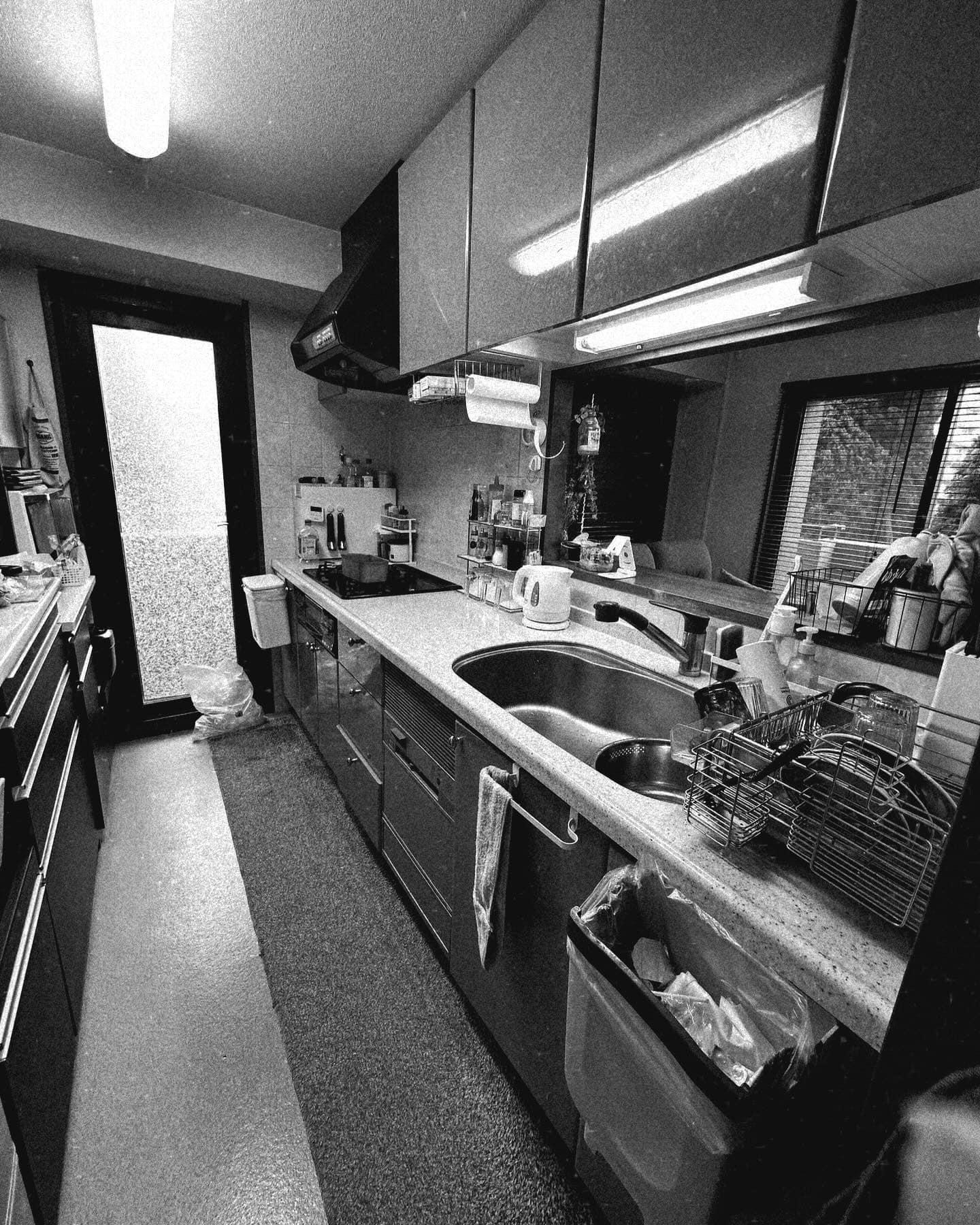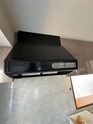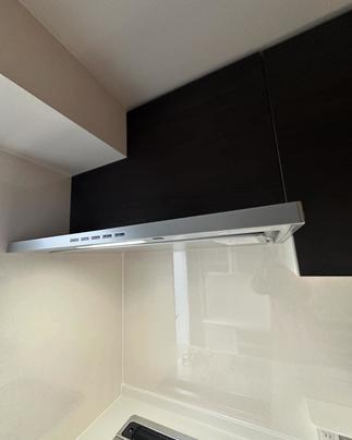 マンションのキッチンリフォーム(LIXILノクト) 扉色:クリエダーク 便利なハンディボックス、シンク上部にはオートダウンウォール(食器乾燥庫タイプ) レンジフード設置部分に梁があっても綺麗に納まります