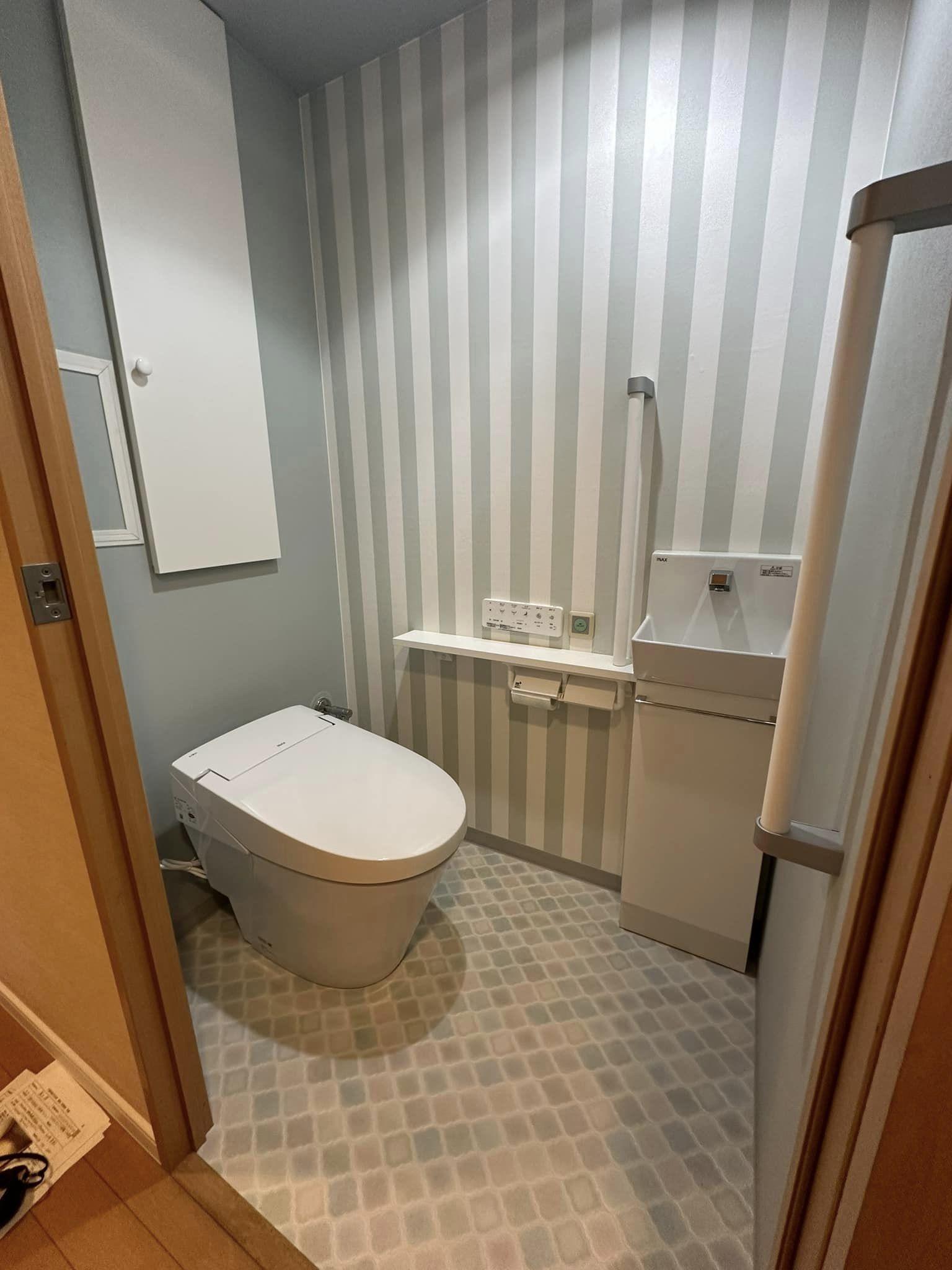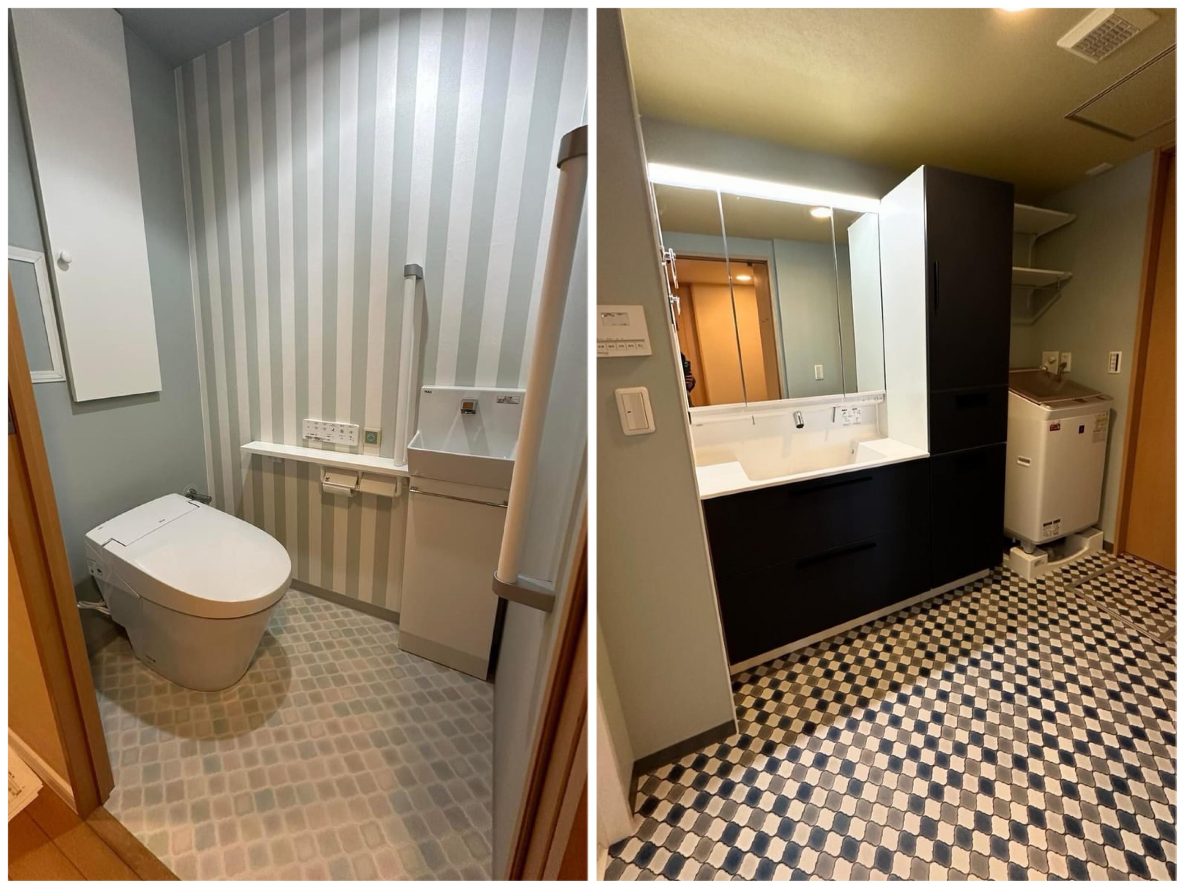 手すり設置やバリアフリー対策もしつつ、トイレ洗面化粧室ともにポップな内装で一新!