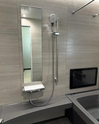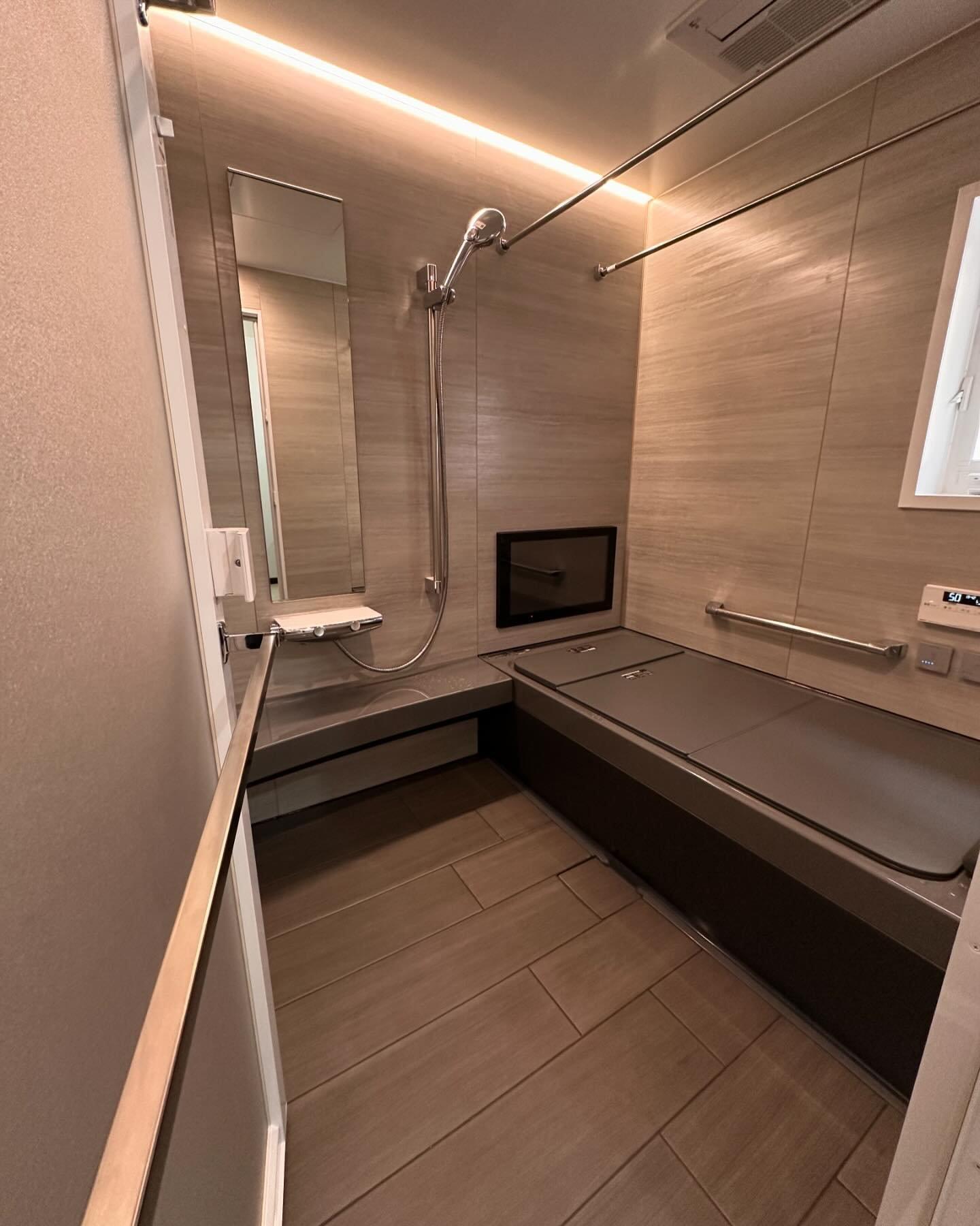 戸建浴室リフォーム(LIXILスパージュ) 浴槽:パールグレー 壁パネル:セルベジャンテ 床:ダークウッド 腰湯肩湯で極上のリラクゼーション おうちスパが毎日楽しめます 浴槽につかりながらTV鑑賞! 浴室内の窓は、外窓交換し断熱性アップ リビングのサッシにも内窓を取り付け、 断熱・防音・結露対策