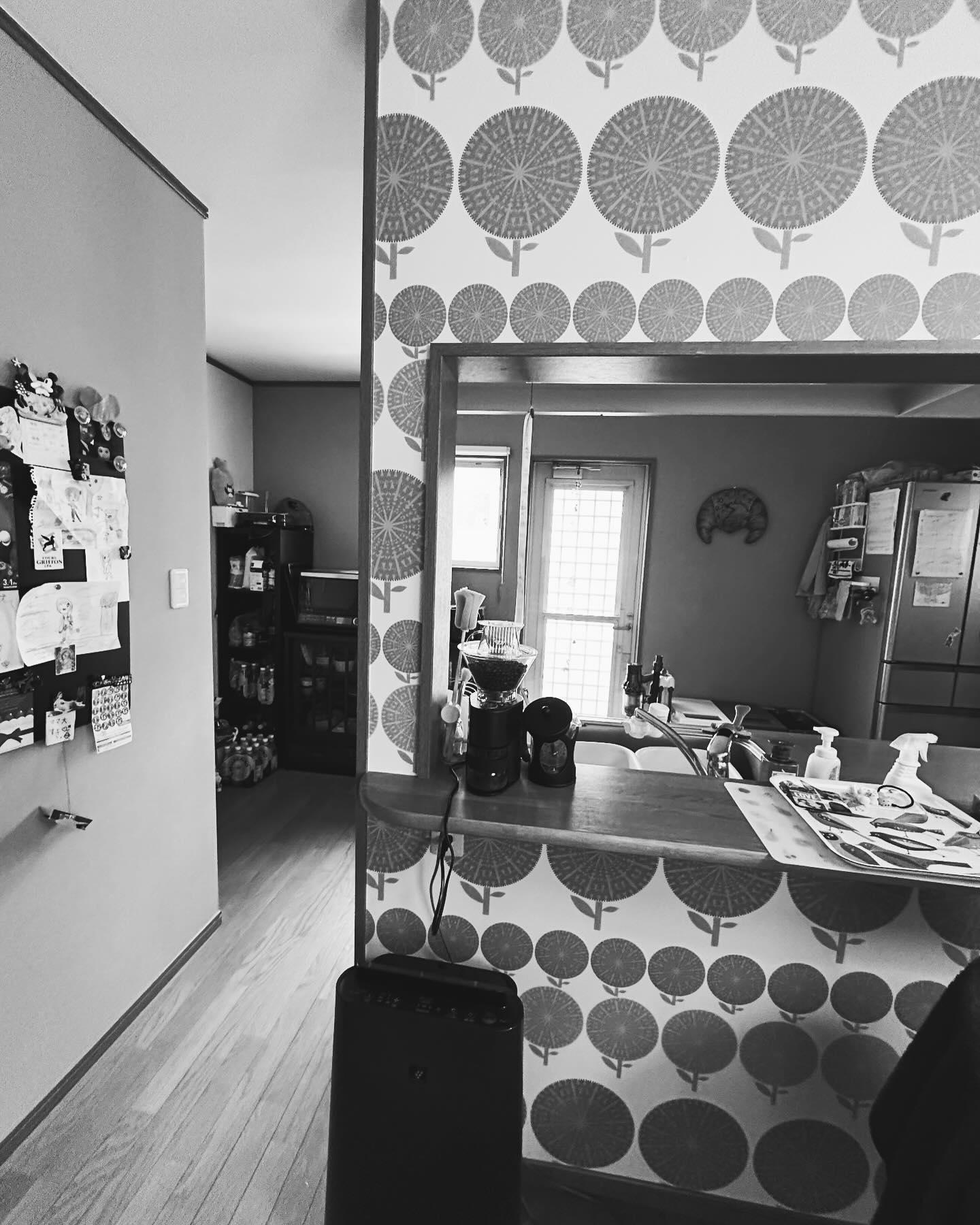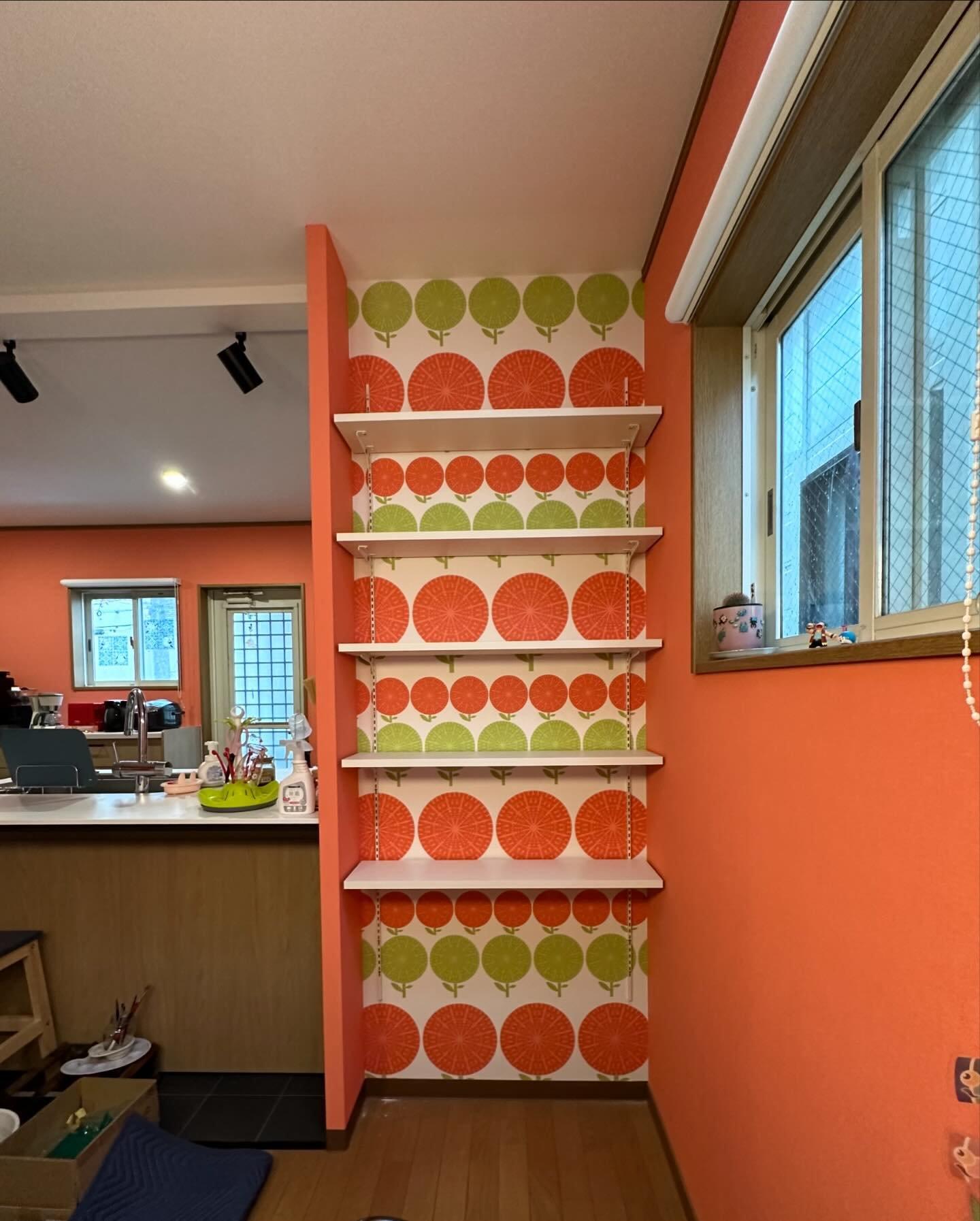 残った壁にも可動棚を設置し有効活用、元の慣れ親しんだ可愛らしい柄の同じデザインを選びました。個性的で良いアクセントになっています。