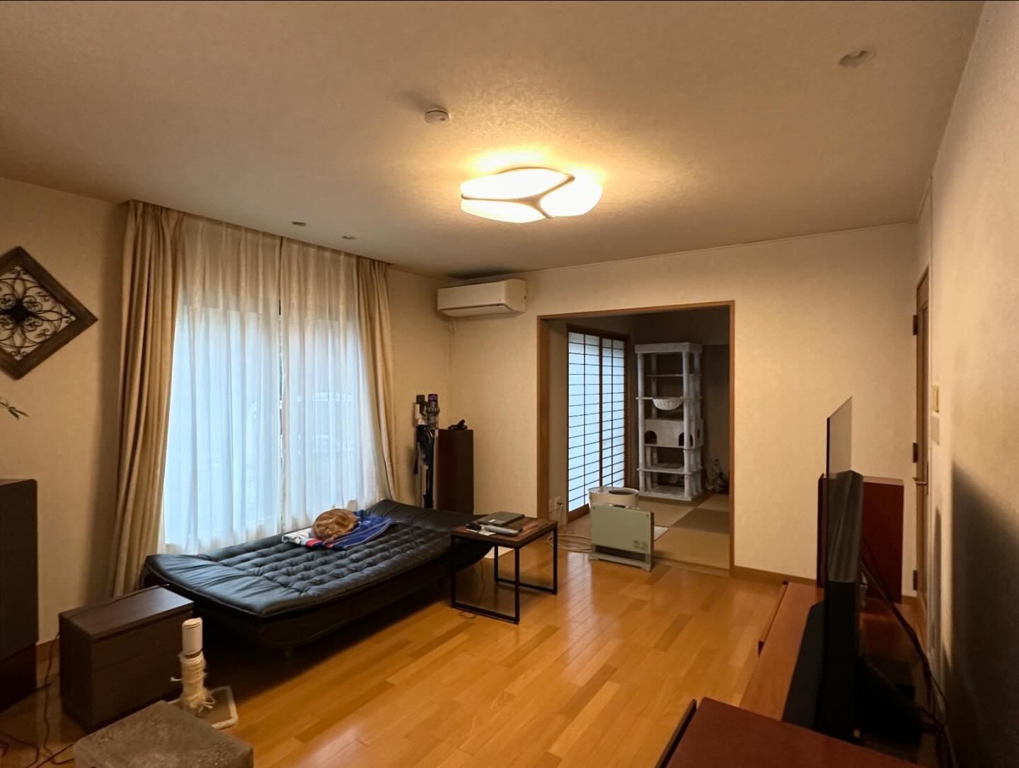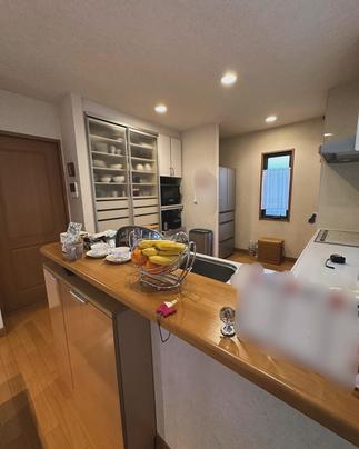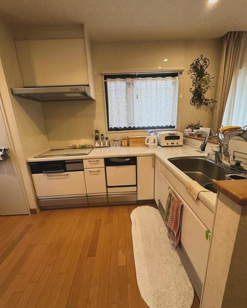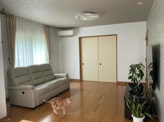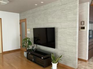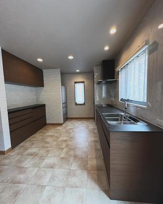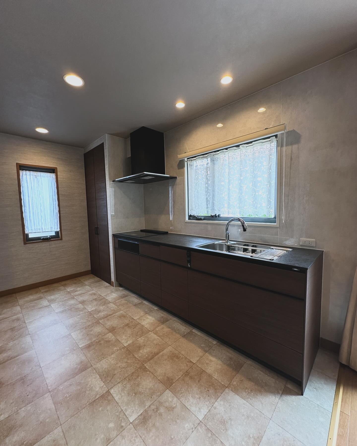 ・戸建てキッチン交換 カウンター付きのL字型からI字型にレイアウト変更 (LIXILリシェル)扉カラー:クリエモカ セラミック天板 カップボード設置(LIXILリシェル)扉カラー:クリエモカ レンジフード横の収納扉交換(LIXILラシッサ) 床、厚手クッションフロア重ね貼り(サンゲツPM) ・リビング内装 クロス貼り替え 壁掛けテレビ下地 アクセントクロス(サンゲツ)