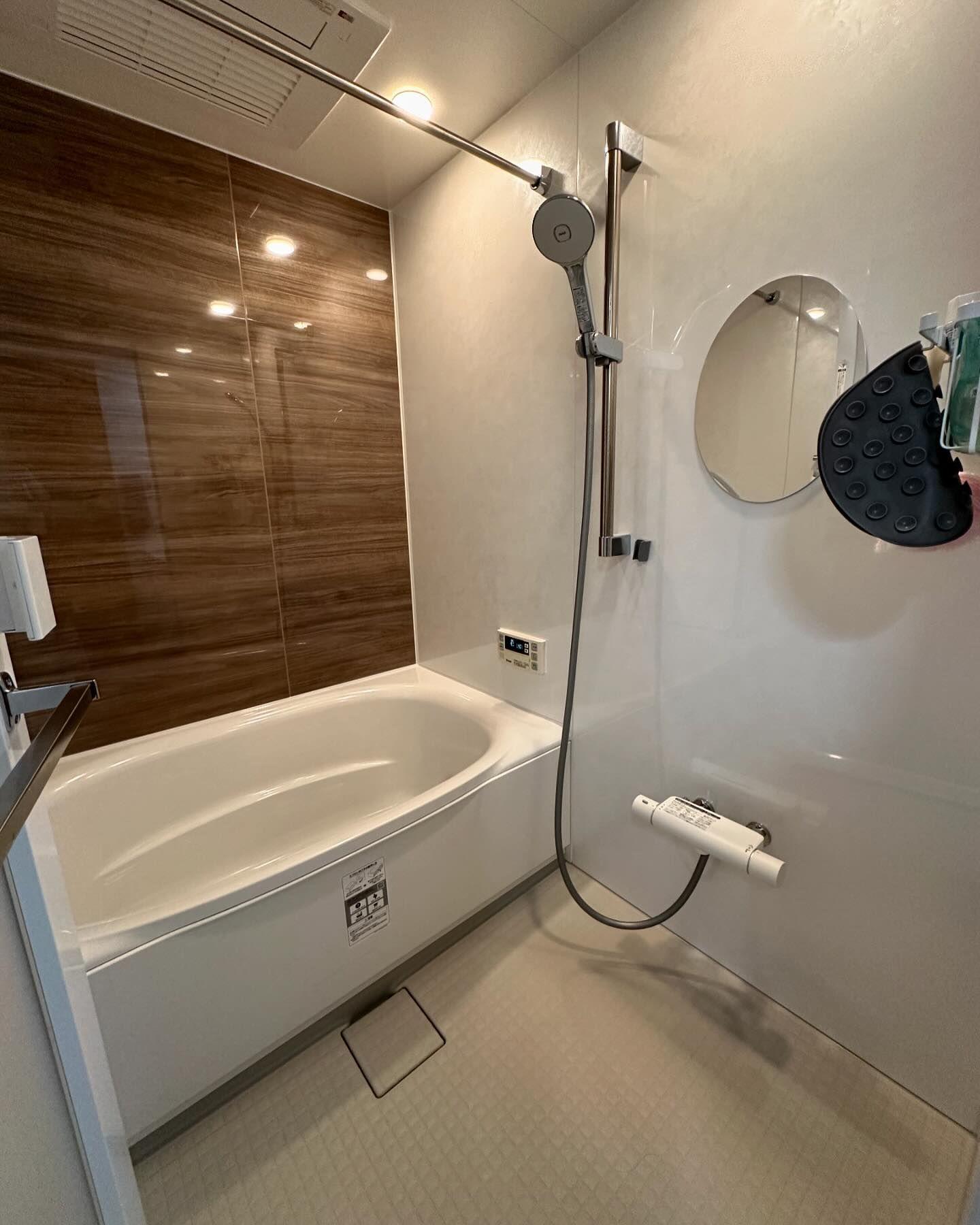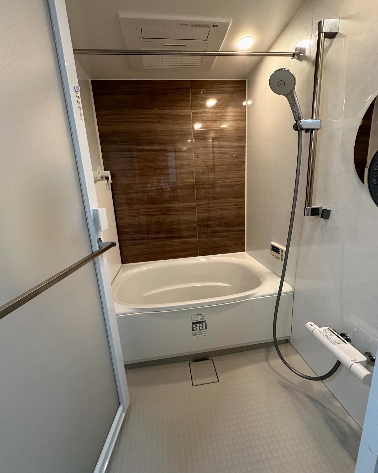・ユニットバス交換(LIXILリノビオV) アクセントパネル貼り (ウォールナット/クルムホワイト) ※高断熱浴槽、浴室乾燥機、手すり設置、段差解消、入口幅拡張などの、補助金対象工事を含みます
