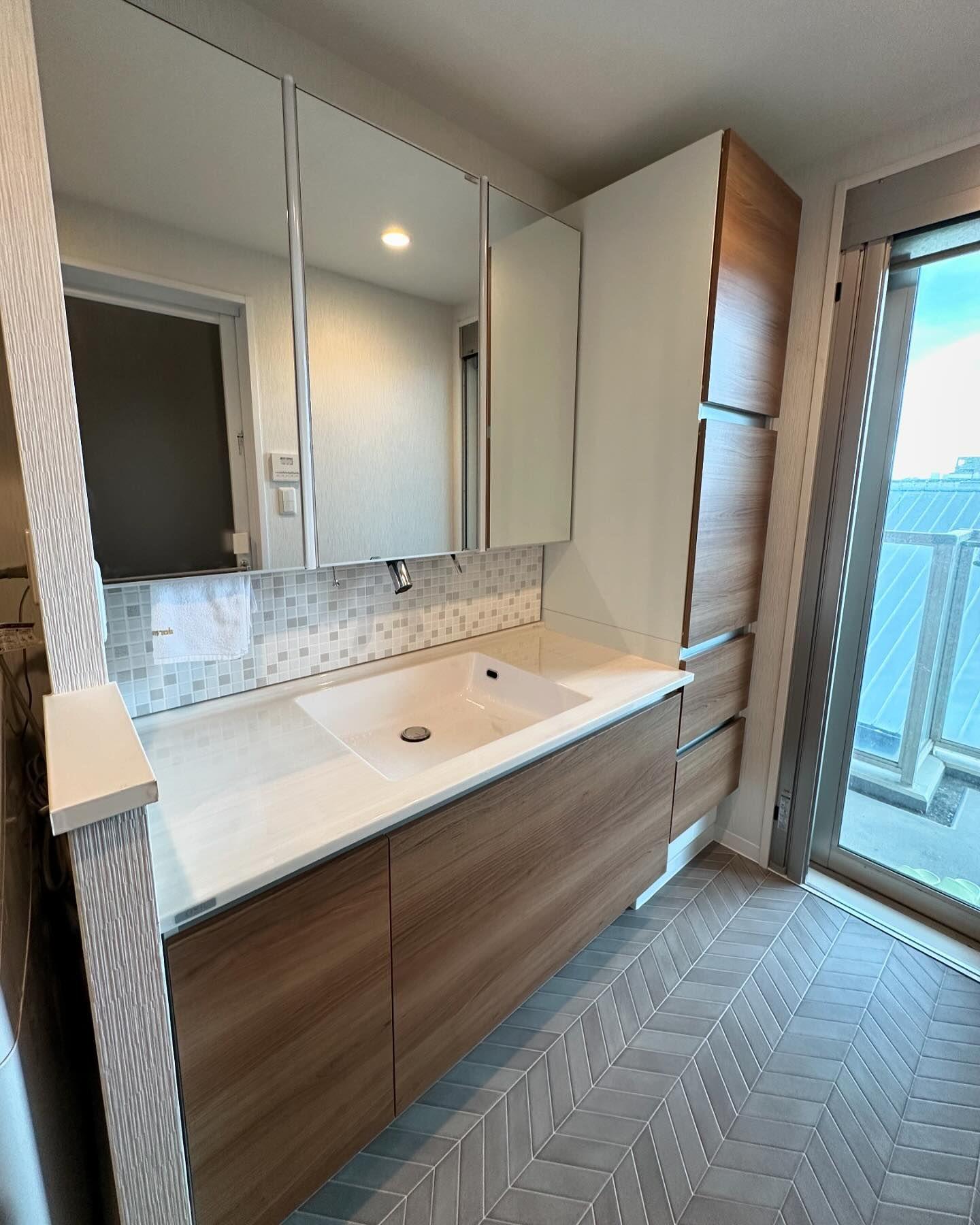マンション洗面脱衣室のリフォーム 洗面化粧台(LIXILルミシス)収納トールキャビネット ボウル一体タイプ・タッチレス水栓ナビッシュクロム 扉カラー:チェリー カウンターカラー:ラピシアクロスベージュ