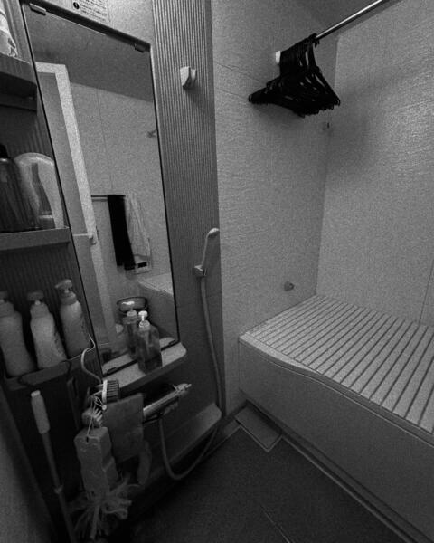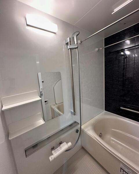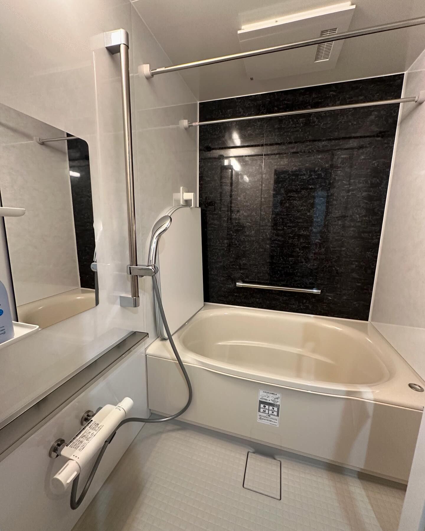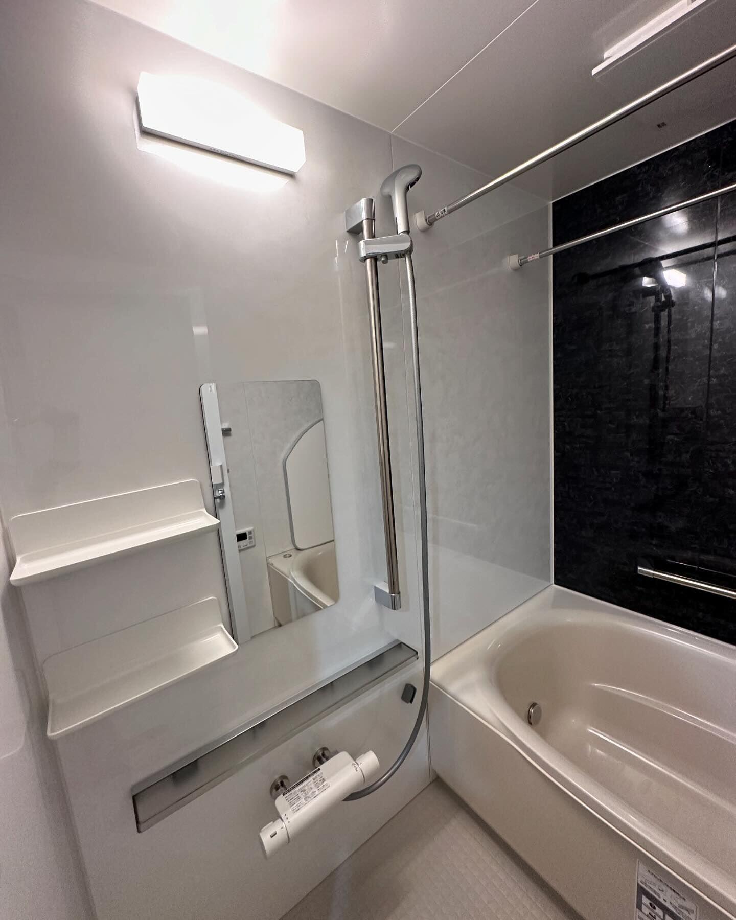 ・浴室交換(LIXILリノビオV) 壁アクセントパネル:ストーンモザイクダーク/クルムホワイト ミラー・収納トレイともにマグネットタイプ