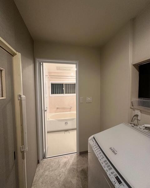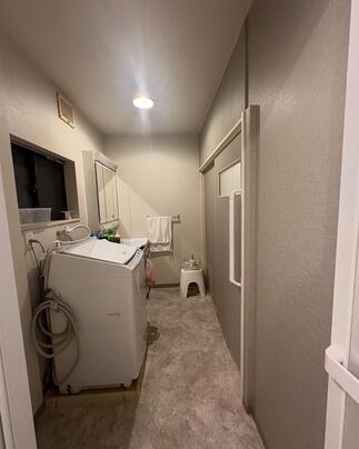 寒いタイルのお風呂から 暖かいユニットバスへ(LIXILリデア) 壁パネルカラー:マーフィルベージュ/クルムホワイト 浴室洗い場を縮小、洗面所側に広げて脱衣所がゆったりしました