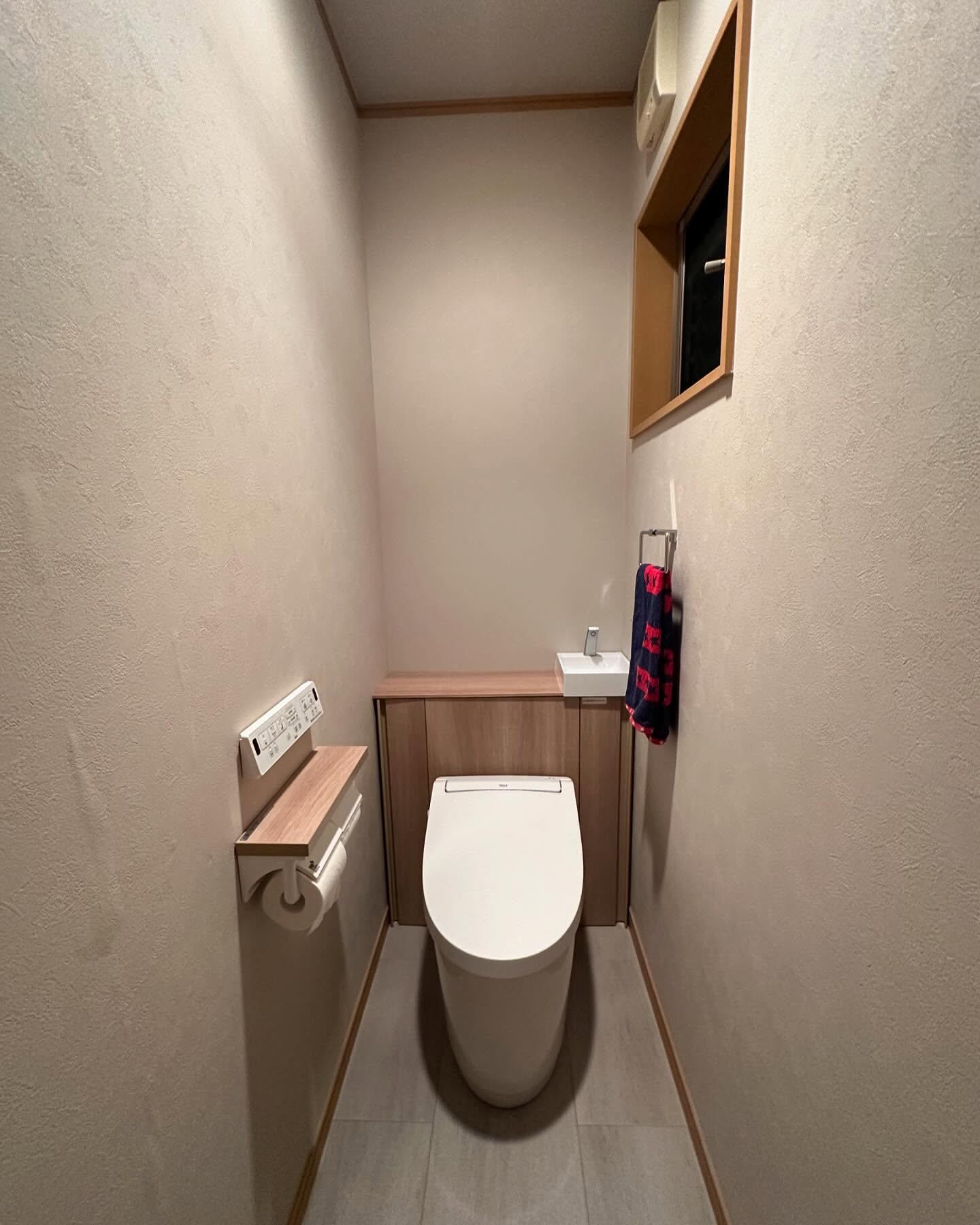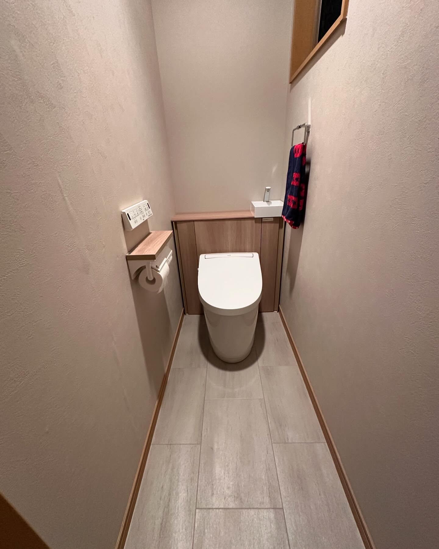 戸建トイレ交換(LIXIL Jフィット) キャビネット型でお掃除しやすく、見た目もスッキリ キャビネットカラー:ライトオーク クロス:サンゲツSP クッションフロア:サンゲツHM