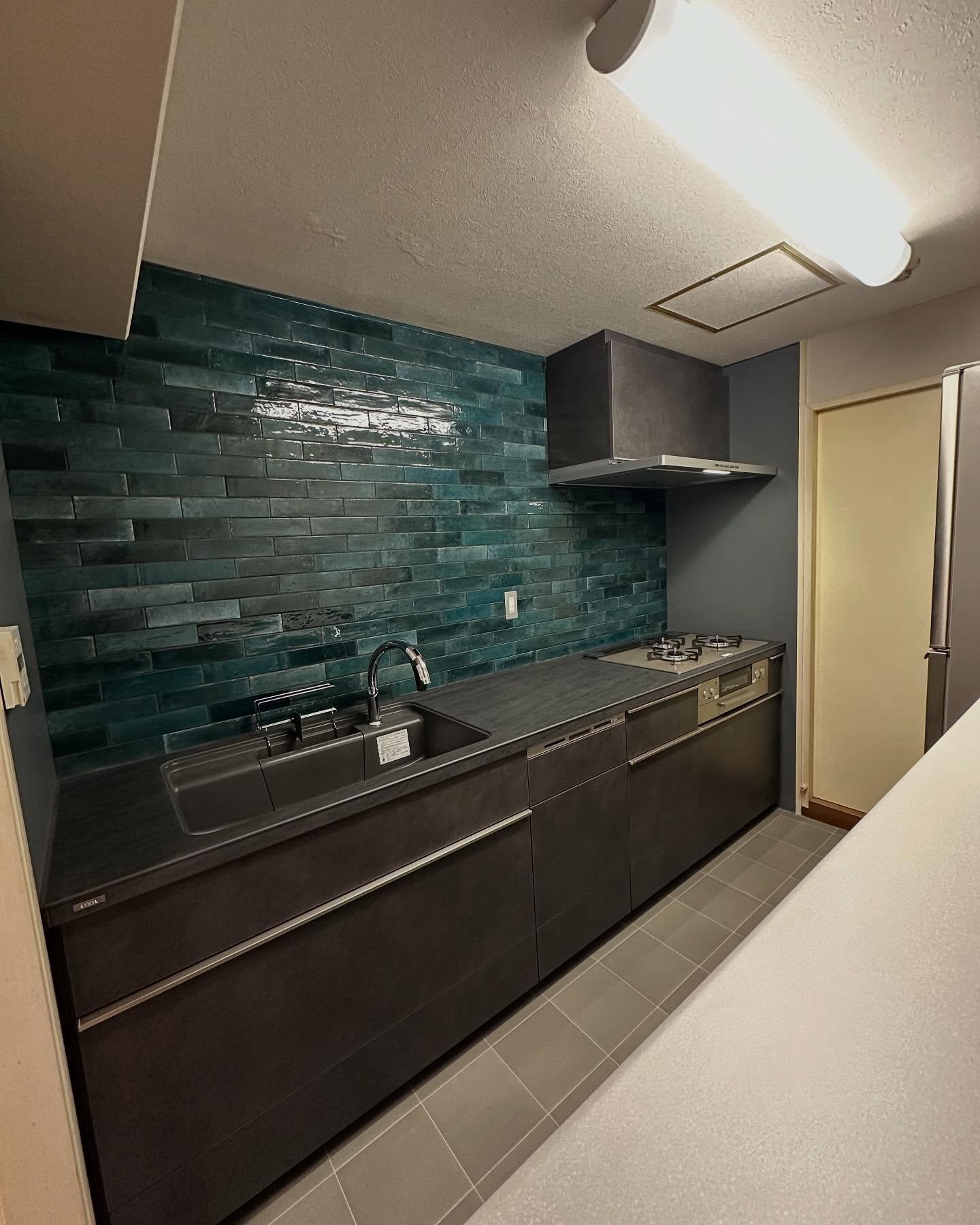 水回り全改装 キッチン交換・カップボード設置(LIXILリシェル) 深い海のような美しい名古屋モザイクタイル