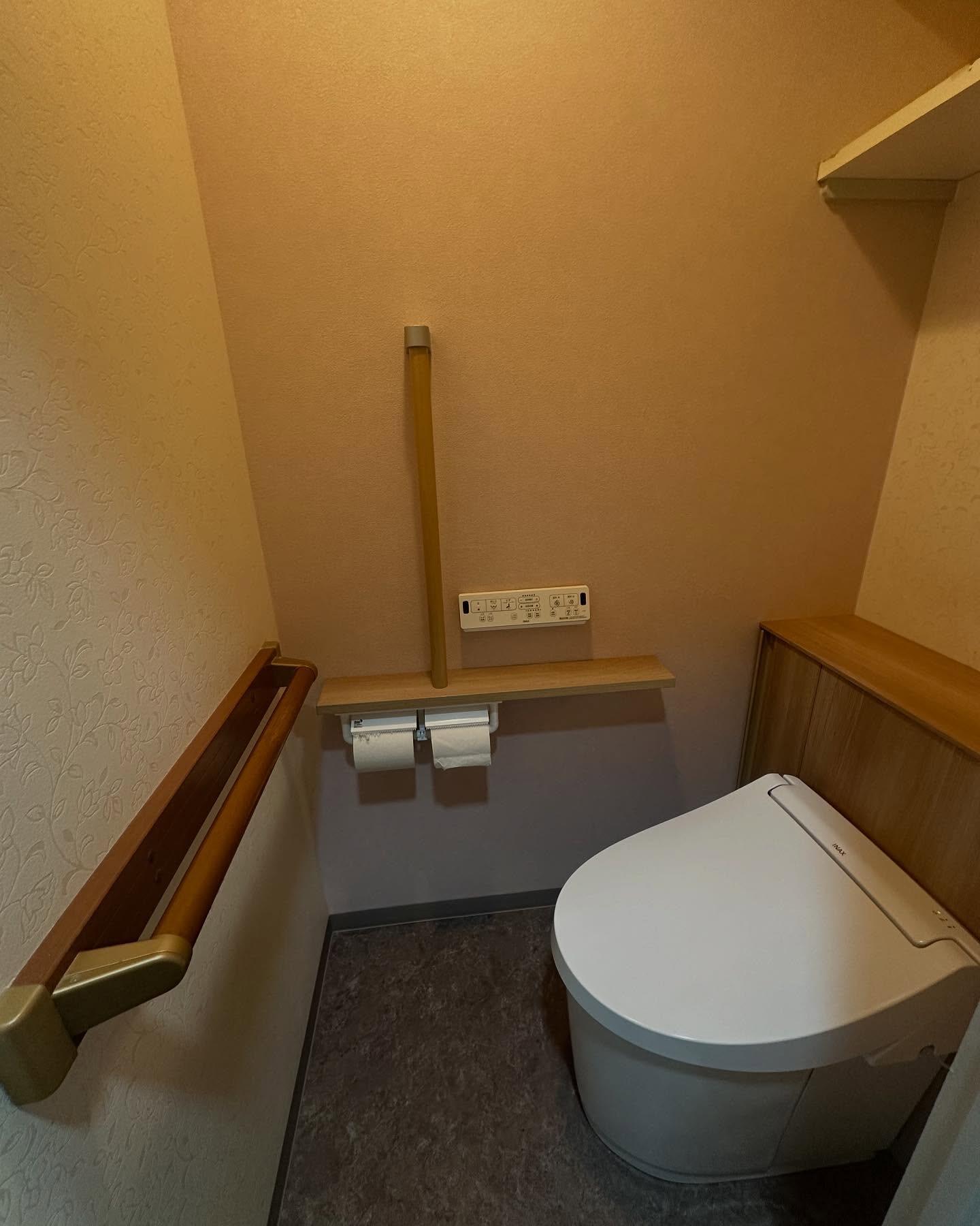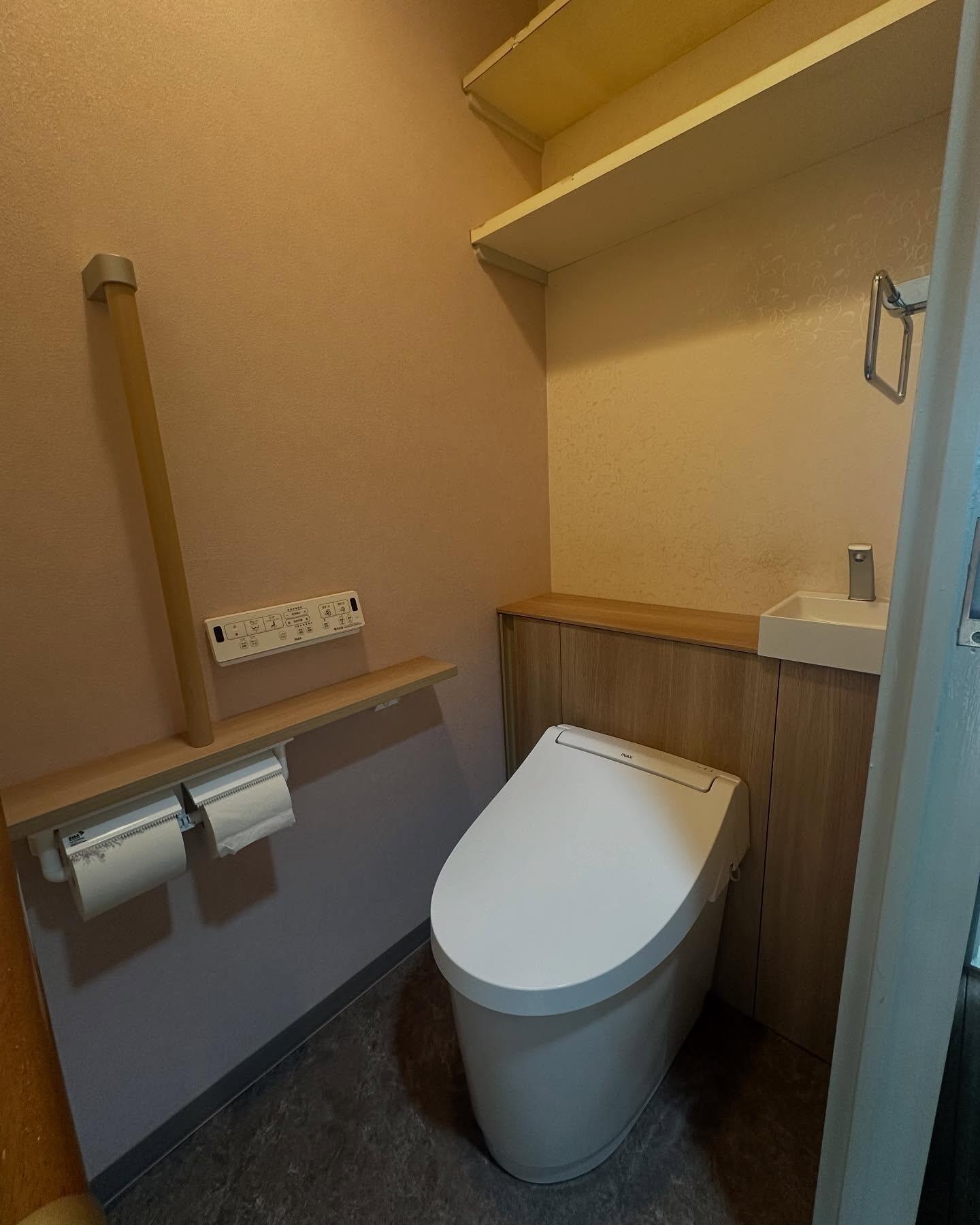 トイレ交換(LIXIL Jフィット) 掃除がし易い節水型トイレ キャビネットカラー:ライトオーク 紙巻器付き手すり 手すり下地設置 クロス1面貼り替え クッションフロア貼り替え(リリカラ) 1Dayリフォーム