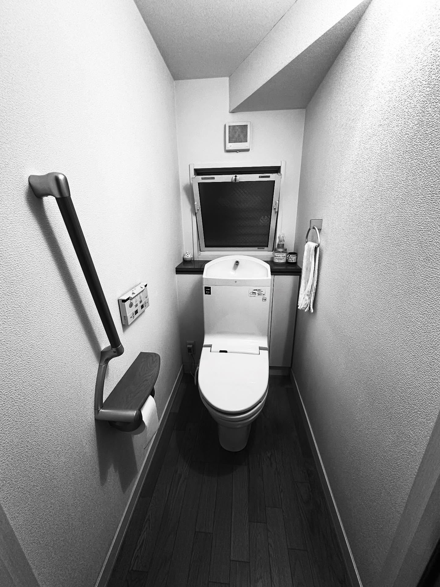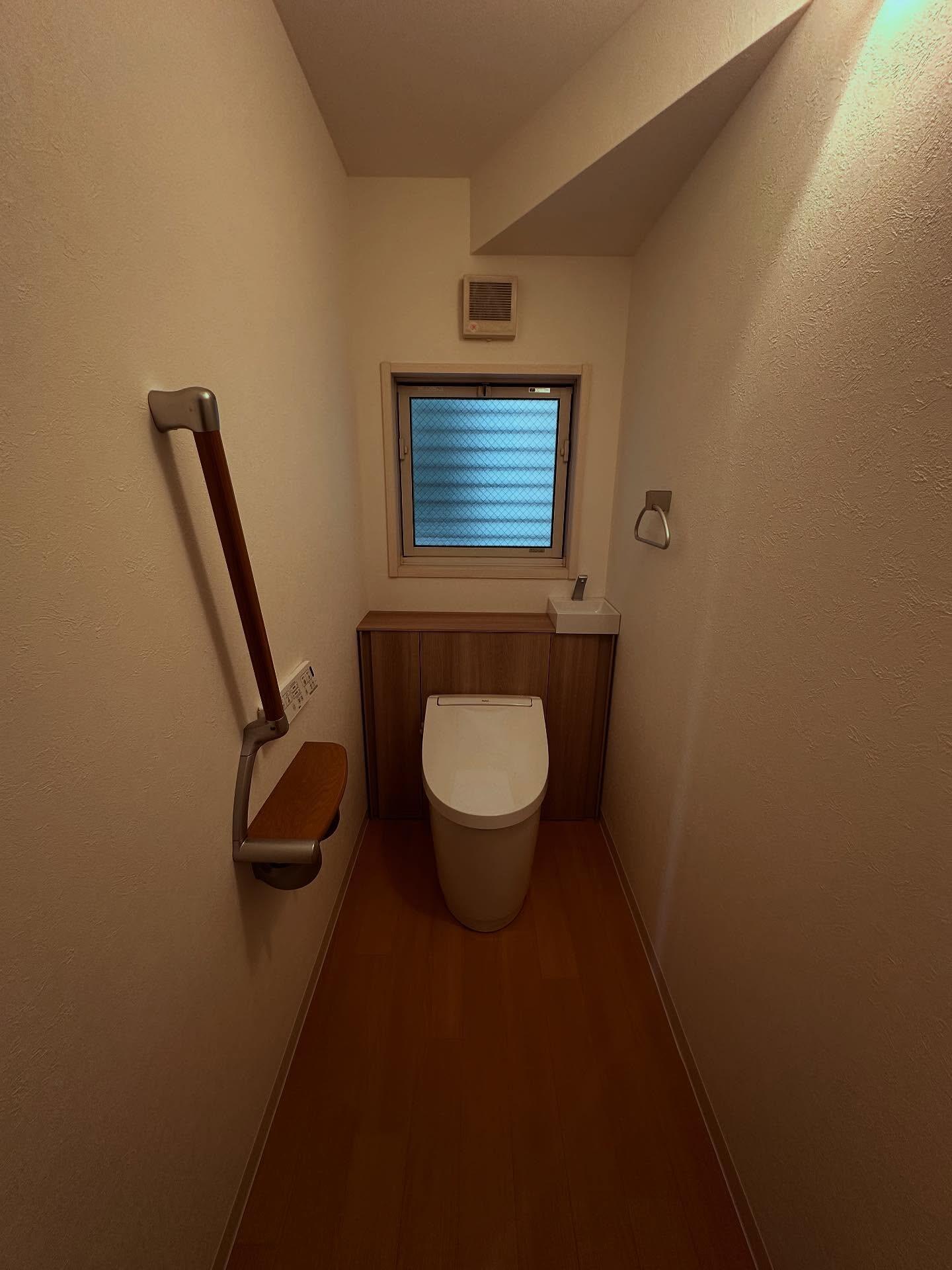 戸建トイレリフォーム LIXIL ジェイフィット 手すりタオル掛け再利用 内装貼り替え クロス貼り替え クッションフロア重ね貼り(リリカラ) アルミ見切り