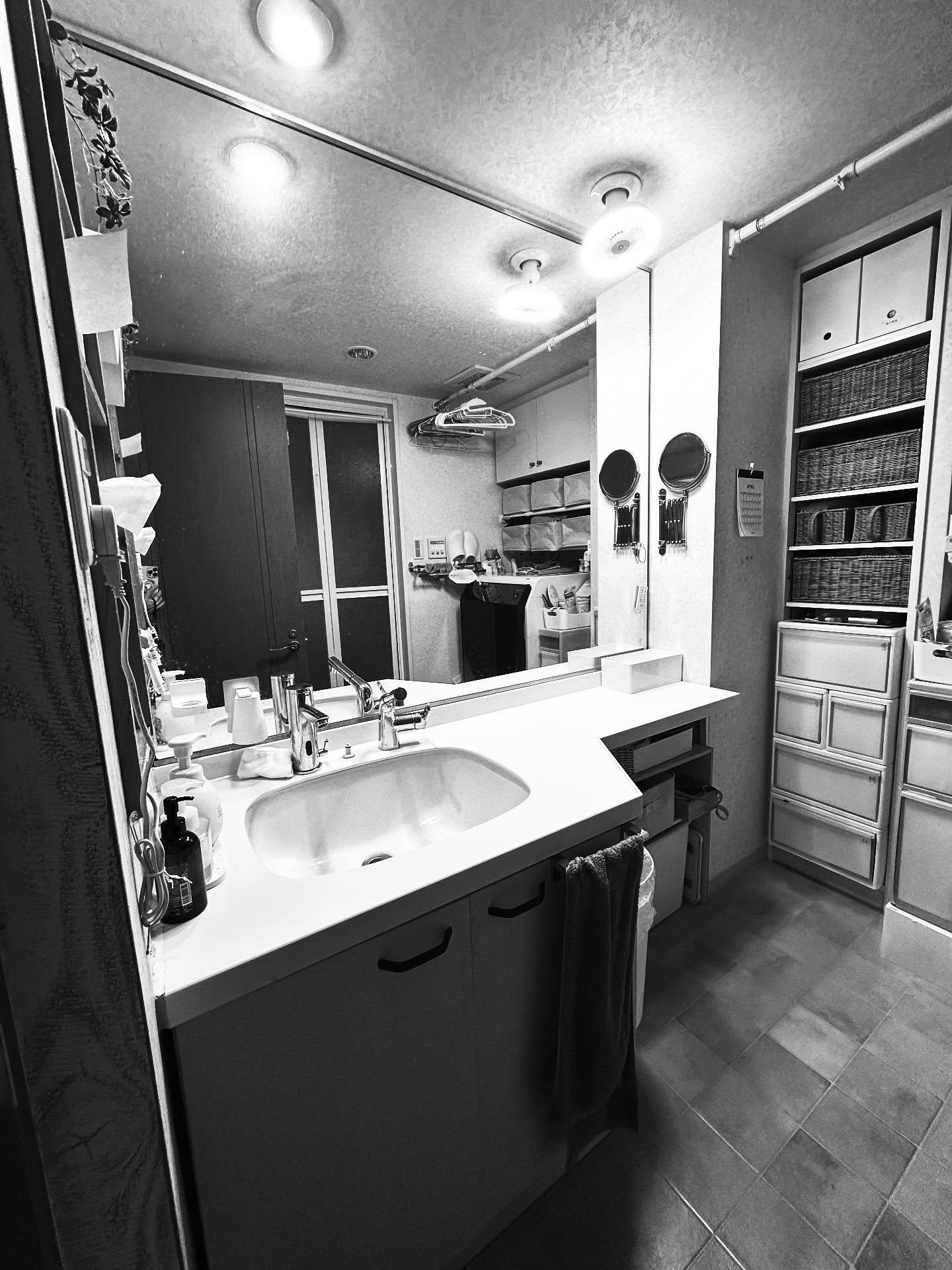 ・洗面 LIXILピアラ LIXILカスタムバニティミラー Panasonic耐水カウンター 造作埋め込み収納