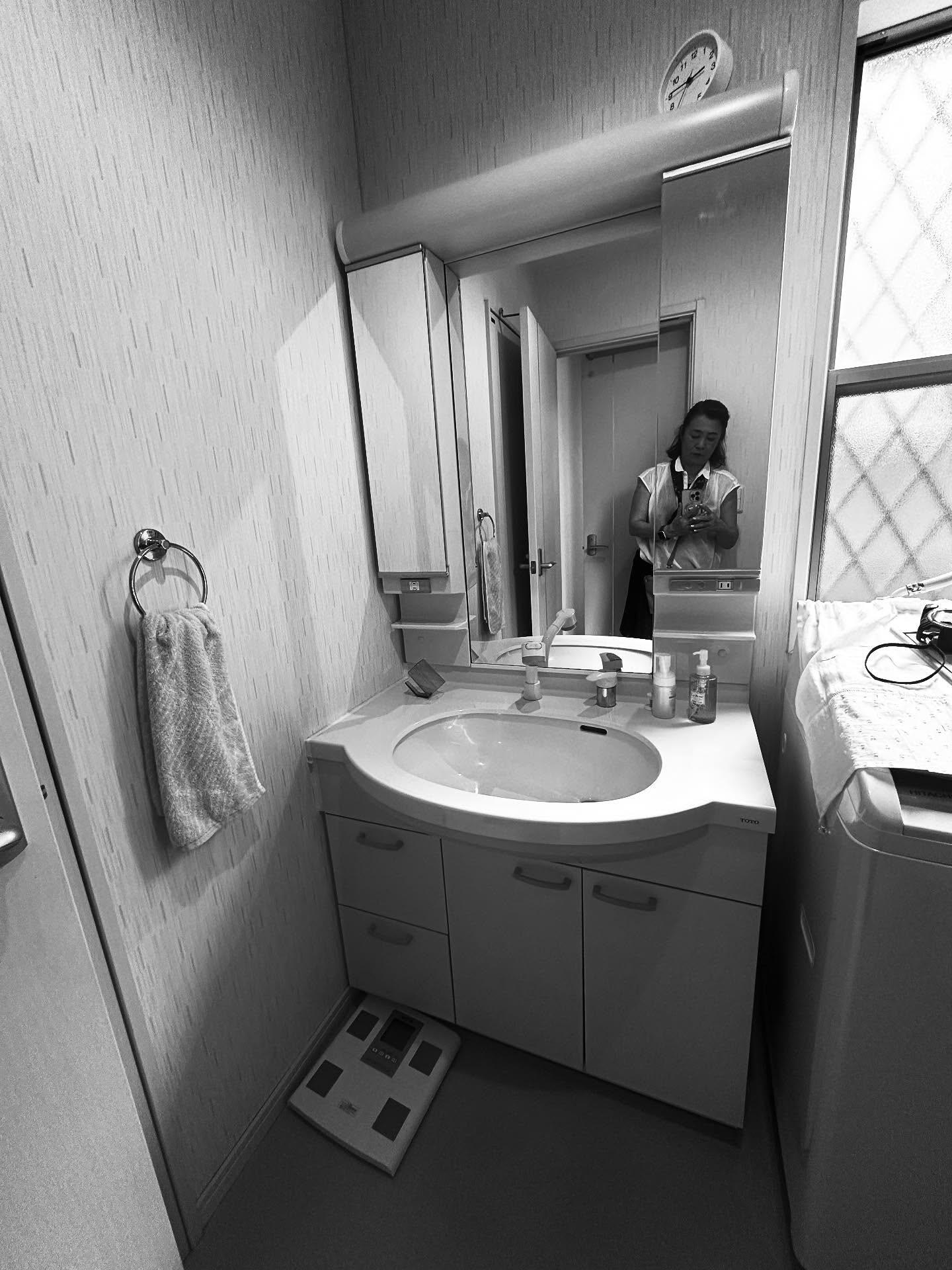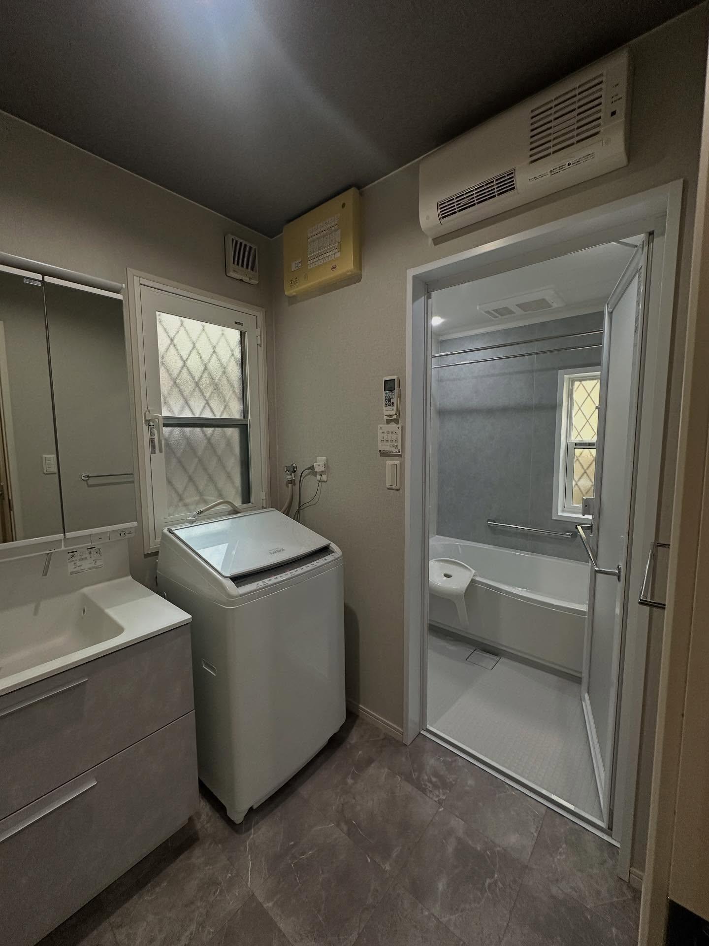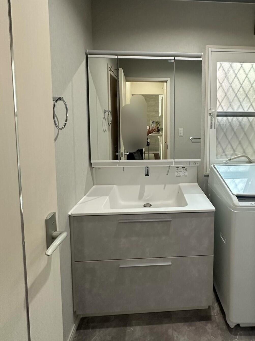 洗面台交換(LIXIL クレヴィ) 扉カラー:スタッコグレー フルスライドタイプ 内窓設置(LIXIL インプラス) 洗面脱衣所 暖房設置