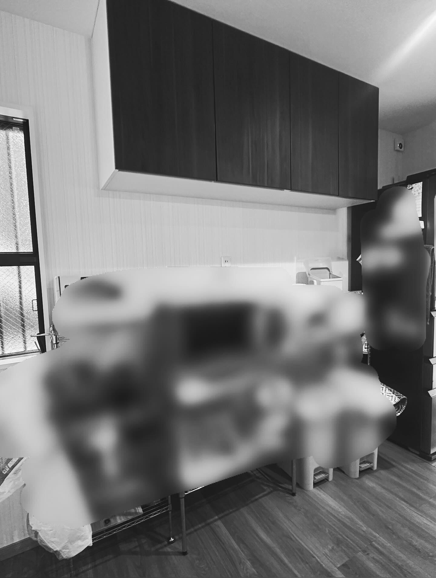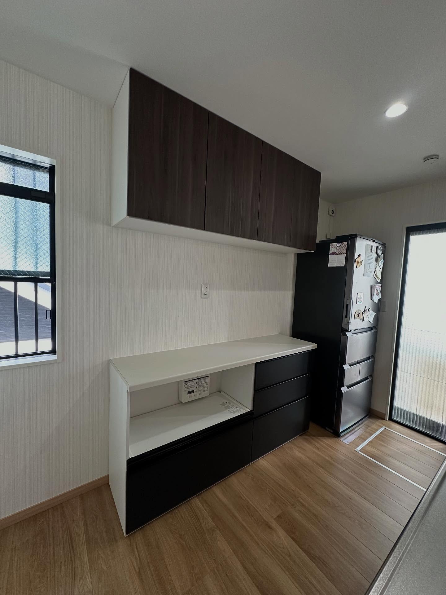 カップボード設置(LIXILシエラ) 1時間半のリフォーム 既設の吊戸棚とも違和感なく 家電収納の蒸気を自動で排出する機能付き 食器、キッチン家電、ストックなど…スッキリと収納