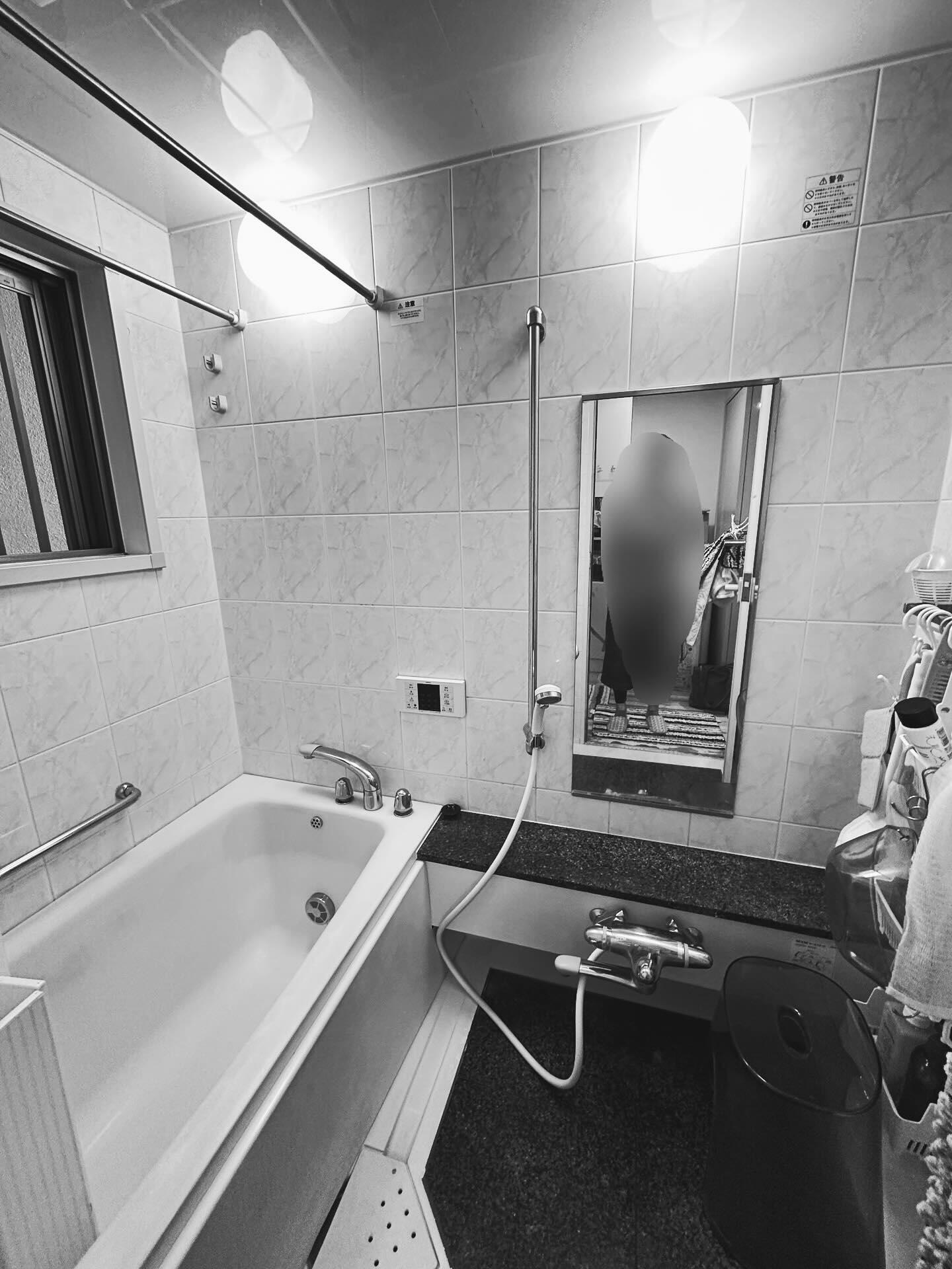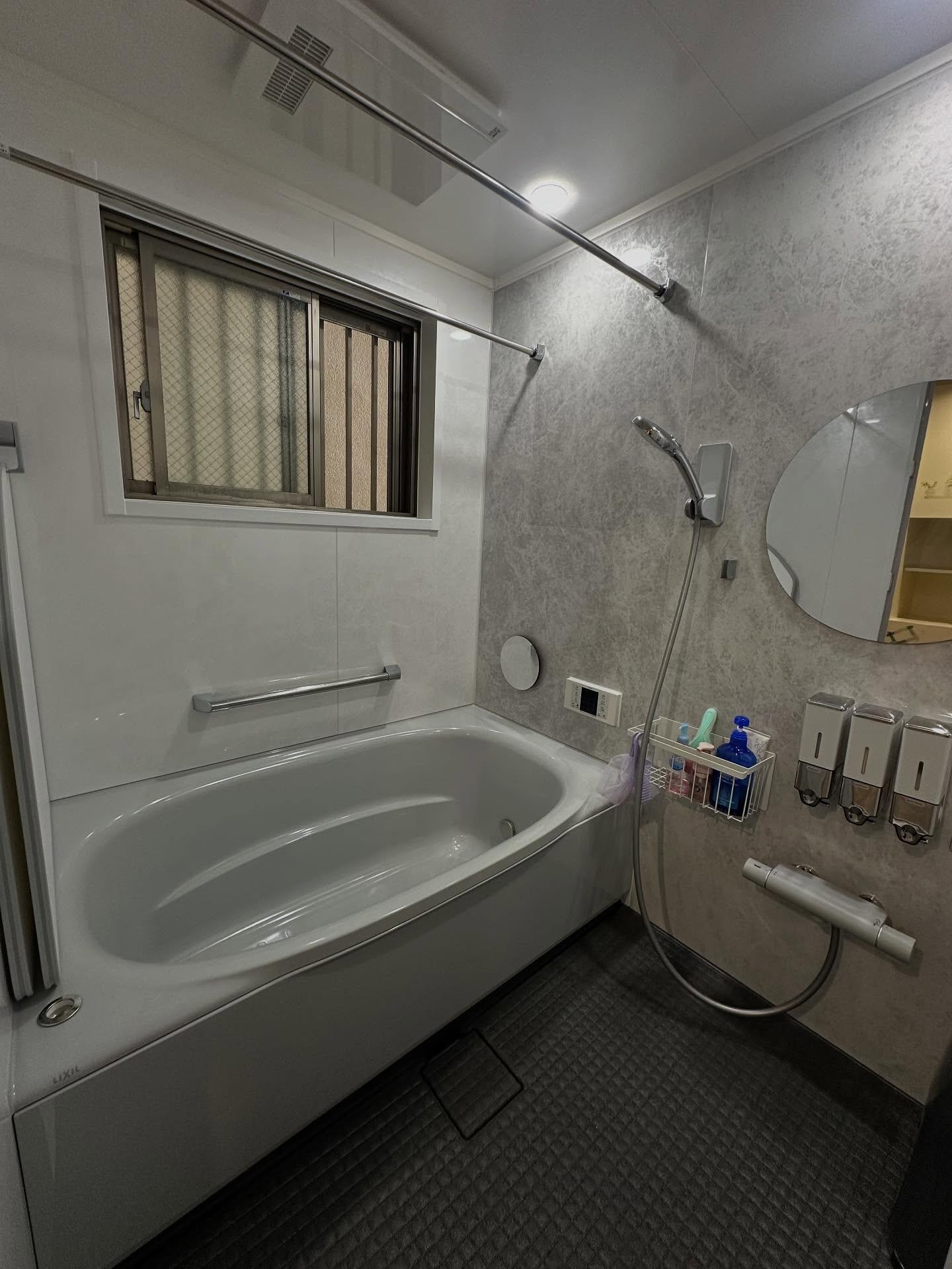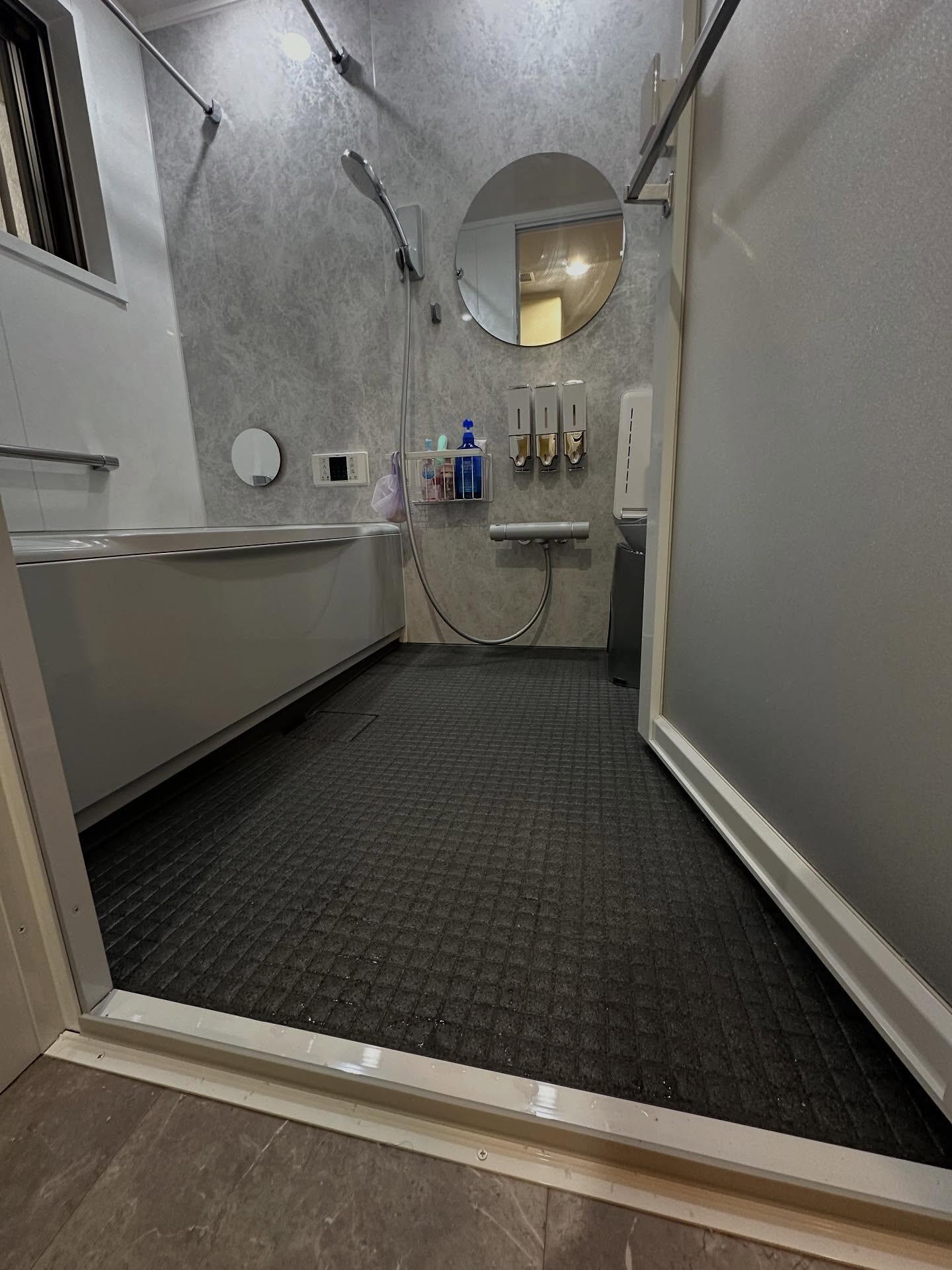 ユニットバス交換(LIXILリノビオV) アクセントパネル:ストーンシェルグレー ベースパネル:クルムホワイト マグネットラウンドミラー 床は汚れにくい表面処理と形状でお掃除らくらく 足元が冷やッとしないキレイサーモフロア