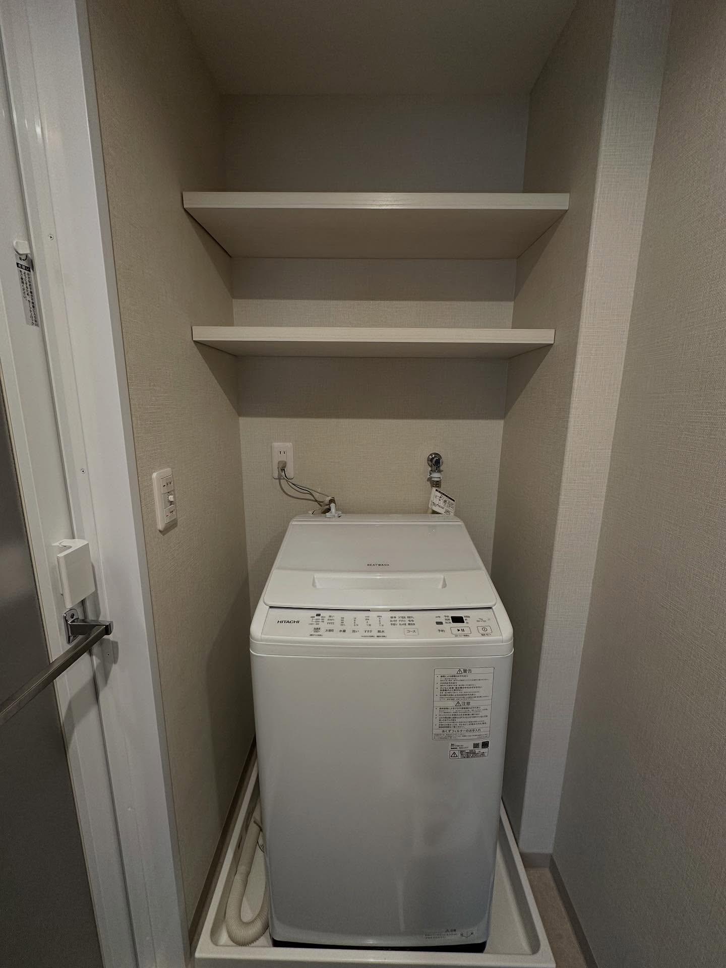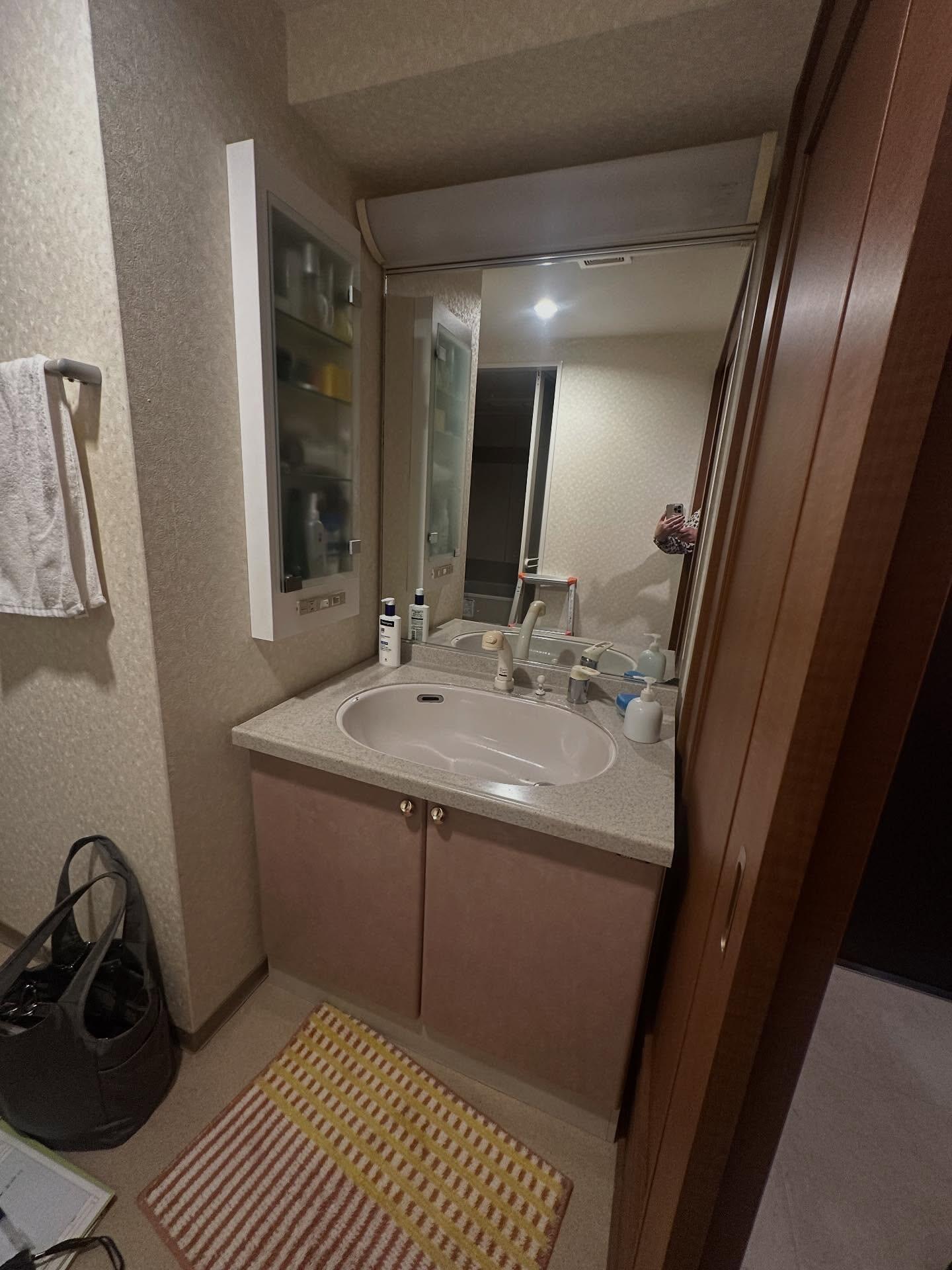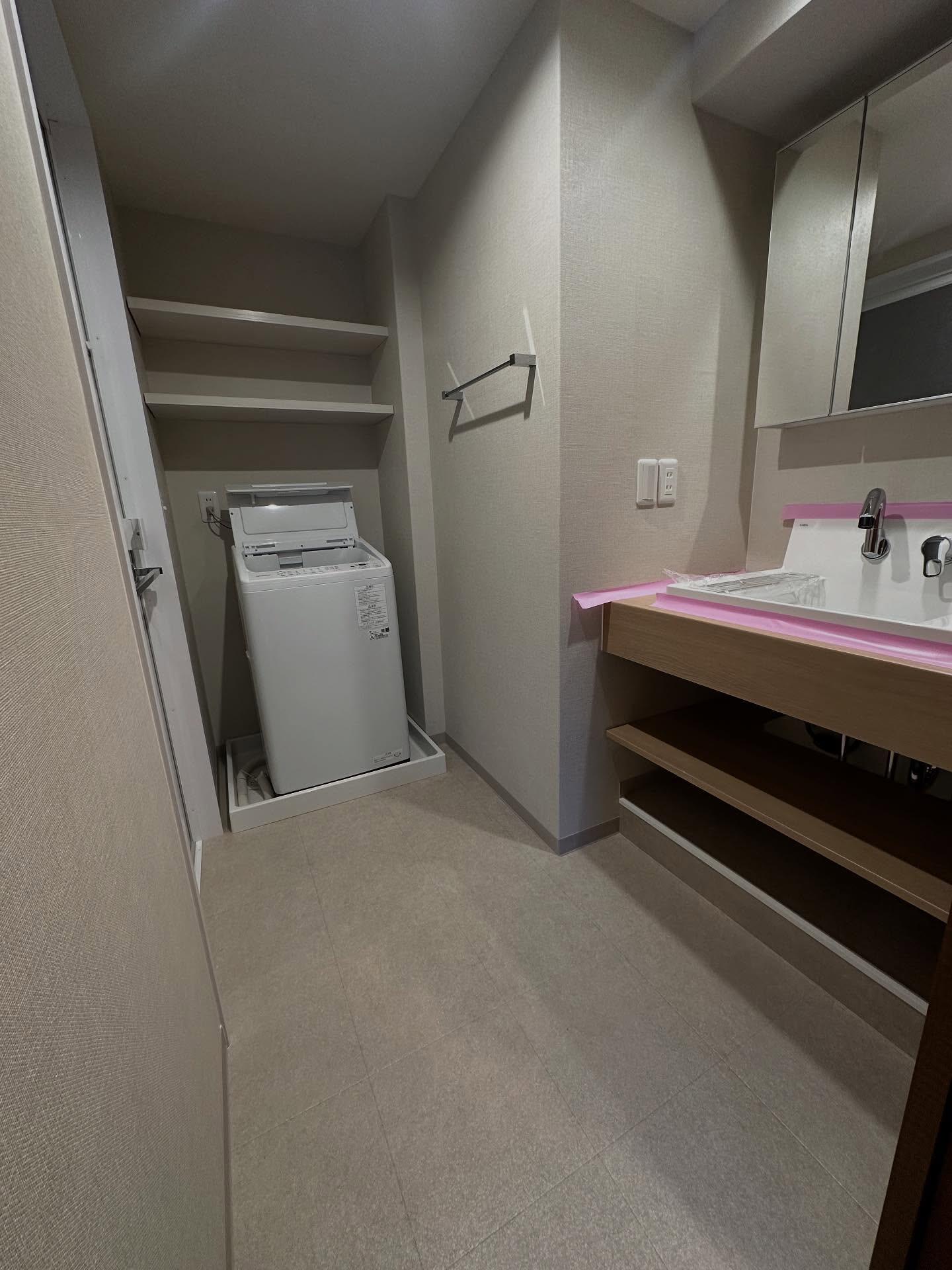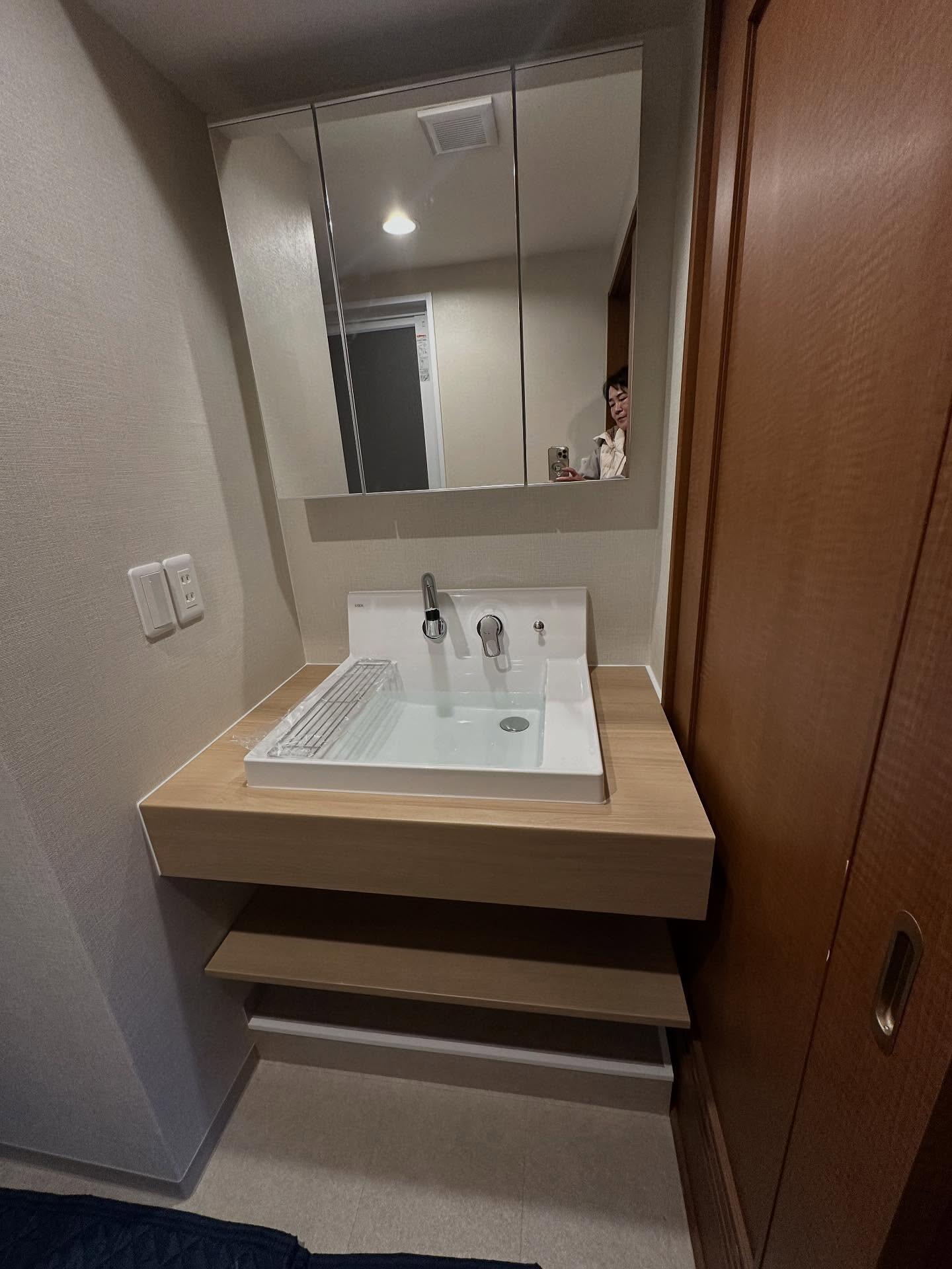 洗面化粧台交換(LIXILカスタムバニティ) カウンター下棚カラー:クリエオーク 底が広くて大容量のハイバックひろびろボウル 洗濯機上に固定棚(LIXIL一枚棚) 内装貼り替え(リリカラ)