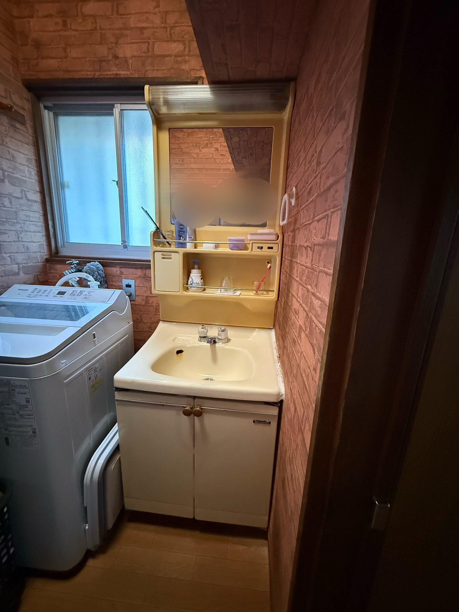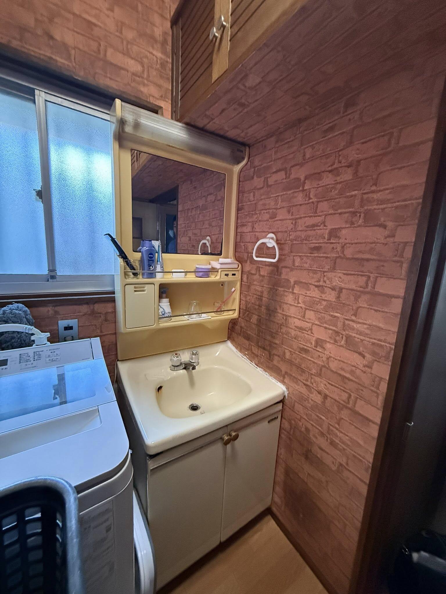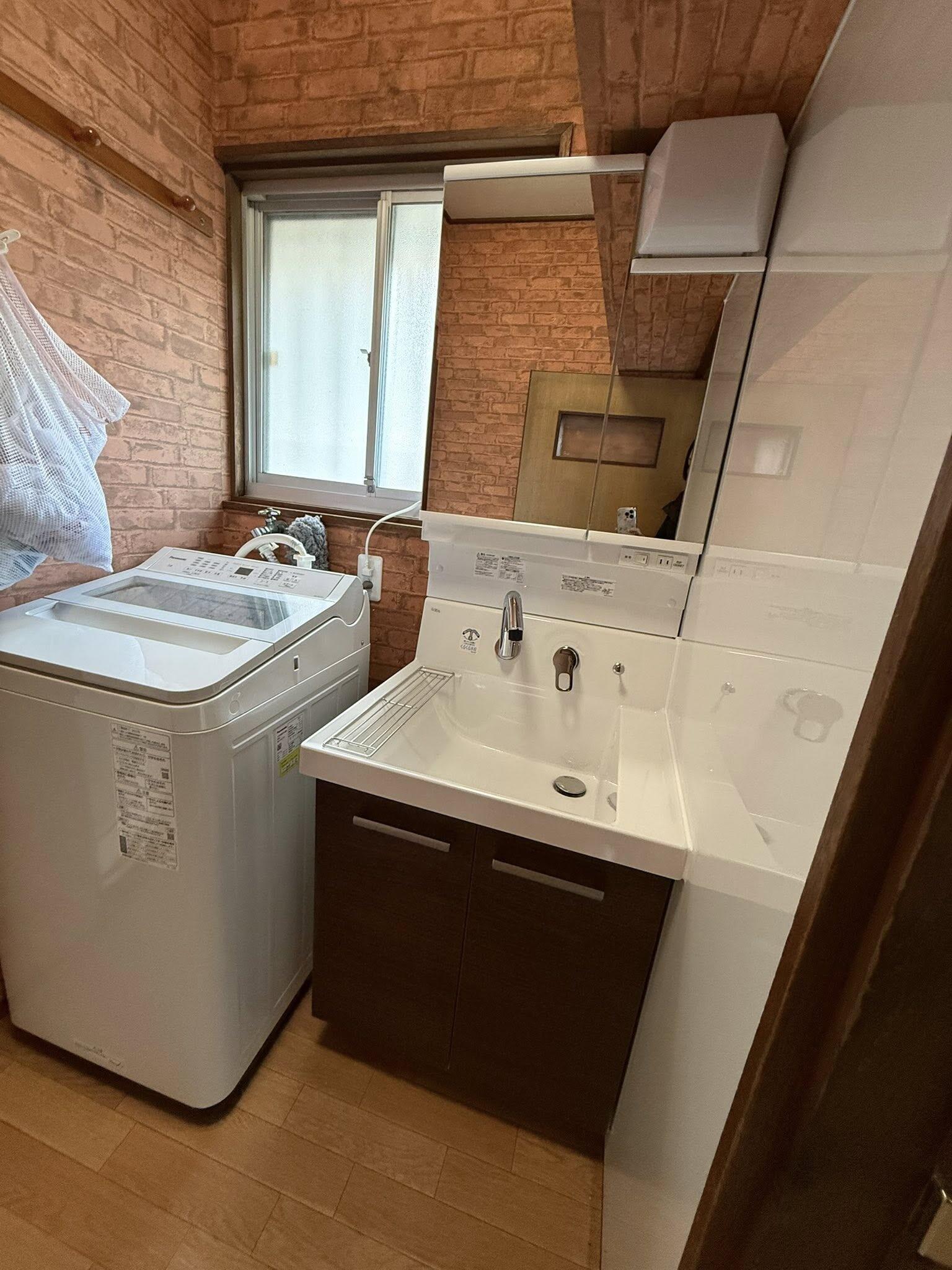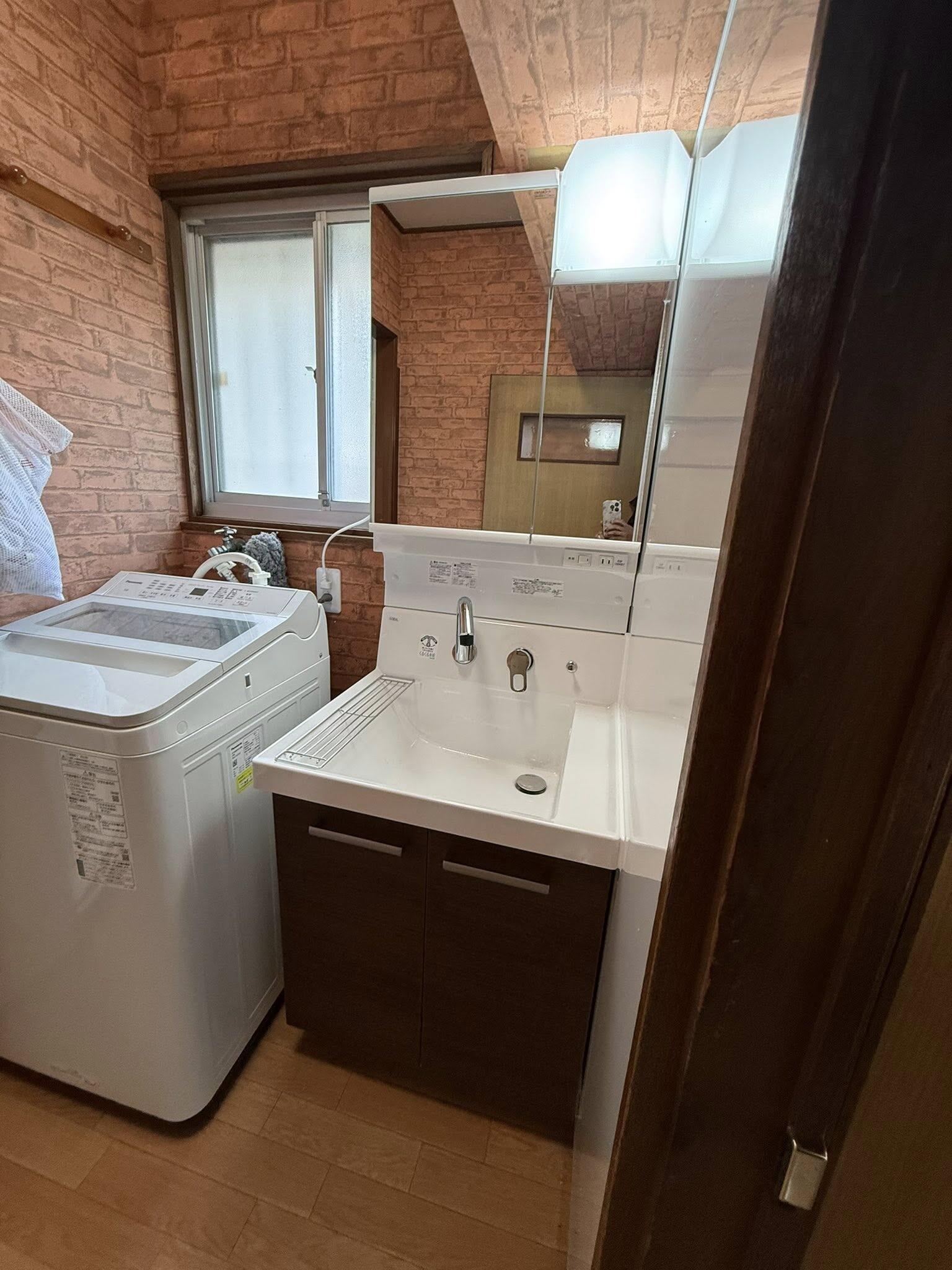洗面化粧台交換(LIXILクレヴィ) 扉カラー:ショコラオーク 1Dayリフォーム 壁面にマグネットパネルを設置 防汚効果の上、お掃除も楽々! さらにマグネット収納の使用など、使い方が広がります