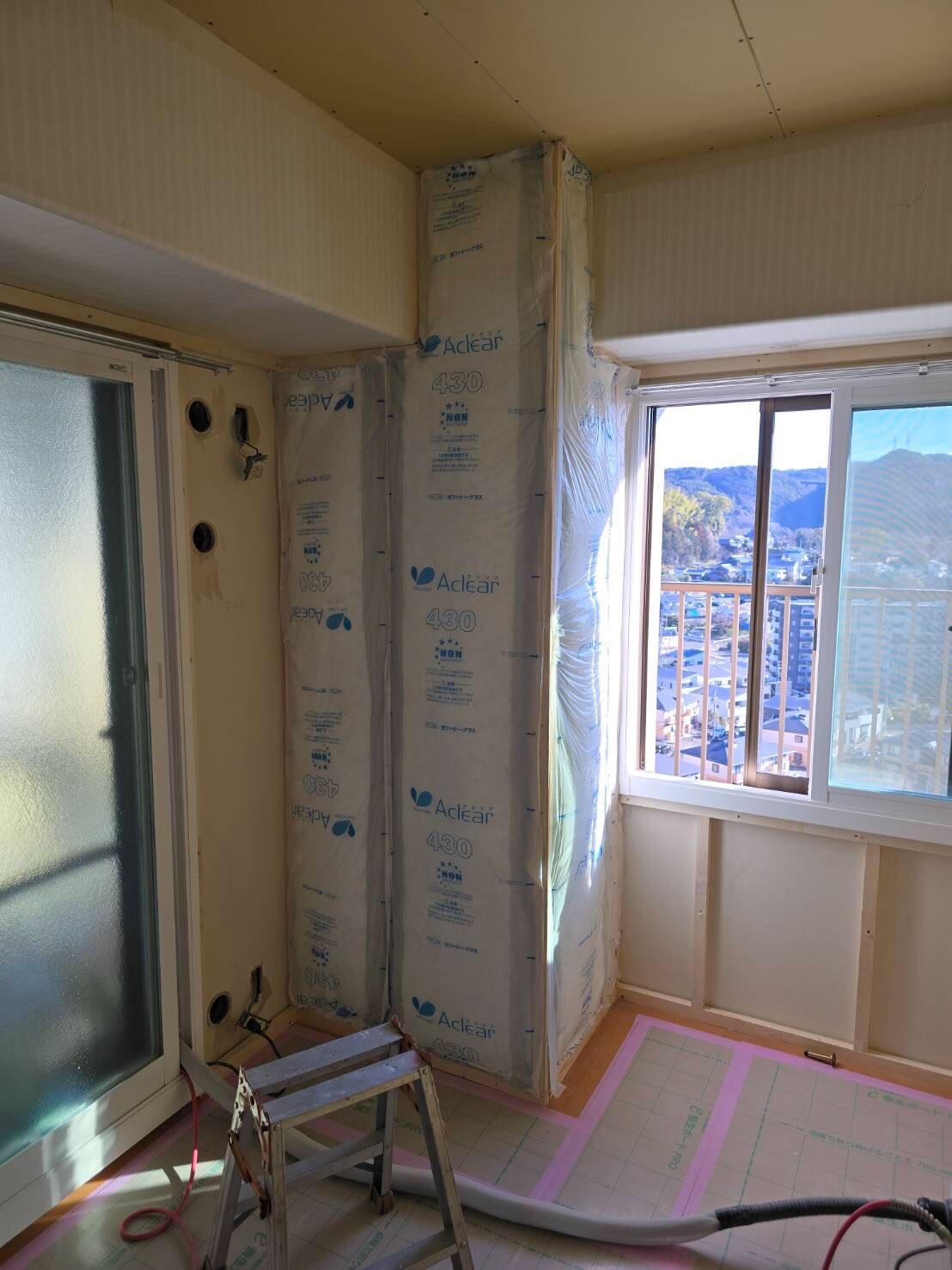 マンションの断熱防音 壁・天井ふかしグラスウール充填 窓、内窓設置(LIXILインプラス) クロス貼り替え(リリカラ)