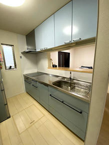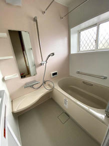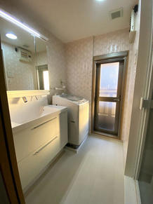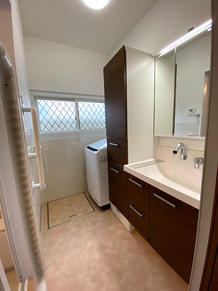 ユニットバスに色合いを合わせて清潔感あふれる洗面所