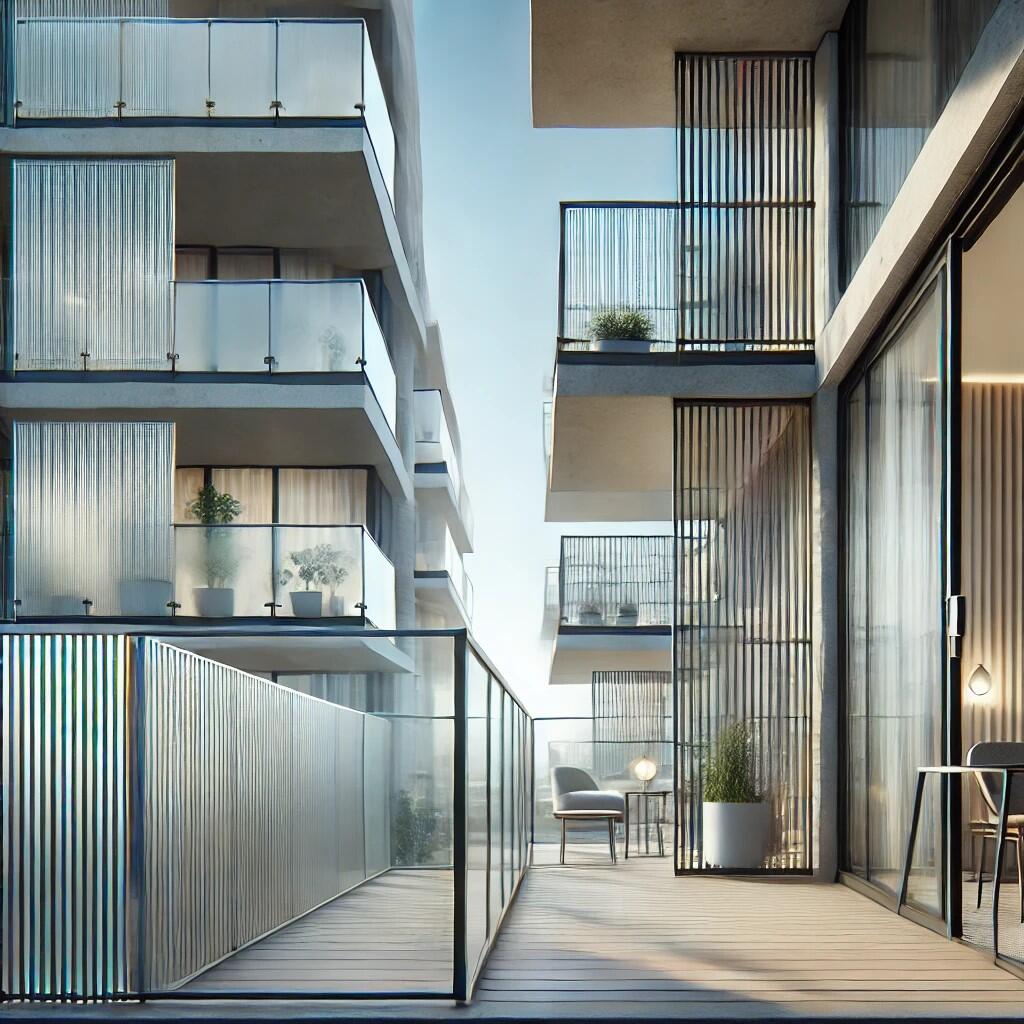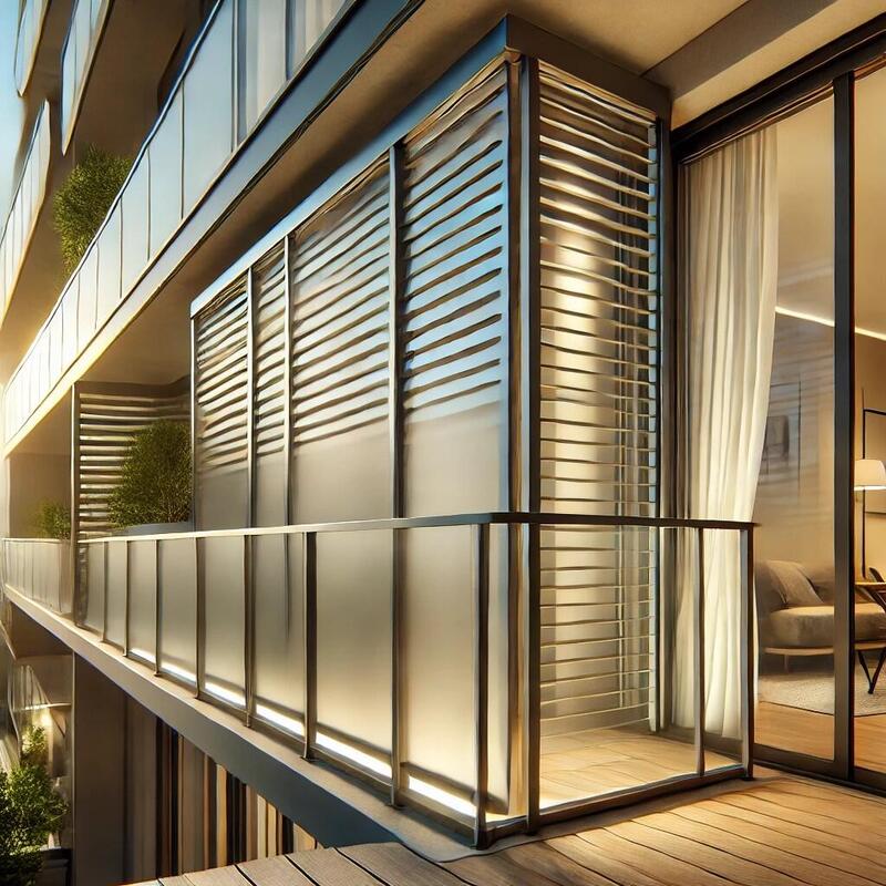 バルコニーは開放的な空間である一方で、周囲からの視線が気になることもあります。住宅密集地では、すりガラスやポリカーボネート製の半透明パネルを採用することで、プライバシーを確保しながら採光を確保できます。また、ルーバータイプの手すりは、風通しを確保しつつ、視線を遮るのに最適です。