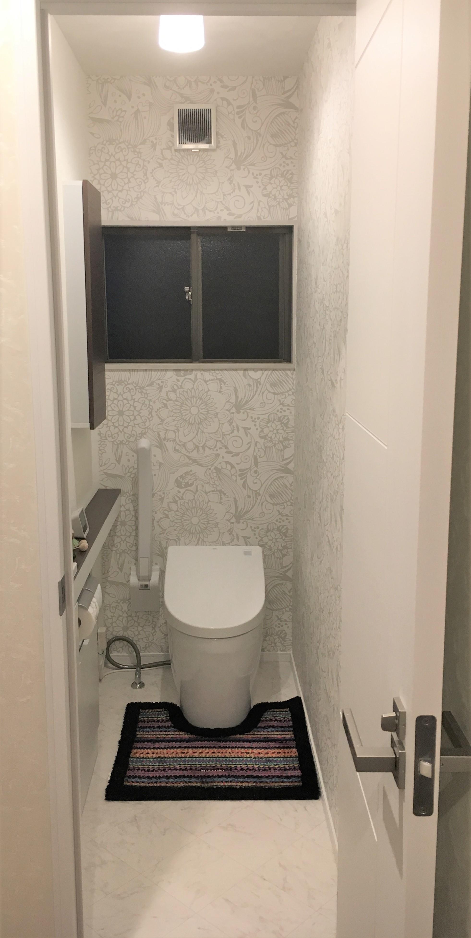 そこで新しいトイレにはタンクレスタイプを選択、手洗いを別にして出入口横に設置しました。手洗いを壁に埋め込む事でリフォーム前のスペースを確保しつつ、手洗い時の姿勢の問題をクリアしました。また、便器横に可動式のひじ掛けを設置して、立ち上がる際の不便さも解消しました。