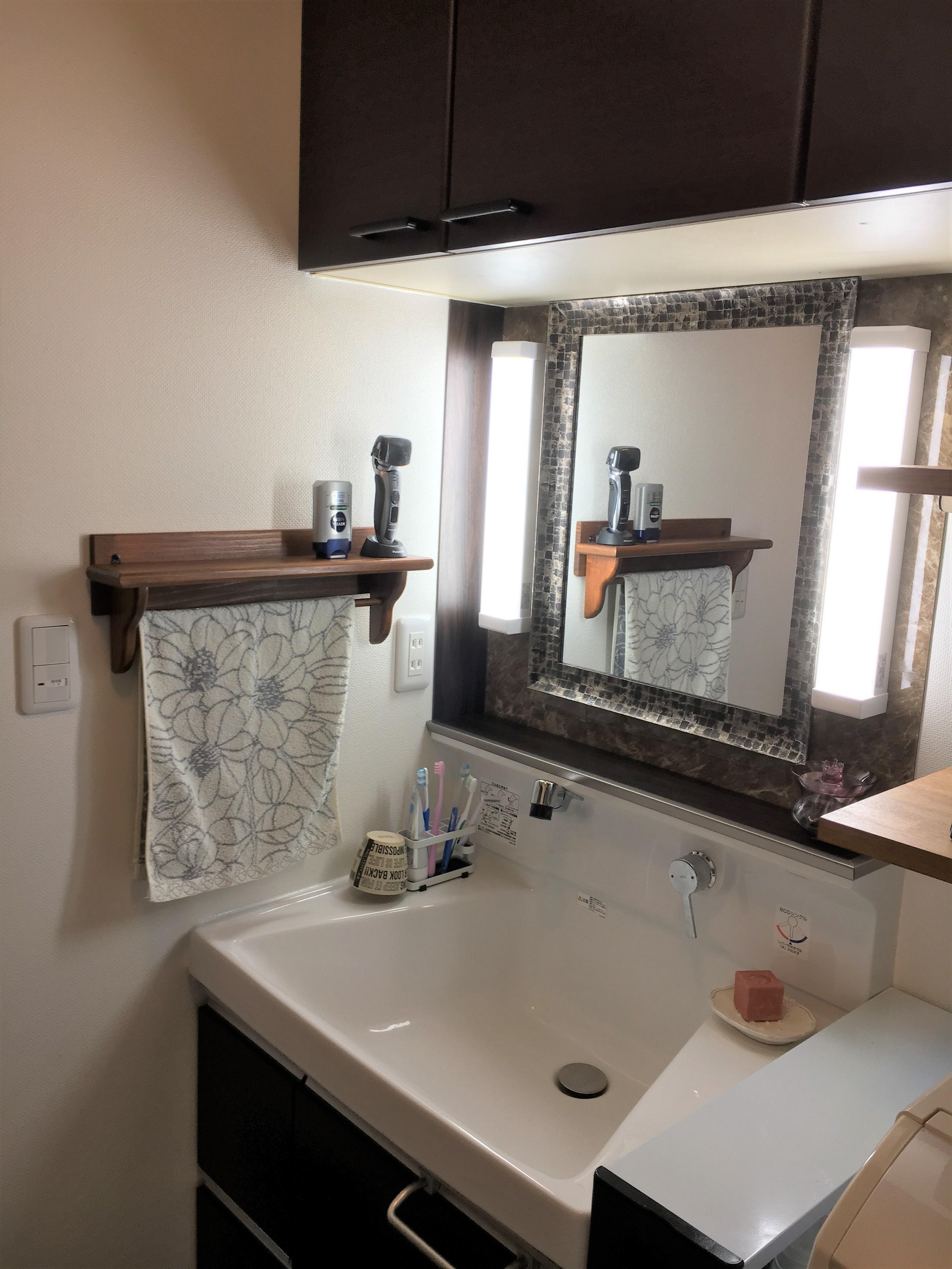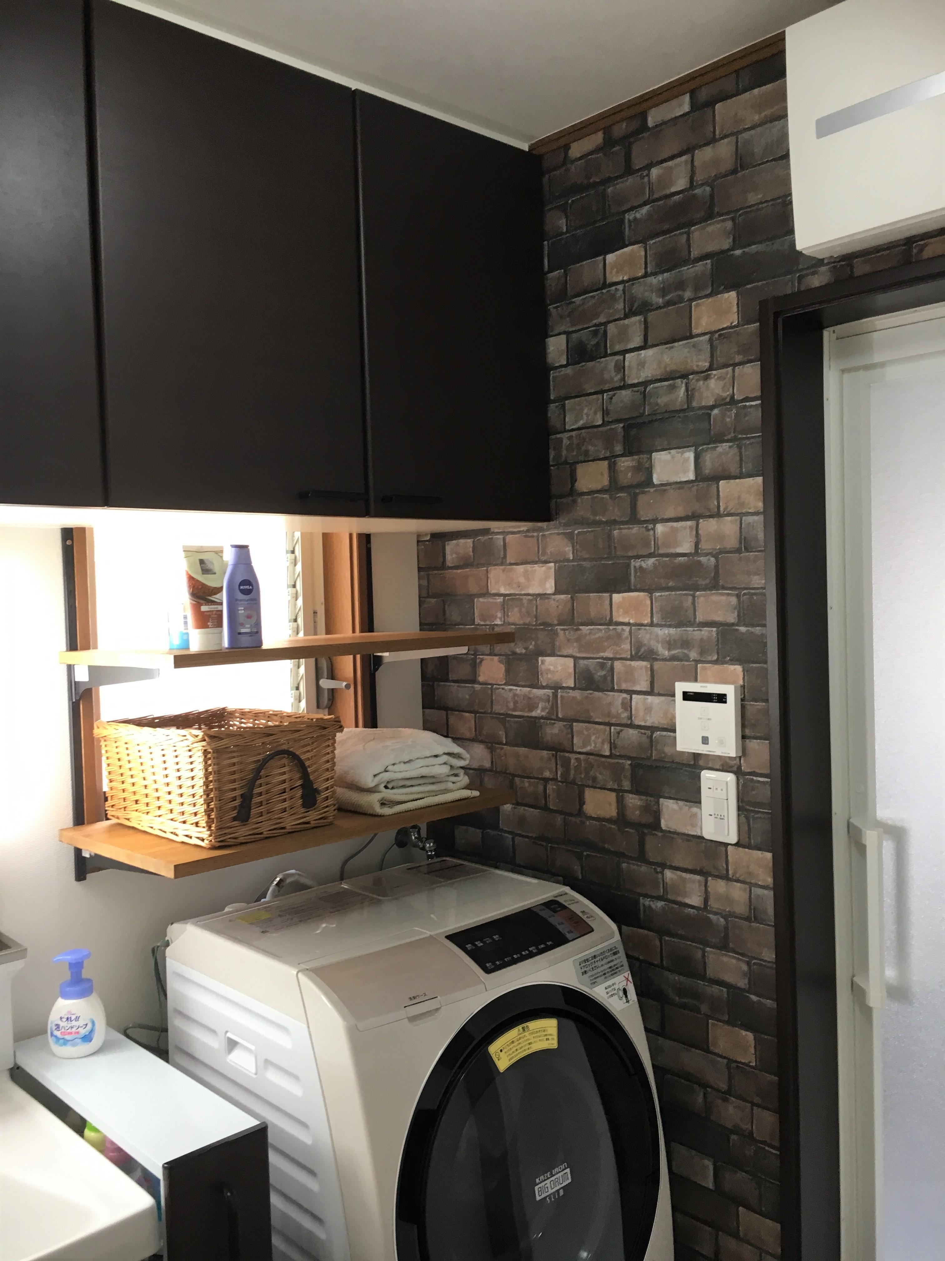 奥様からは日々の使い勝手を良くしたいというお話だったので、キャビネットをつけて収納を増やし、洗濯機の上には可動式の棚を設置して色々なシーンに合わせて高さを変更出来るようにしました。また、家族が多いので足ふきマットとタオルをかけられる場所も欲しいとおっしゃってたので、壁のスペースを開口しタオル掛けも設置しました。