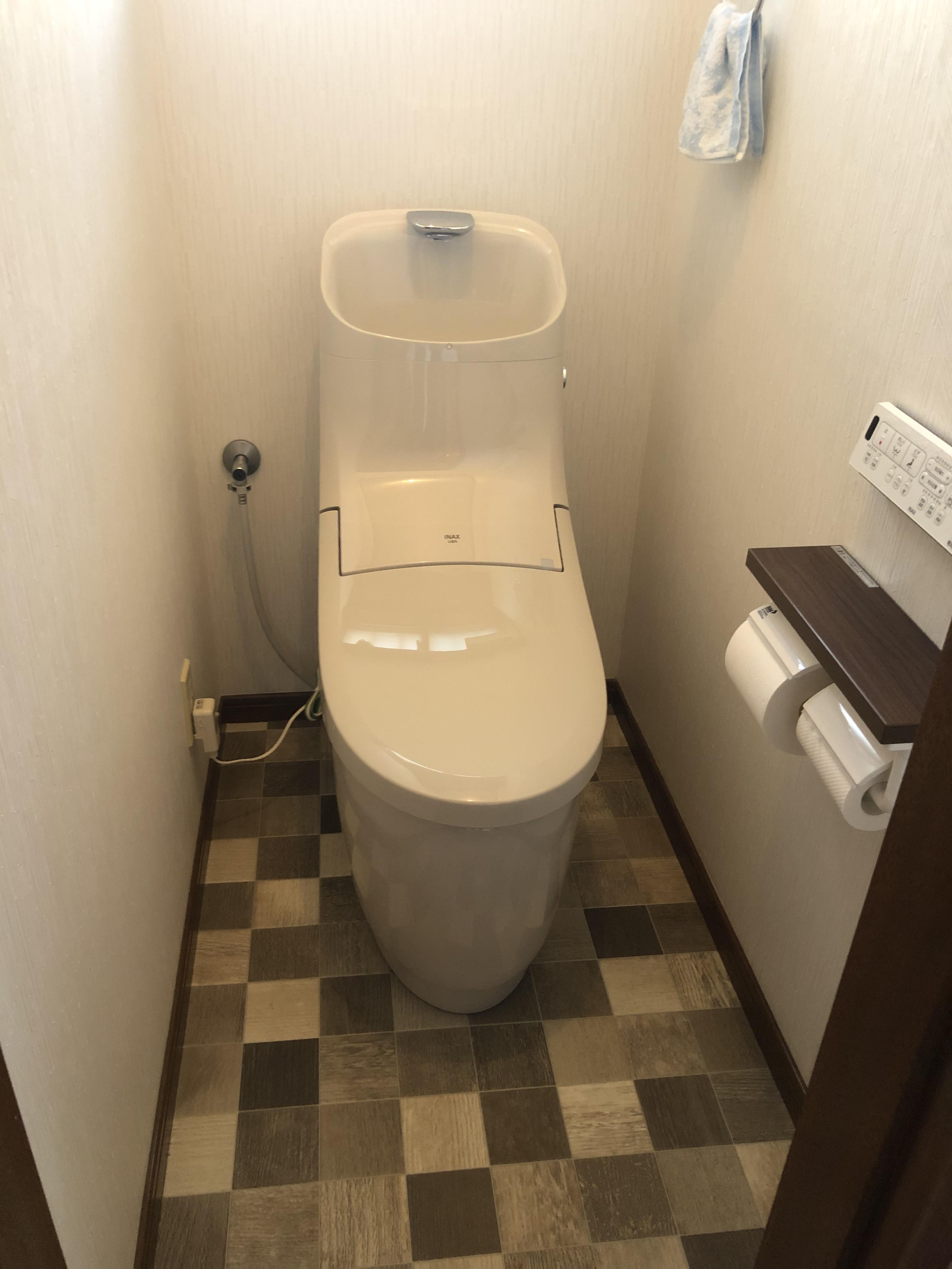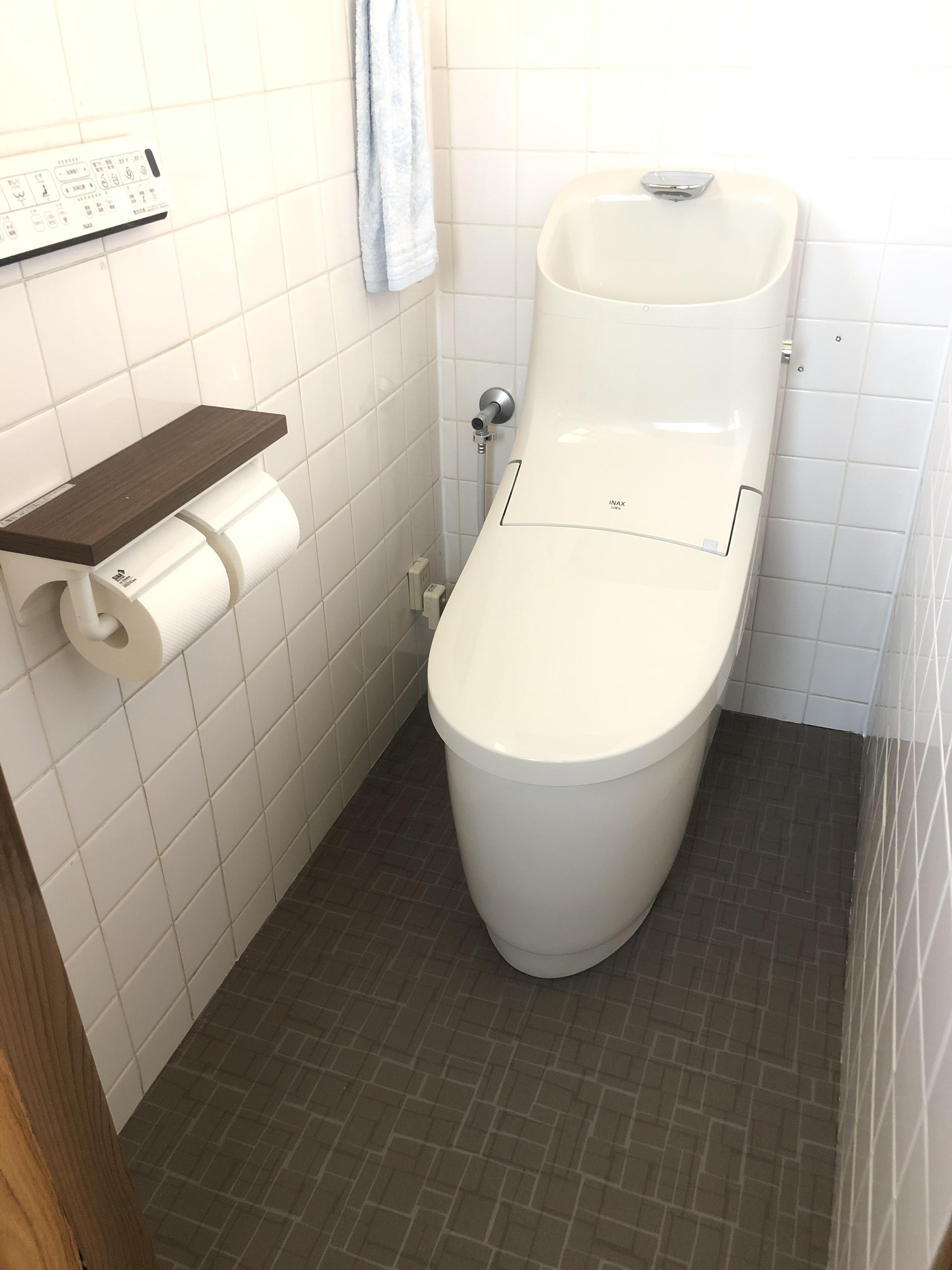 2Fのトイレに関しては「タイルはお掃除しやすいのよ!」と奥様がおっしゃっていましたので、タイルは残しつつトイレと床の交換になりました。シンプルなタイルを活かして、すっきりとした仕上がりにさせていただきました。
