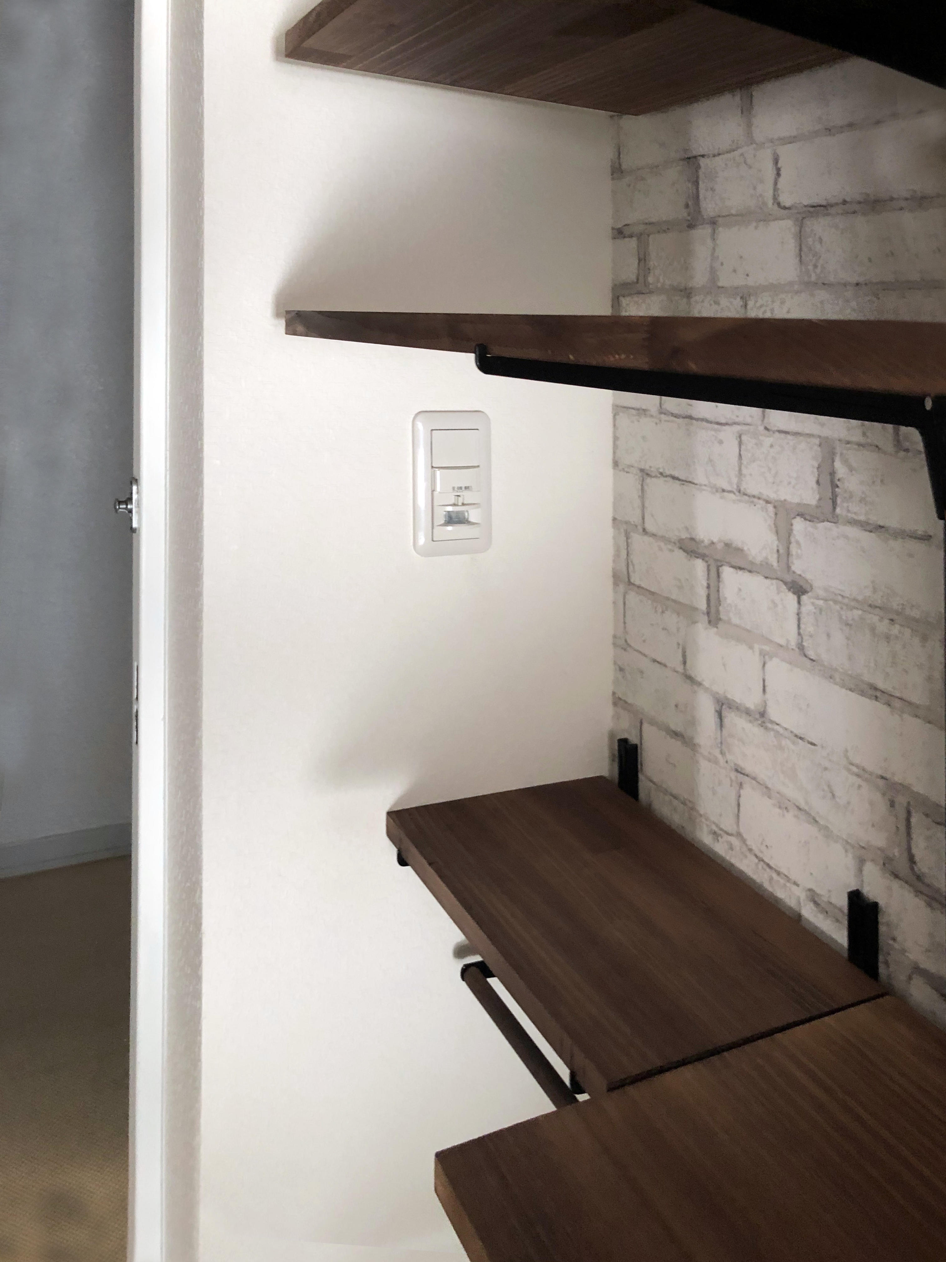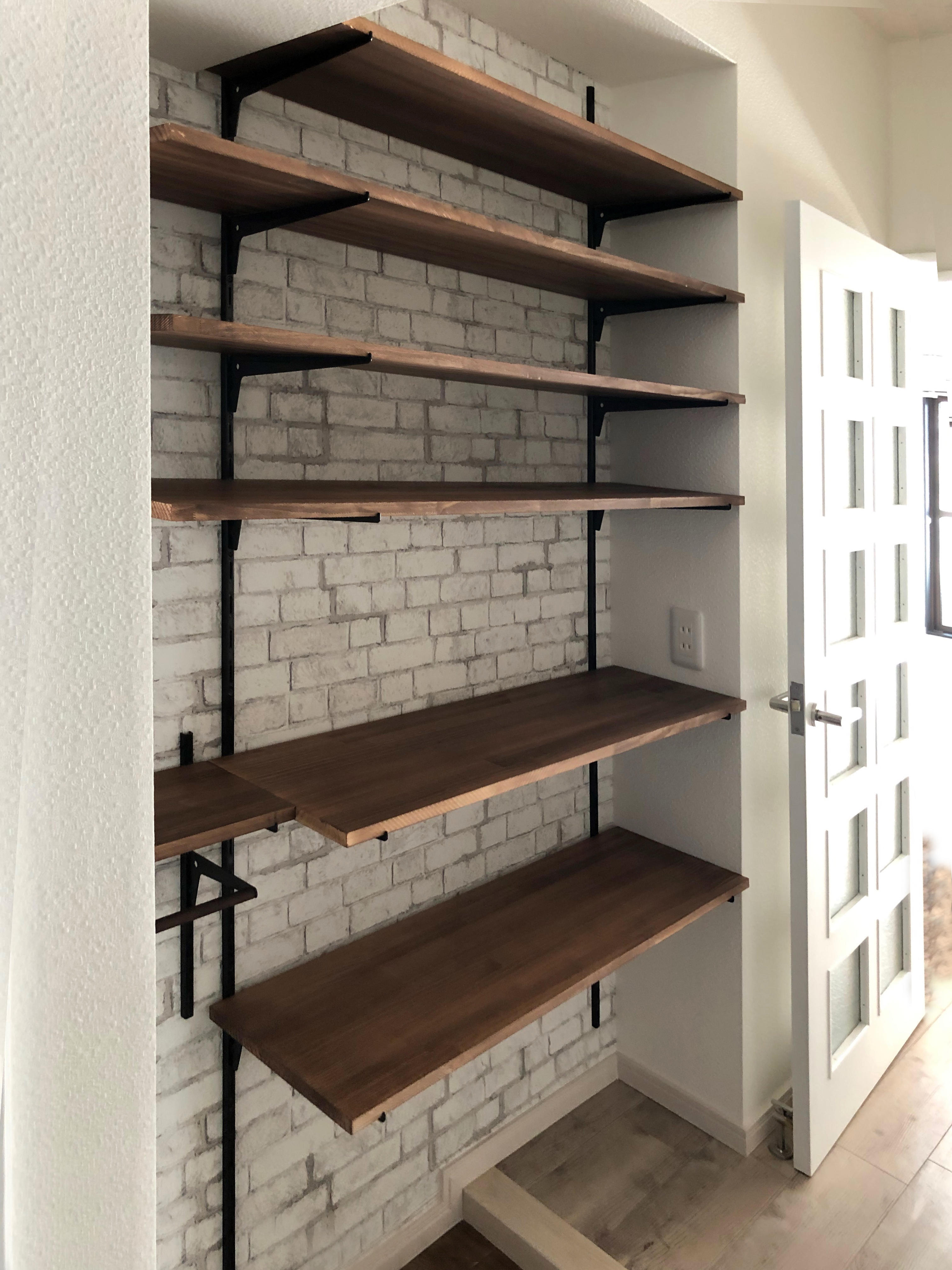 収納が少ない玄関だったので、オープンな可動式の棚を設置してどんな高さのものも収納できるようにリフォームしました。傘もかけられる様に、バーもつけてあります。 暗い印象もあったので、クロスも替えて明るい雰囲気に仕上げました。