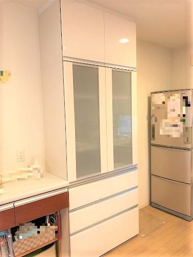 天井までのトールタイプをご希望でしたが、既存のキッチンと同色の扉カラーがない為、ホワイトをご提案。シンプルなデザインが、周囲のキッチンや家具にも馴染みました。