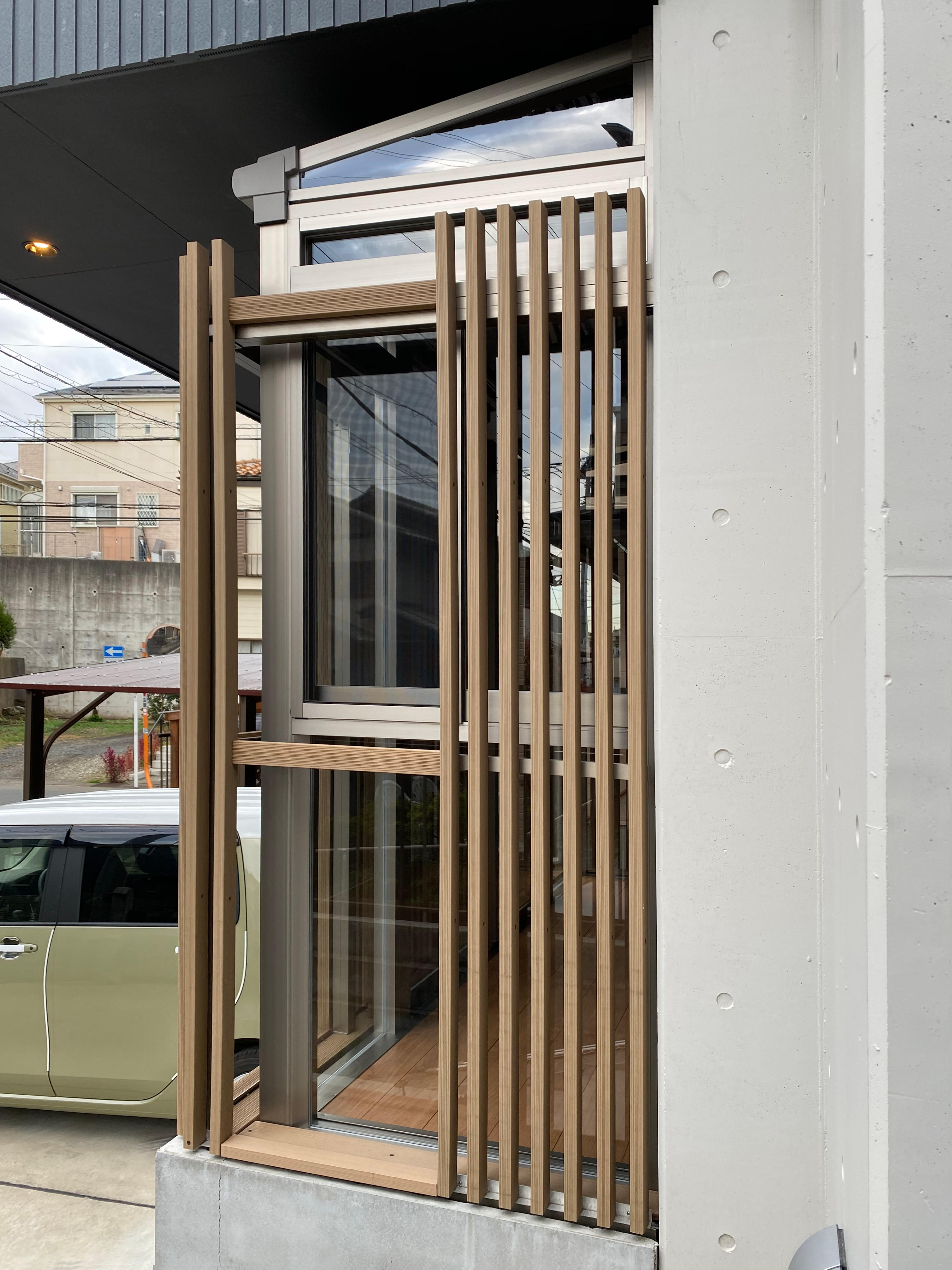 そこで、おしゃれな格子は残しつつ格子内にサンルームを設置。夏の虫や気温だけでなく、花粉も気にせず洗濯物を干せるようになりました。風を取り込みやすい開口部になっているので洗濯物も乾きやすく、物干し空間の快適性が大幅に向上しました!